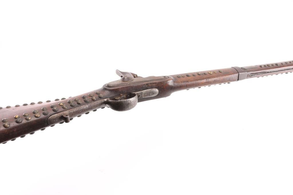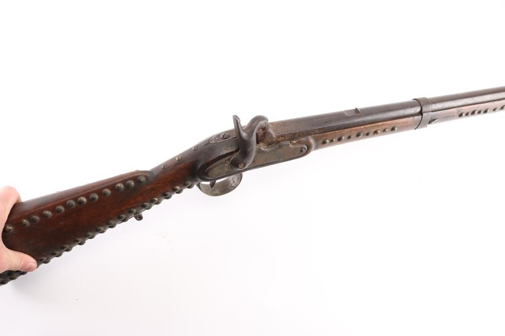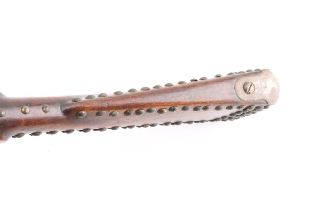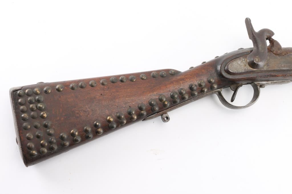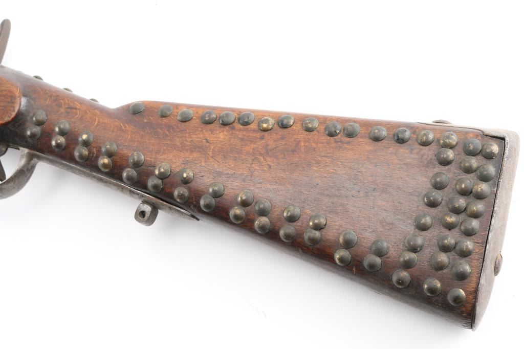"Indian" used gun. This is a Austrian Model 1842 Engineers musket, basically a shortened M1842 musket, 33 1/4 barrel, bayonet lug, .73 Cal. Austrian proofs are found on the triggerguard, escutcheon, and barrel bands, including the double headed eagle. The middle band is missing, but the remaining two bands are stamped "34". rear sight missing, a small notch has been brazed in the dovetail. only cocks & fires at half cock. Musket has seen very hard use, consistent with native American use, metal has turned a dark brown patina, pitted. The stock has been decorated with brass tacks which appear contemporary with the period. They have been on there a very long time. The French used the M1842 in Mexico, the the Confederate Government obtained over 600,000 of them during the civil war, mostly by the Army of Tennessee, including the siege of Vicksburg. That would explain how an Austrian rifle ended up on the North American continent that many years ago. Very Interesting rifle. NRA Condition-Fair. Antique Firearm