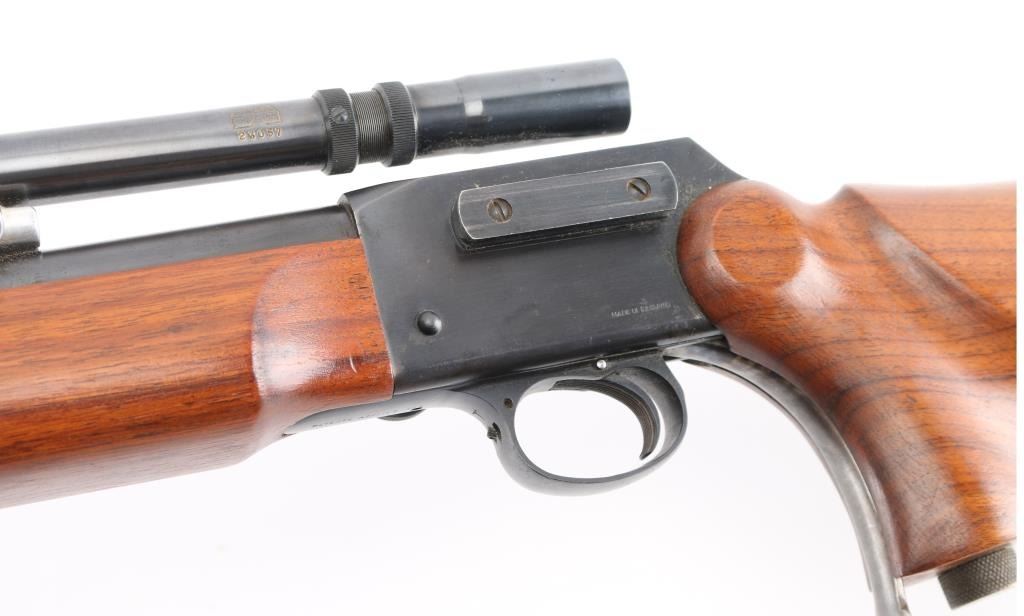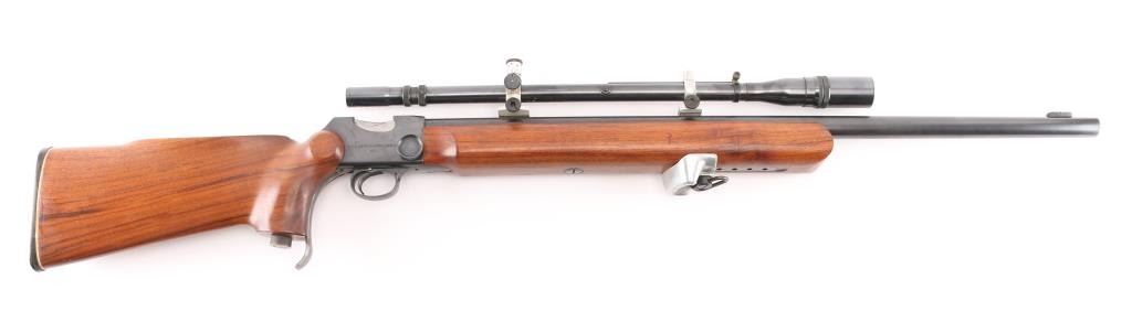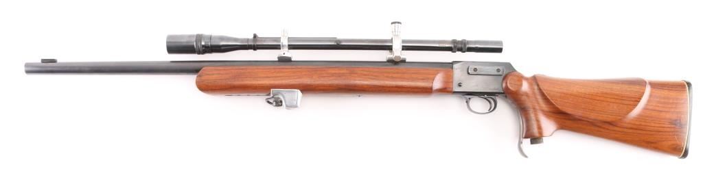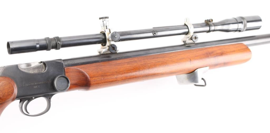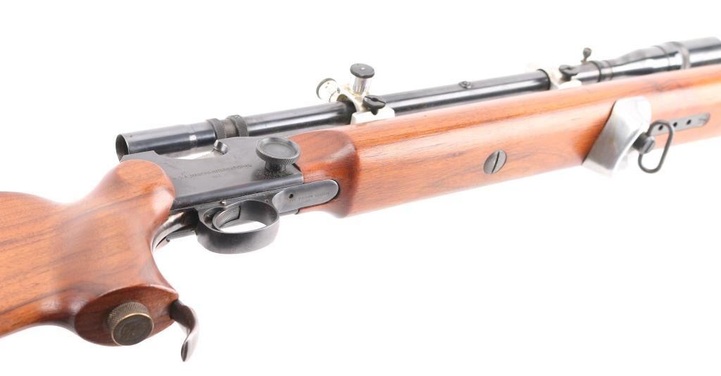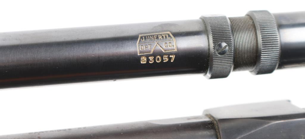 SN: UE934. English made blued and case-colored tilting-breech lever-action single-shot target rifle with a 29" heavy barrel, recessed crown, Beavertail forend, hand stop rail with aluminum hand stop installed, J. Unertl target rifle scope, 10X power with an adjustable objective lens and has the original Unertl externally adjustable rings. The scope is marked near the ocular lens "J. Unertl Opt. Co.". Serial number 23057, good condition with clear optics and only minor wear. The scope measures 21.75" long with sun shade. Wood stock & forearm with factory butt plate. Sight/optics rail mounted on the left receiver. Blue finish is about about 98%. The case-colored lever shows bright colors. Bore looks very good with strong rifling. needs cleaning. Action is faultless and has a very light trigger pull. Wood is very good/sound with some minor scratches. NRA Condition-Near Excellent. Modern Firearm.