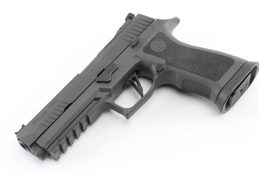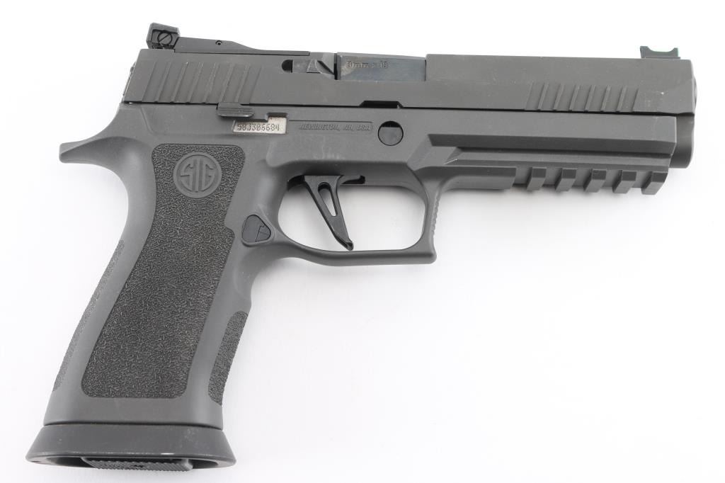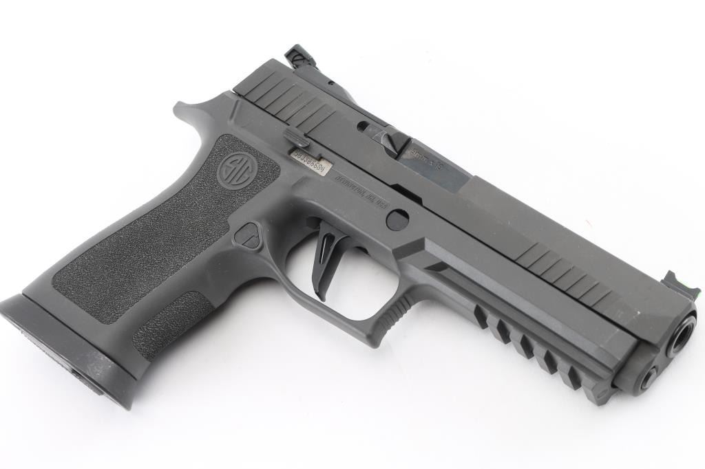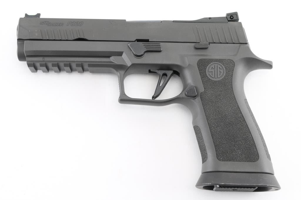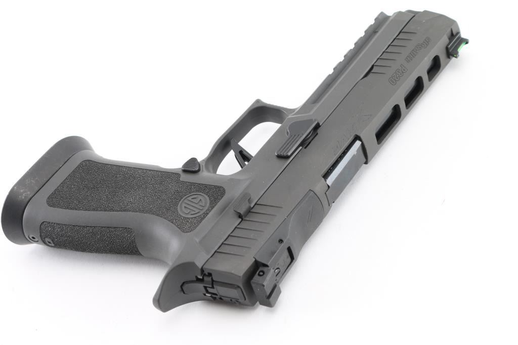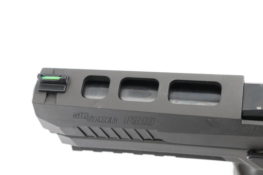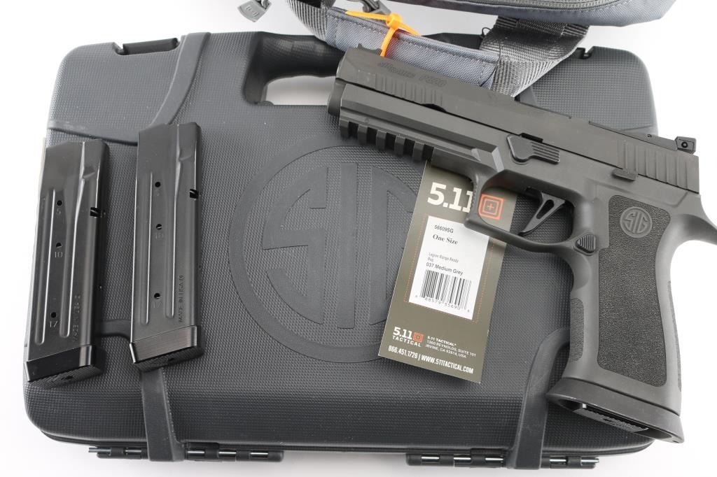 320X5-9-BAS' semiautomatic competition pistol, chambered for 9x19mm Luger. Features matte gray finish, matte gray polymer grip frame with accessory rail & magazine well funnel, 5" bull barrel, lightened slide, Dawson Precision dovetailed blade front sight with green fiber optic insert & adjustable rear sight, push button magazine release, under cut trigger guard, striker fired with straight trigger. Rear sight plate can be replaced with a ROMEO1 optic (not provided). Bore is pristine. Overall condition is like new with few blemishes. Includes factory box with paperwork, total of three magazines. Also included is a medium gray Legion range bag made for Sig Sauer by 5.11 tactical, and a Sig Sauer P320, Legion medallion. Condition is NRA Excellent - like new Modern Firearm