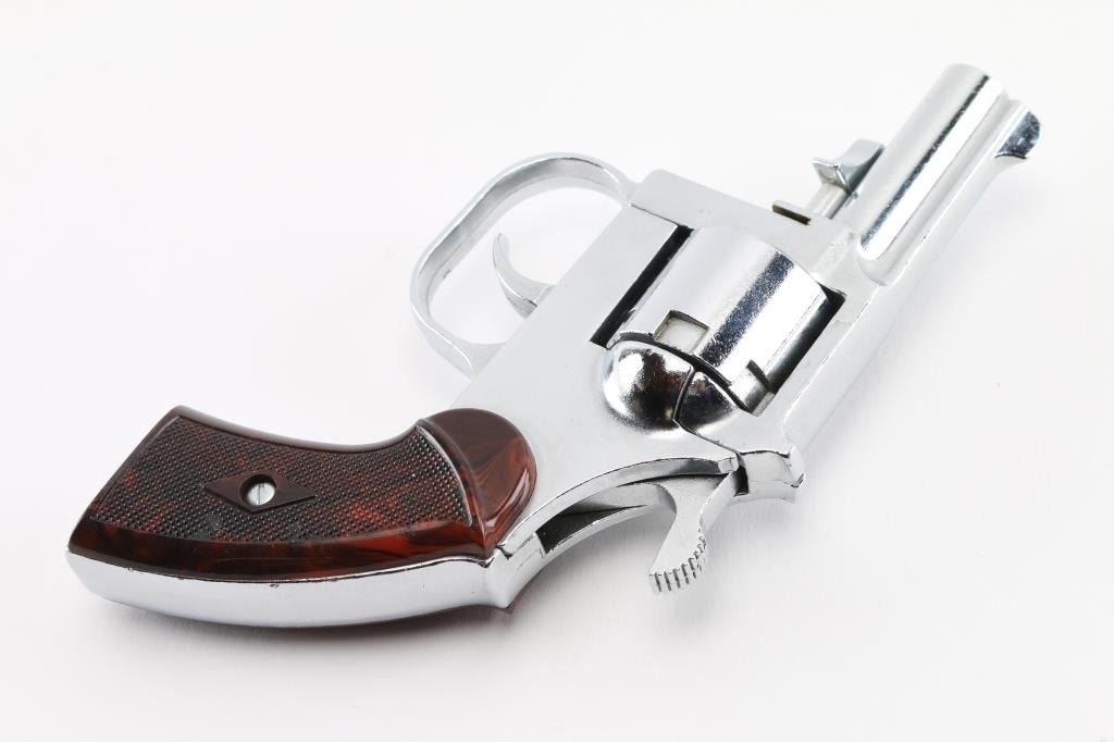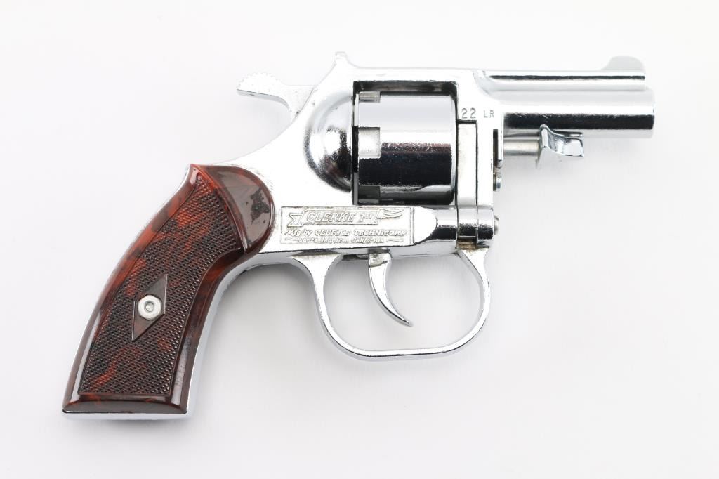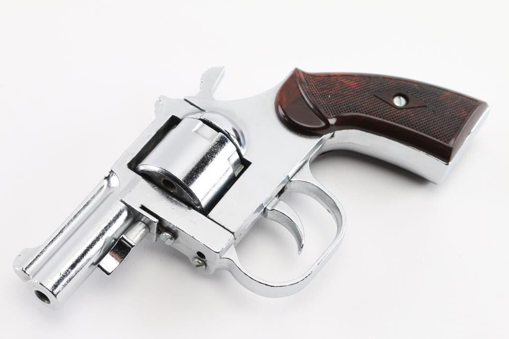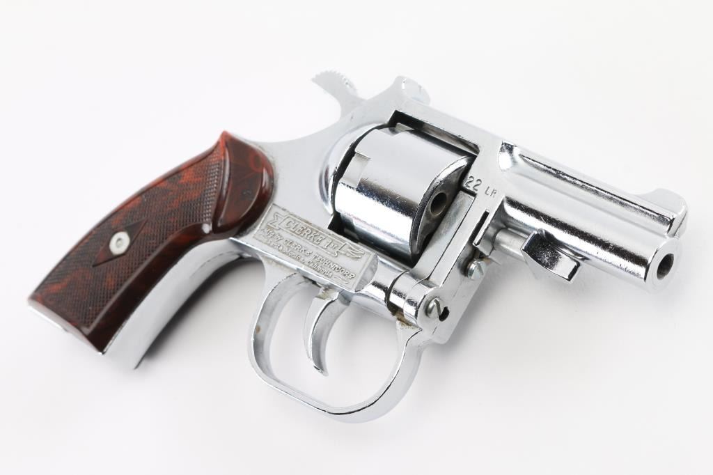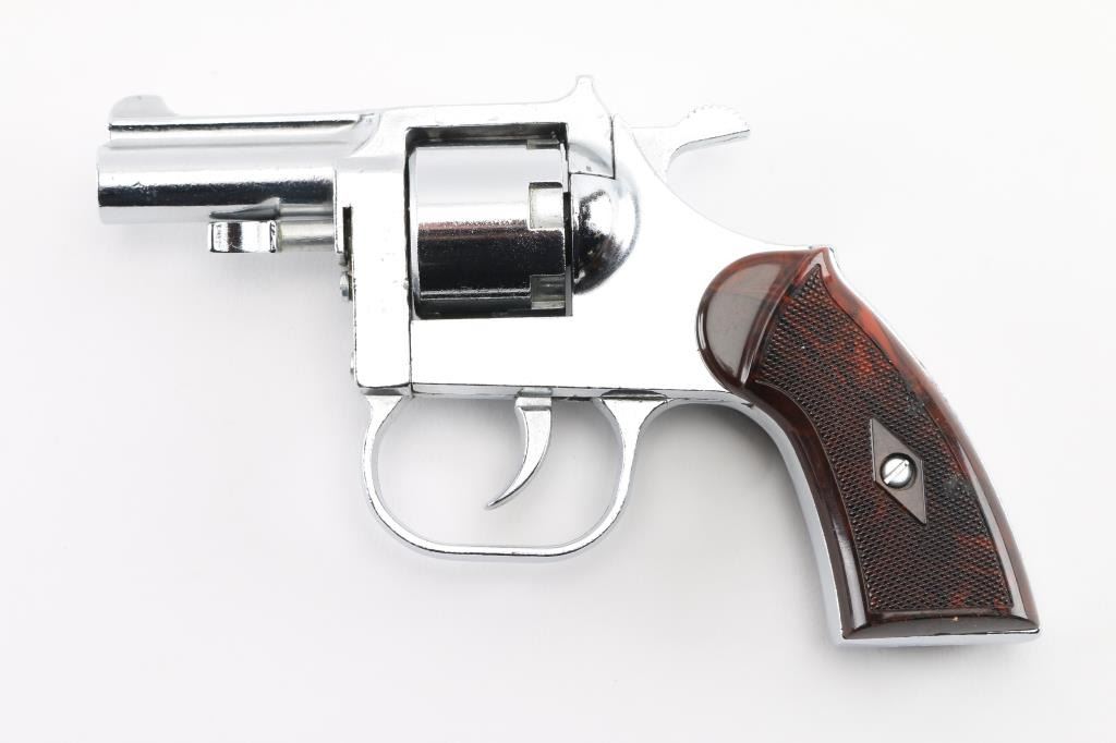 Budget double action revolver, circa 1970's. Features chrome finish, checkered brown plastic grips, 2.25" barrel, fixed sights, 6 shot unfluted cylinder. A center pin is removed to allow cylinder to open to right side, then pin is used to manually eject empties. Bore is very good. Chrome plating is very good with few blemishes. Grips are very good. Condition is NRA Very Good+ *** Modern Firearm ***