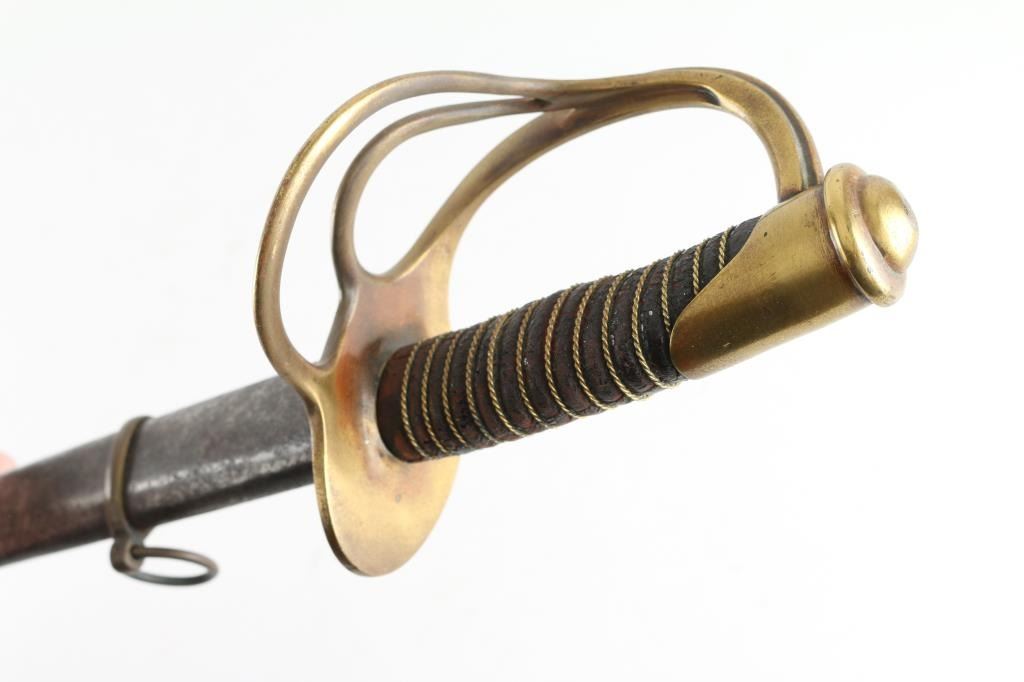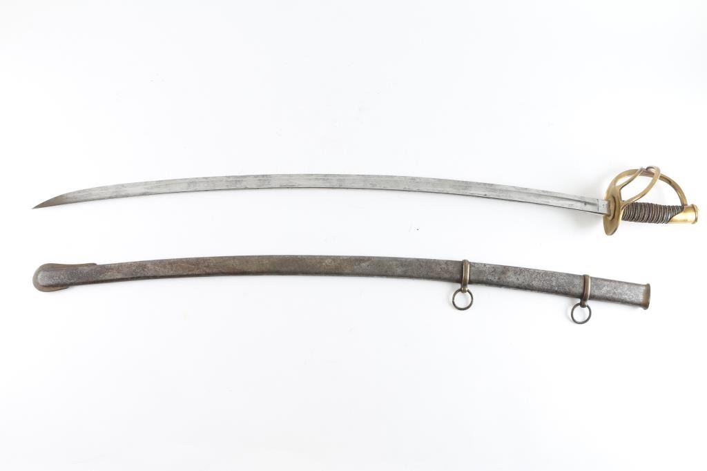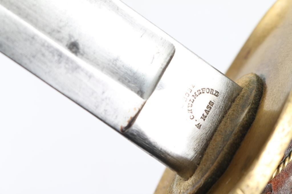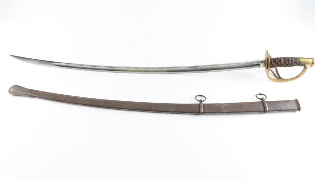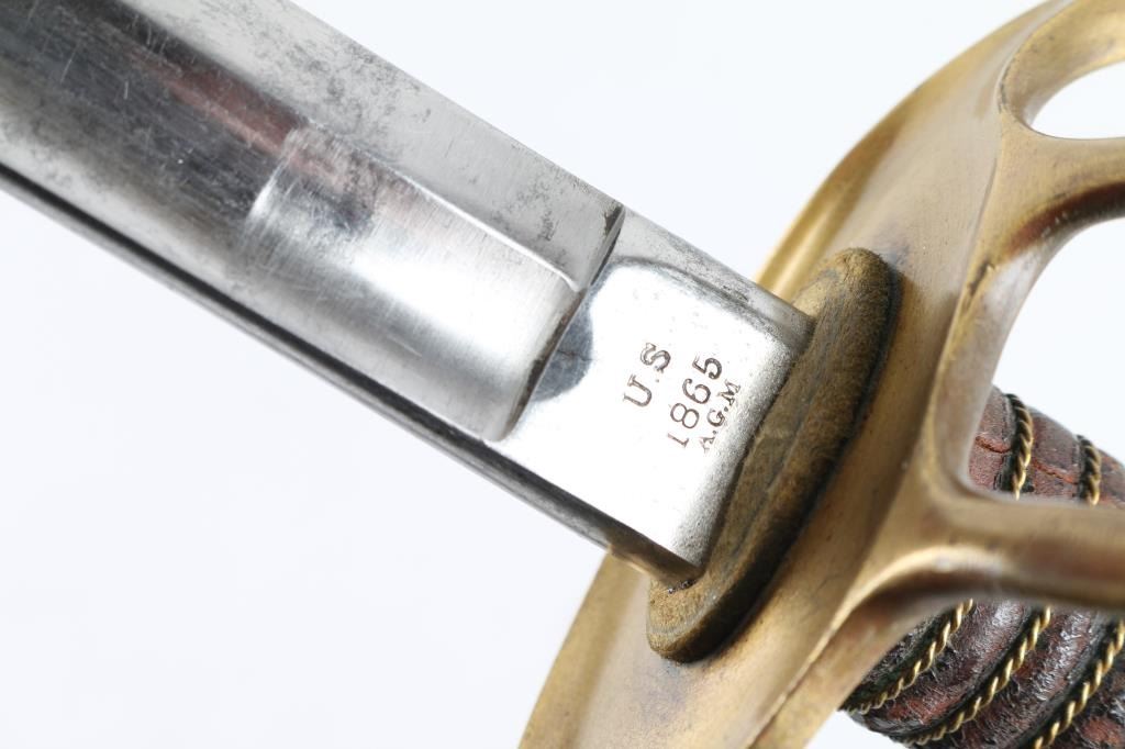 U.S. Model 1860 Light Cavalry Saber and scabbard, the principal sword used by cavalry troopers during the Civil War and Indian Wars that followed. It was manufactured by C. (Christopher) Roby & Company of West Chelmsford, Massachusetts. Late-Civil War period enlisted man's saber. The 34 3/4' curved blade has a 27 1/2" broad fuller and a 18 1/4 inch narrow fuller. Blade has much original polish and a few minor patches of light staining and scuffing. The obverse ricasso is stamped "U.S.", "1865", "A.G.M." in three lines while the reverse ricasso is maker-marked "C. ROBY" over an arched "W. CHELMSFORD" followed by "MASS" inside the arch, all in block letters. The original leather buffer-pad is present at the guard. The wood grip is covered in black leather and wound with twisted brass wire, all original with some flaking/wear to the leather. The domed, brass pommel cap has a small "m" inspection mark. The brass, half-basket guard consists of a knuckle-bow with two branches on the obverse side meeting an oval counterguard. All brass components have a nice, aged patina and are in excellent condition. The scabbard is bright steel, straight, undented with some pitting.