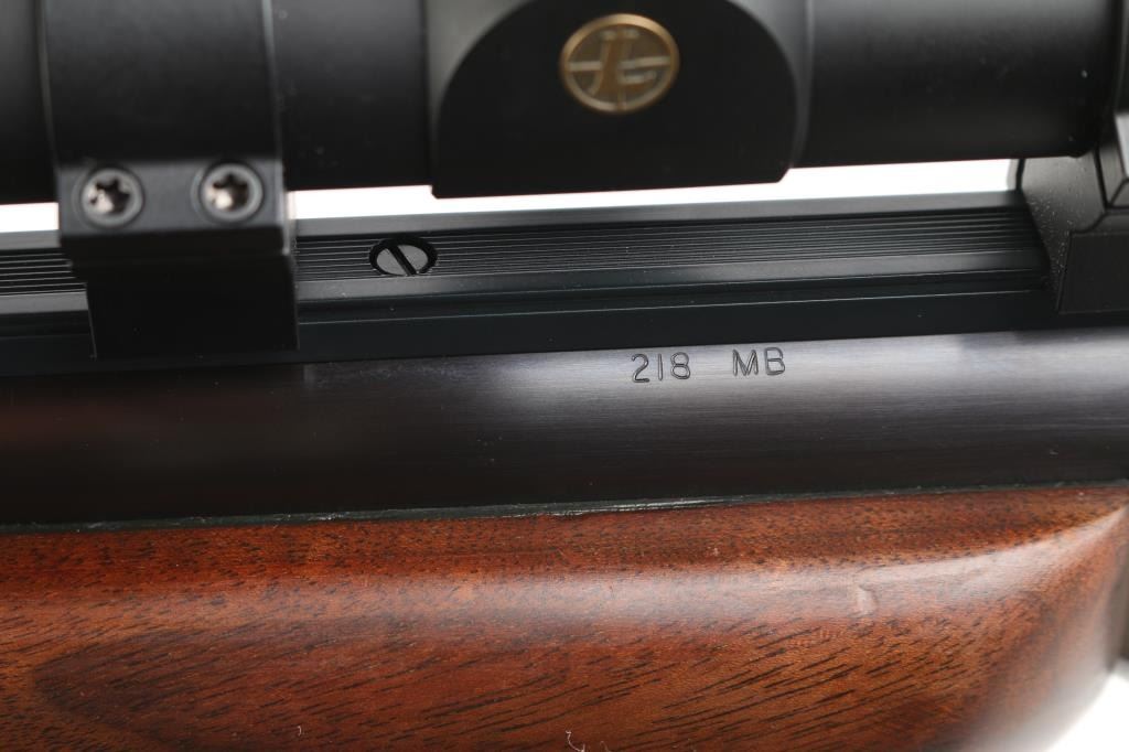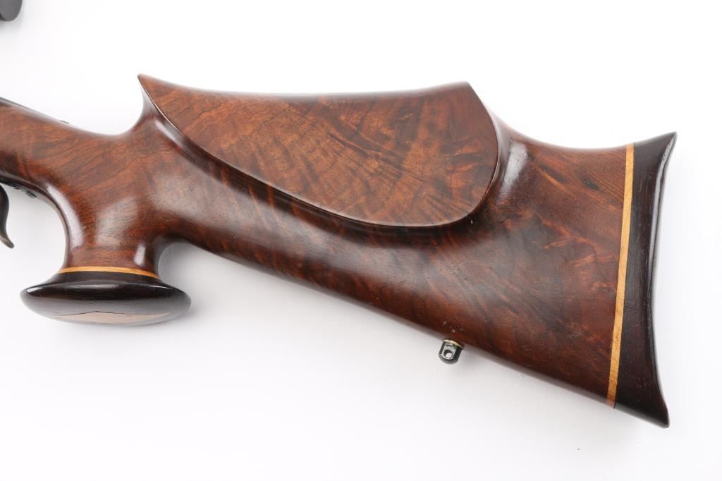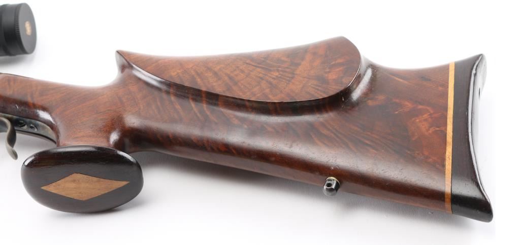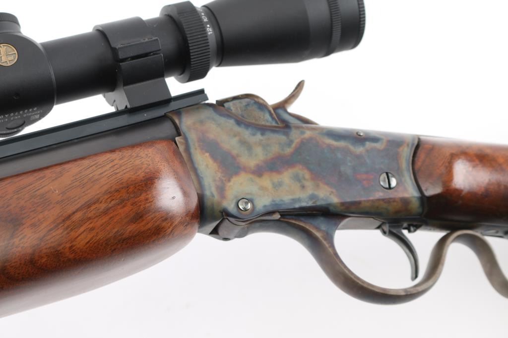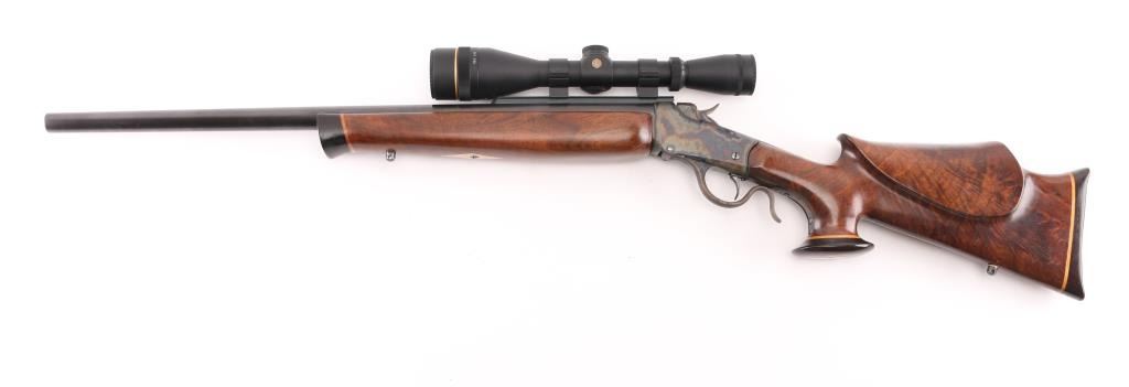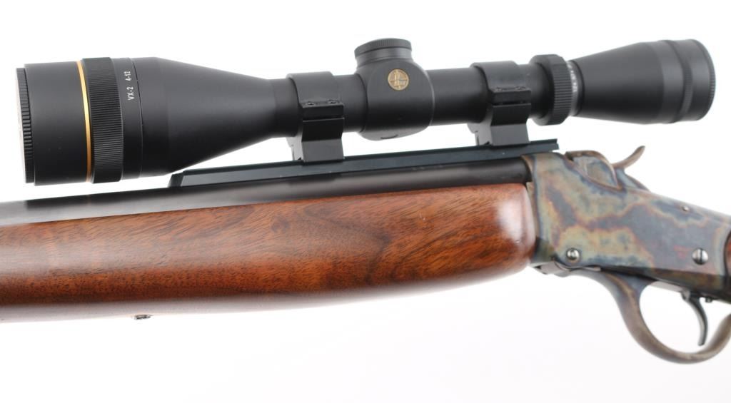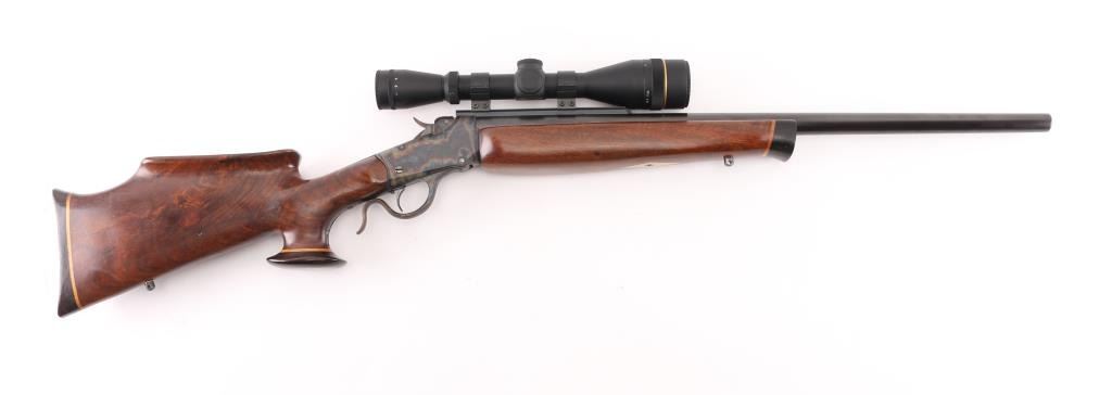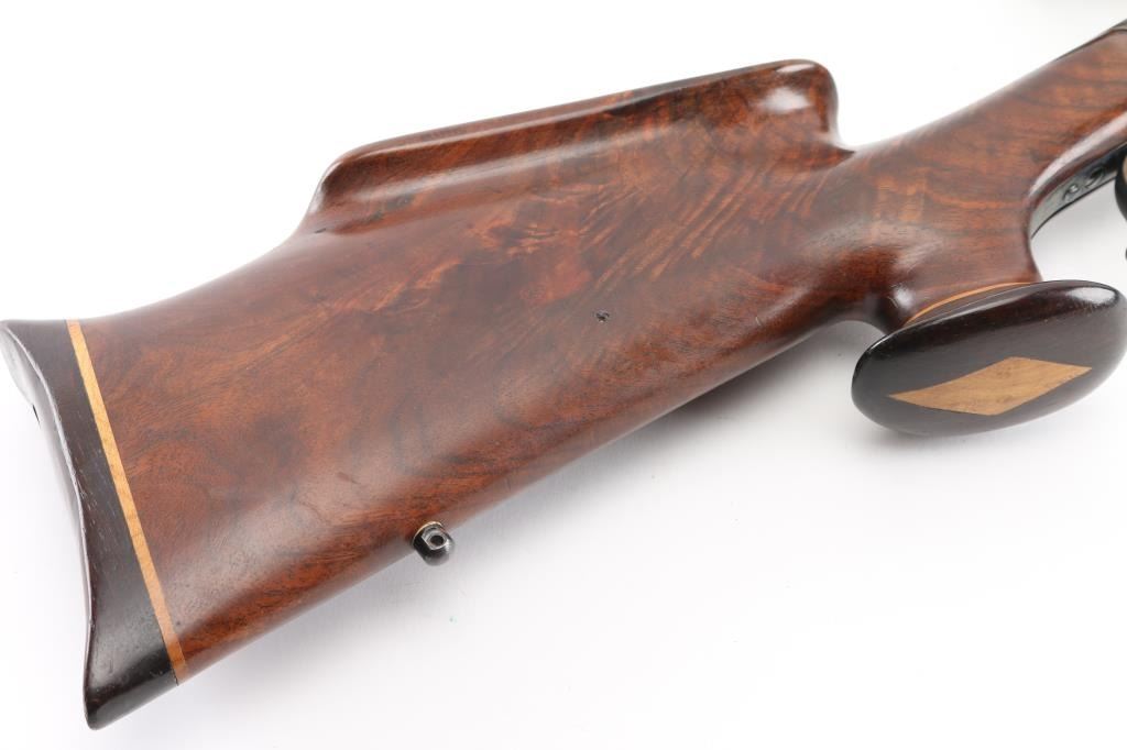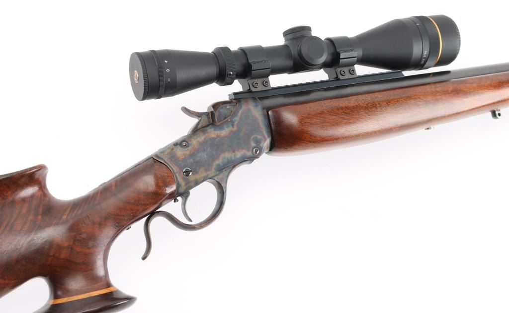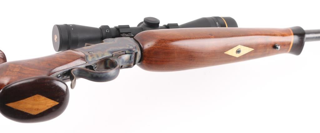 This is a custom target rifle built on a Winchester M1885 low wall receiver. Manufactured 1890. Re-barreled with a 25" heavy round barrel chambered in .218 Mashburn Bee. Single set trigger, Blued finish with case hardened receiver & lever, highly figured smooth. American walnut stock with high comb, shadow line cheek piece, contrasting dark brown wood schnabel forearm tip, butt plate. and oversized grip cap with blond wood spacers, there is diamond shaped blond wood inserts in the underside of forearm & grip cap. Mounted with a Leupold VX-2 4-12 scope, fine cross hair reticle, clear optics, screw-on caps. Falling block action is smooth, locks up tight, metal finish & wood stocks are excellent, bore is excellent/bright. NRA Condition-Excellent. Antique Firearm.