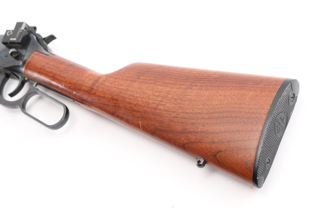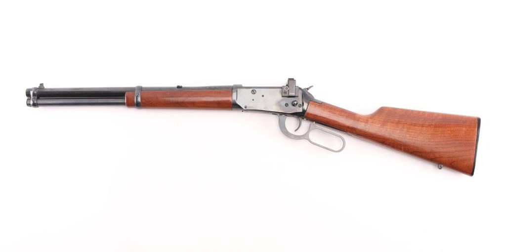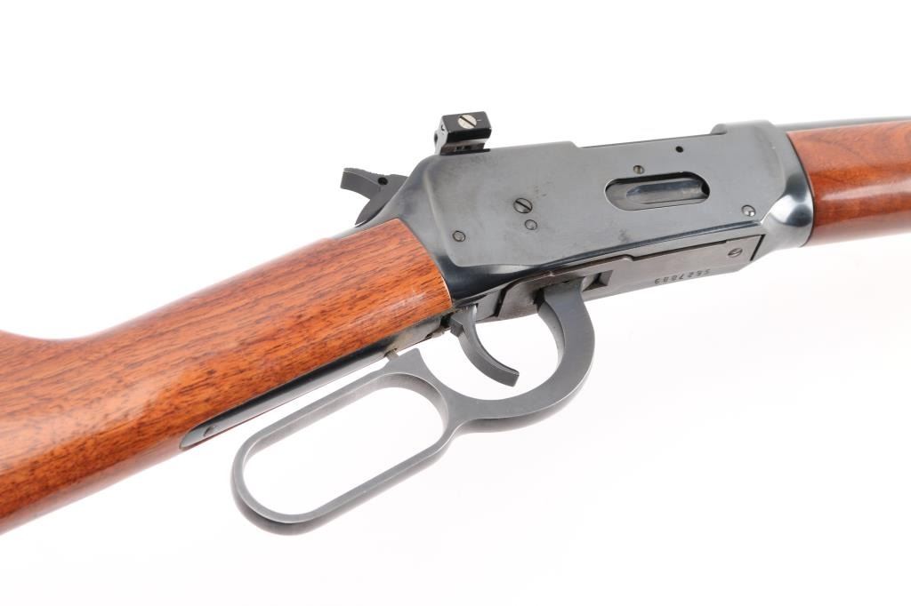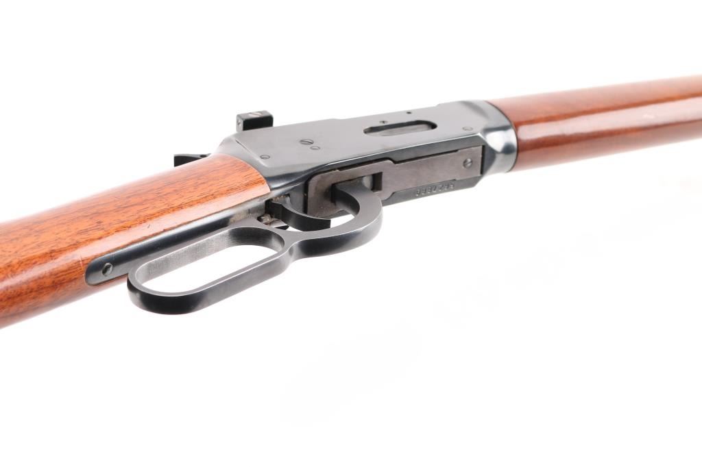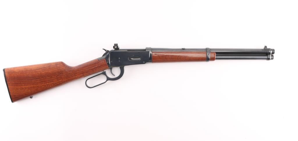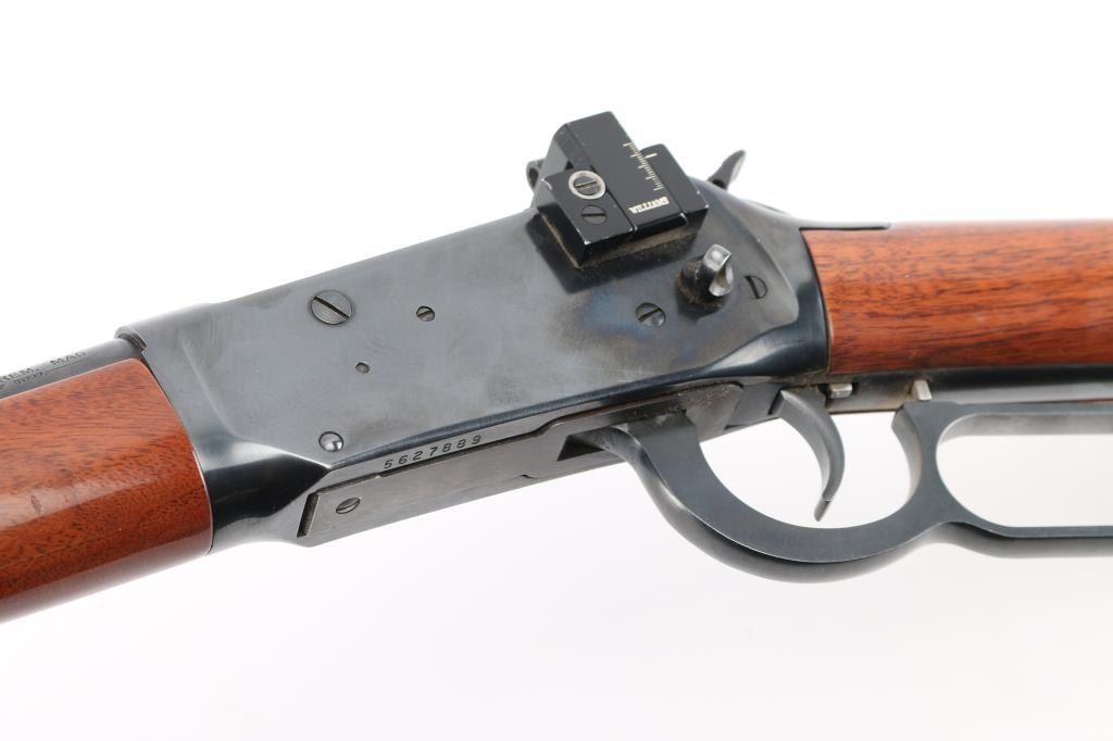 SN: 5627889. Lever action rifle features blued finish, wood forend & straight gripped stock, plastic buttplate, 16" barrel, blade front sight, no rear sight, insert in dovetail, Williams adjustable peep sight mounted on receiver, full tube magazine under barrel, lever safety. Saddle ring stable present, no ring. Bore is excellent condition. Retains 97% blue with signs of handling and use. Wood is very good to excellent condition. Condition is NRA Excellent. Modern Firearm.