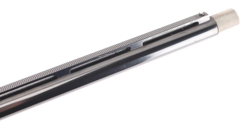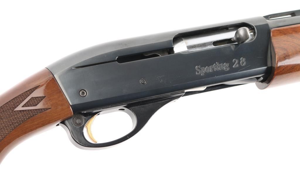 The 'Sporter 28'. Semiautomatic shotgun accepts 2-3/4" shells and Remington chokes (Skeet installed). Features 27" vent rib barrel, Bradley style white bead front sight, steel mid bead, manual safety, blued finish, walnut butt stock & forend with checkering at wrist and forend, solid rubber recoil pad, black plastic grip cap. LOP is 13". Bore is pristine. Retains 98% finish with minor scratches on receiver. Wood is excellent, bore is excellent/bright. Action is smooth. Condition is NRA Excellent. Modern Firearm.