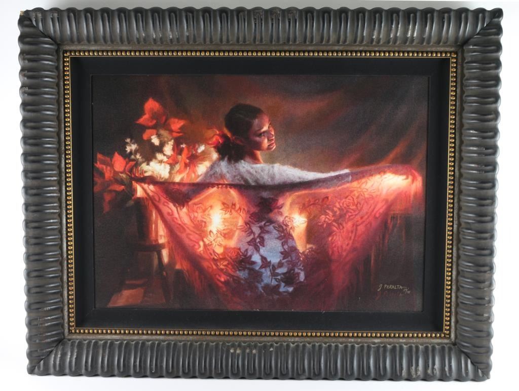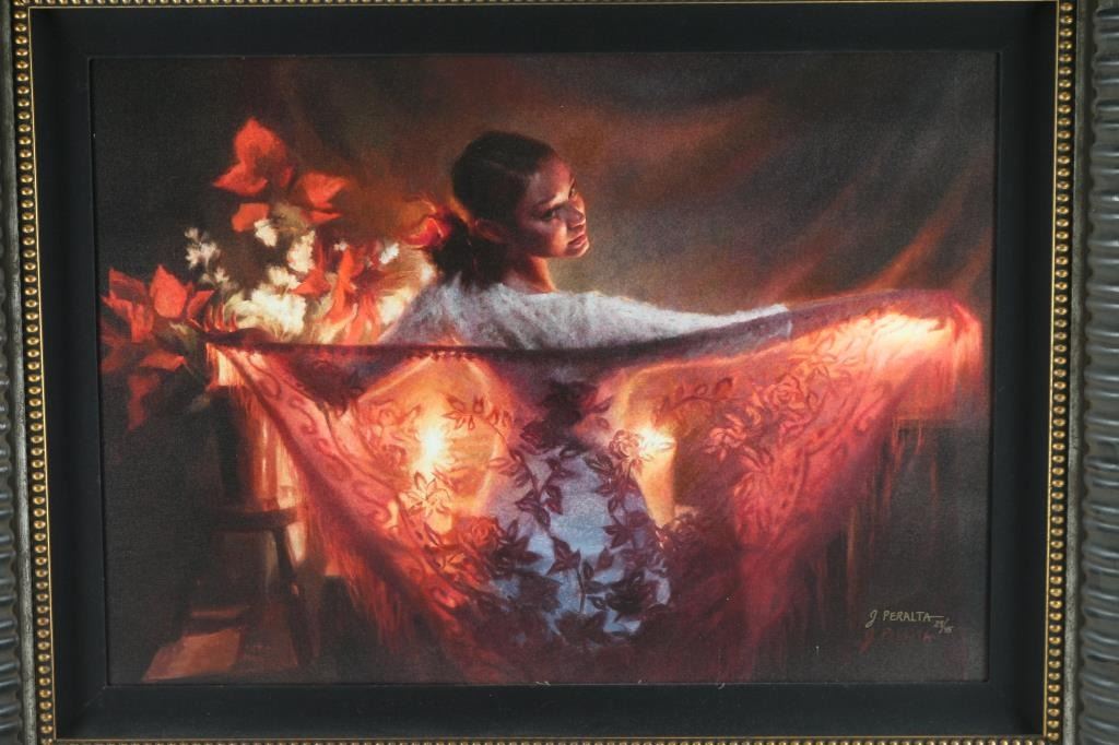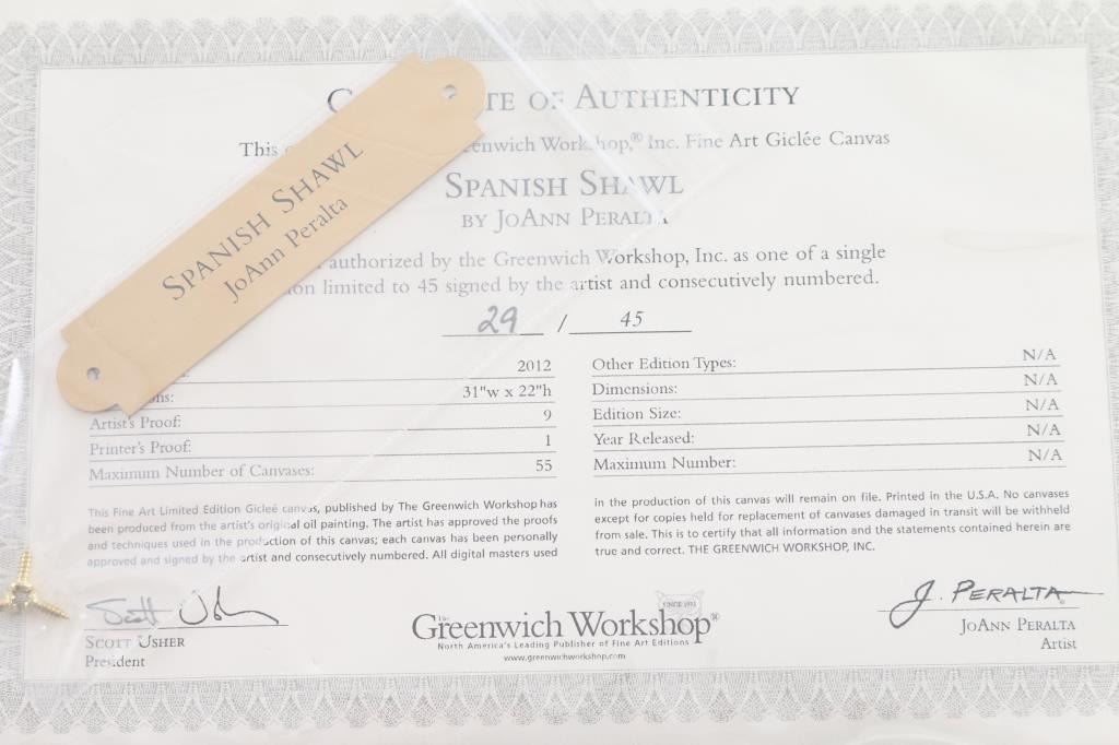 By well known artist "JoAnn Peralta" entitled "Spanish Shawl", Limited editioin 29/45, released in 2012. Signed with artist proof lower right corner. Image size measures 31"w x 22 h" beautifully framed.