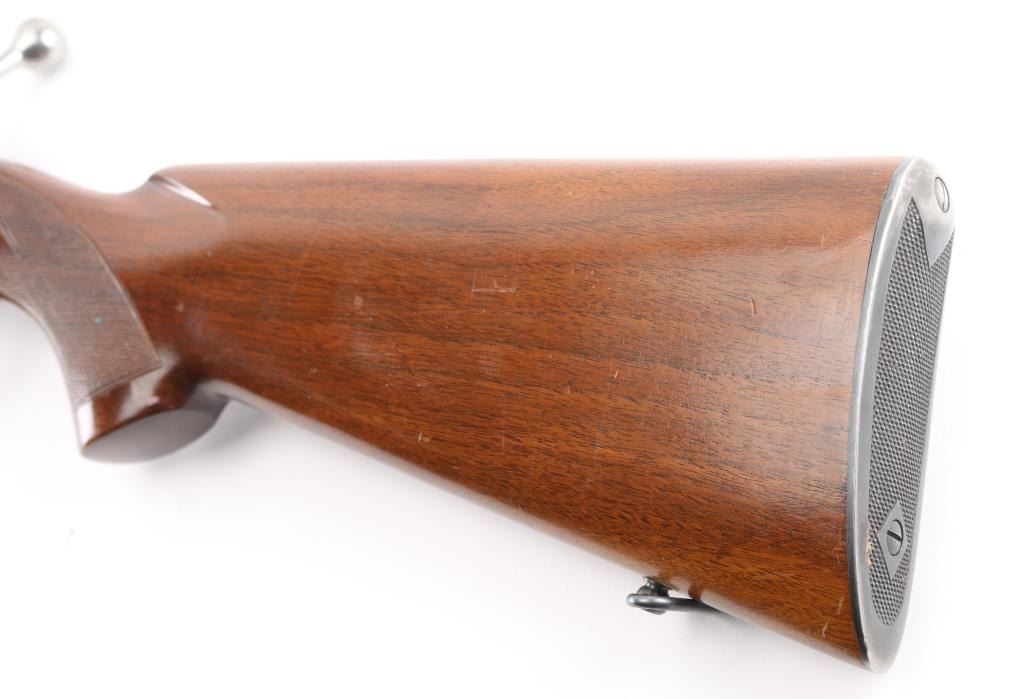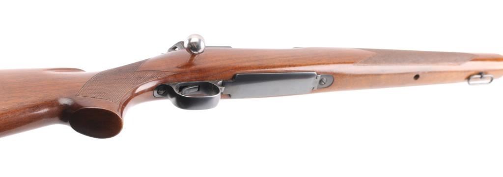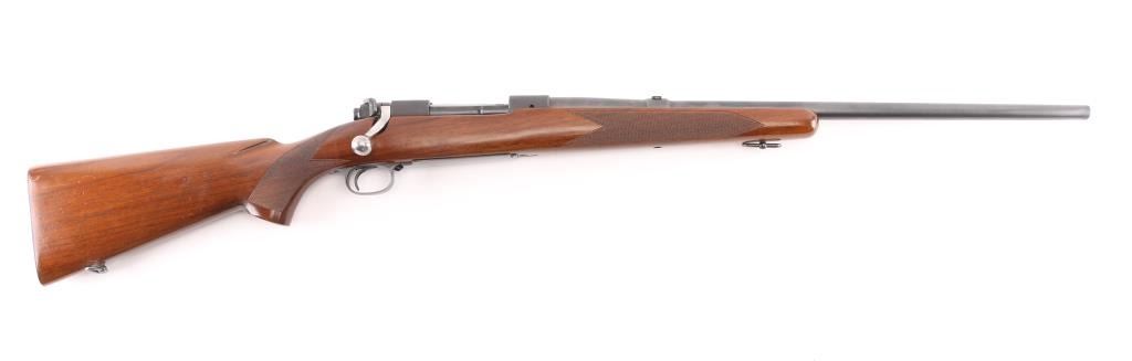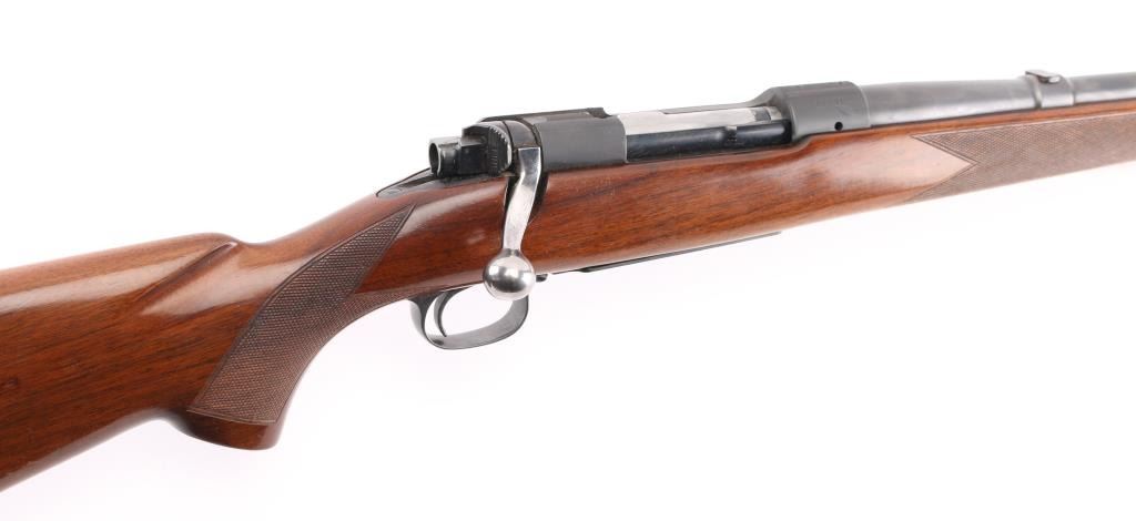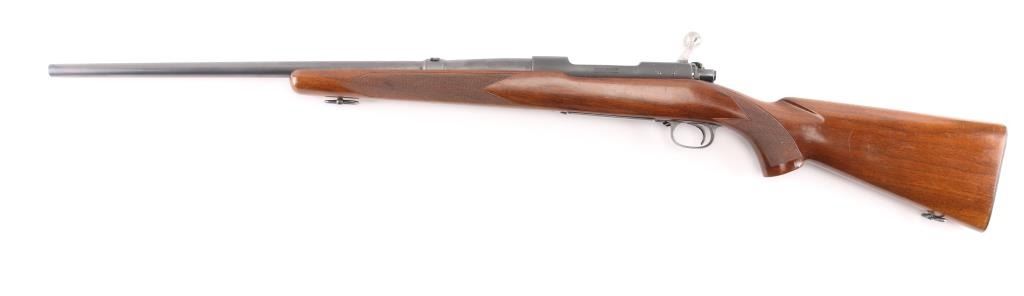 Desirable 'pre-64' bolt action sporting rifle chambered in .220 Swift, manufactured circa 1949. Features a reblued matte blue finished receiver, and a satin blue refinished barrel, 22" tapered barrel, no front sight, blank inserted into the rear sight dovetail, drilled & tapped receiver for top & side mounted sight/optics, serrated trigger, polished bolt with three position safety & a swept back bolt handle, internal box magazine with hinged floorplate, sling swivels and checkered walnut pistol grip shoulder stock with knurled metal buttplate. The rifle exhibits approximately 98% of it's refinish, some minor scratches on the receiver,. Action is smooth, bore is excellent, markings are crisp, and the wood stock is very good. Missing screw in the underside of forearm. NRA Excellent as Refinished. C&R Firearm.
