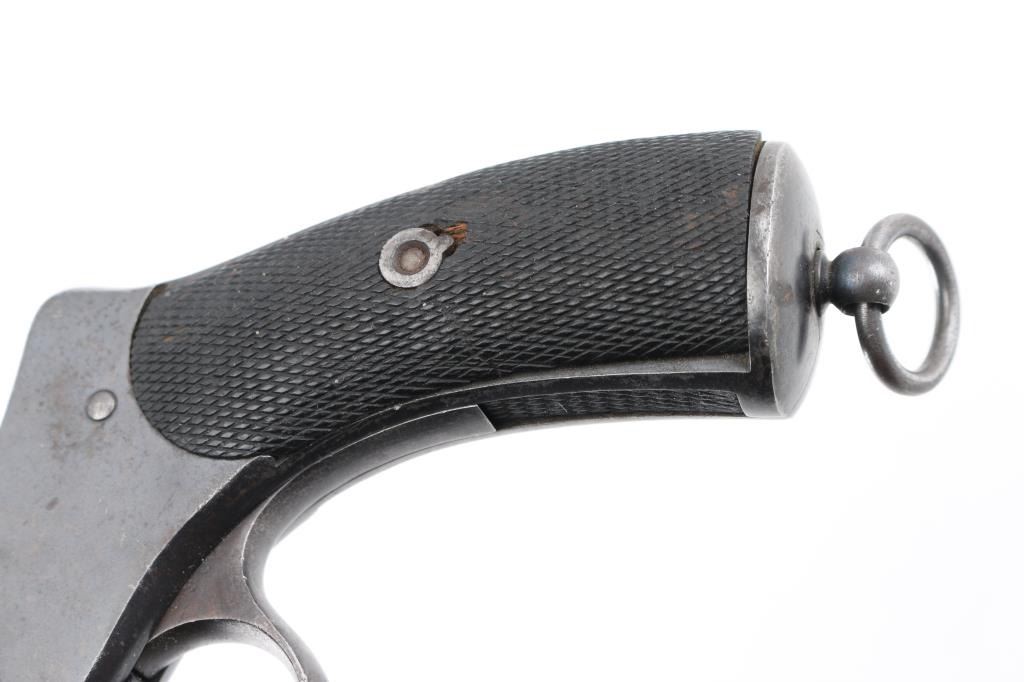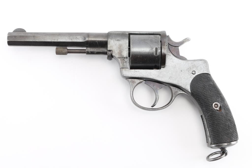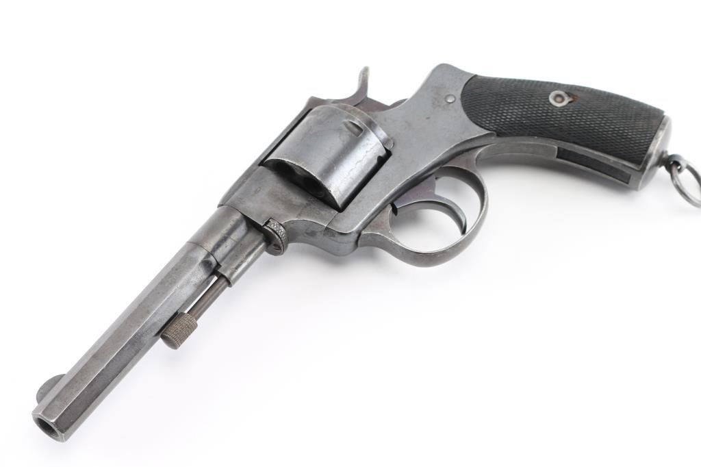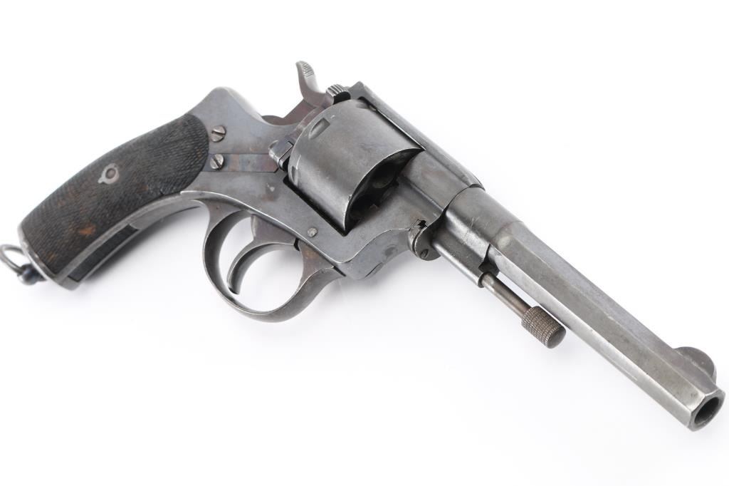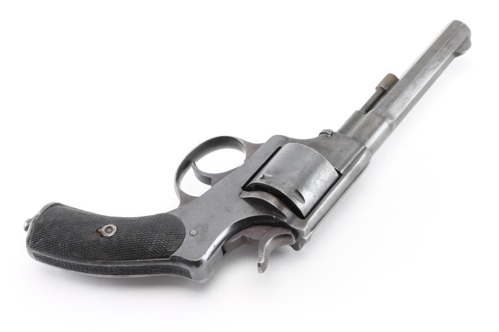Antique revolver based on an earlier Belgian Nagant design, purchased for military use by Brazil up thru 1891, similar revolvers also used by Argentina. Unknown chambering, historical records indicate 44 Henry Centerfire, to match other firearms in use at the time. Features blued finish, checkered walnut grips with backstrap insert, 5.75" octagon barrel, fixed sights, single action operation, double action trigger pull rotates cylinder (only), lanyard ring. Bore is very good. Retains 90% coverage of re-blued finish, with losses to some fine contours from polishing, some blemishes retained under refinish, partial erosion of markings. Grips are good condition, with smoothing of checker points. Matching numbers on frame, barrel, trigger guard, cylinder. Condition is NRA Good++ *** Antique Firearm ***