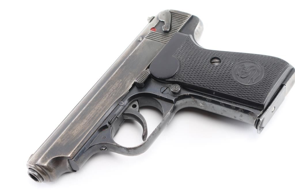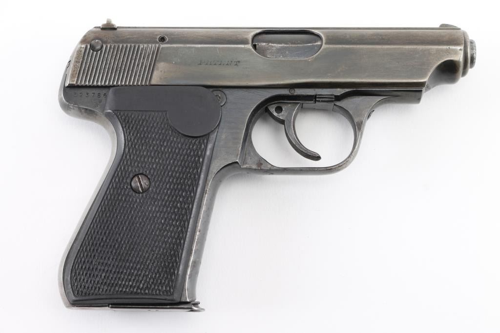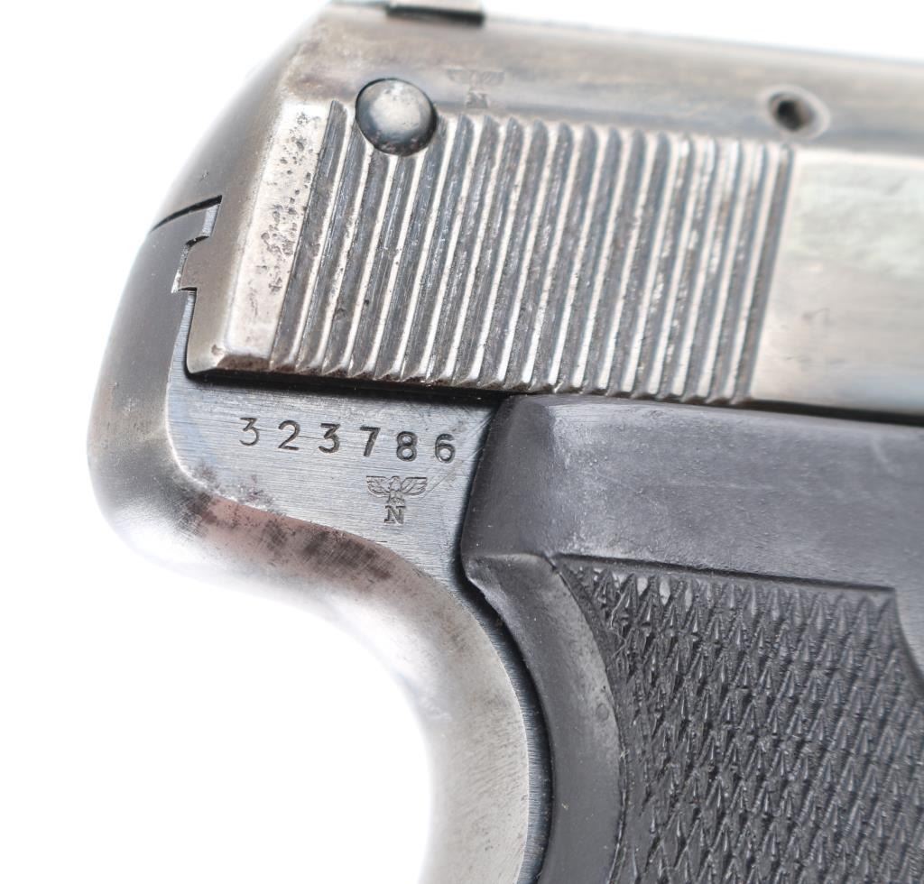 German semiautomatic pistol, type used in WWII, stamped with Waffenamt-37 & commercial Eagle over "N" proof. Features blued finish, black checkered plastic grips, 3.25" barrel, fixed sights, double/single action, push button magazine release, loaded chamber indicator, frame mounted decocking lever. Bore is very good condition, bright with some dark spots that might clean out. Retains 60% re-blued finish, showing mottled gray and brown tones on slide, darker colors on frame, bare metal on backstrap, edge losses, erosion to slide markings. Grips are good to very good. No importer markings observed. Includes one magazine. Condition is NRA Good++ *** C&R Firearm ***