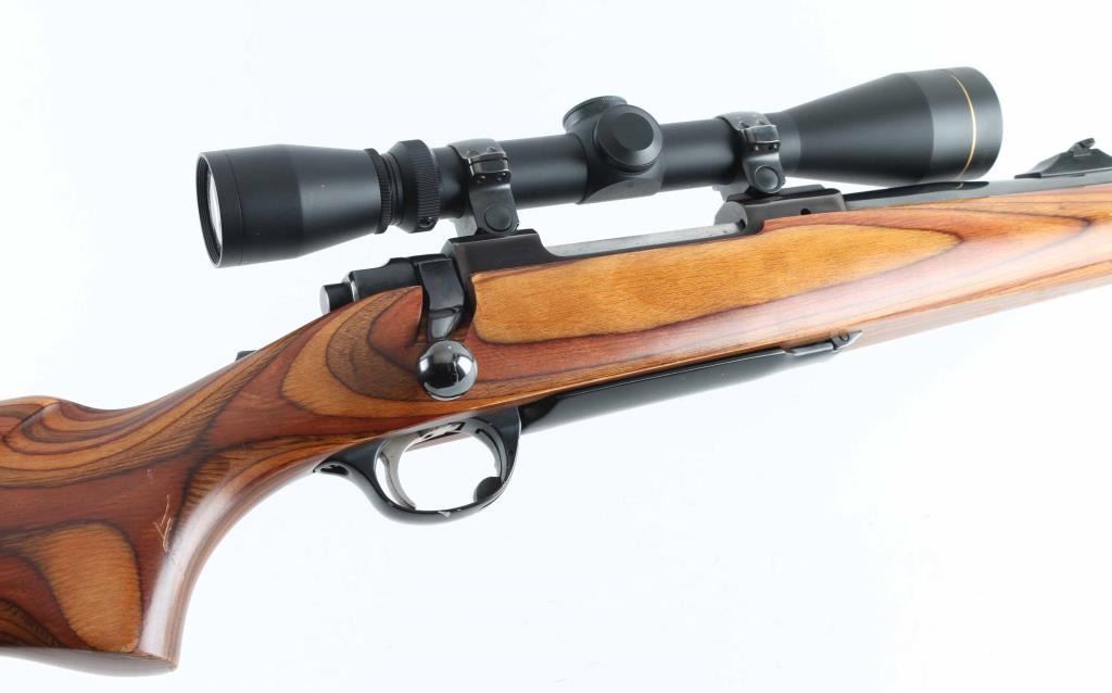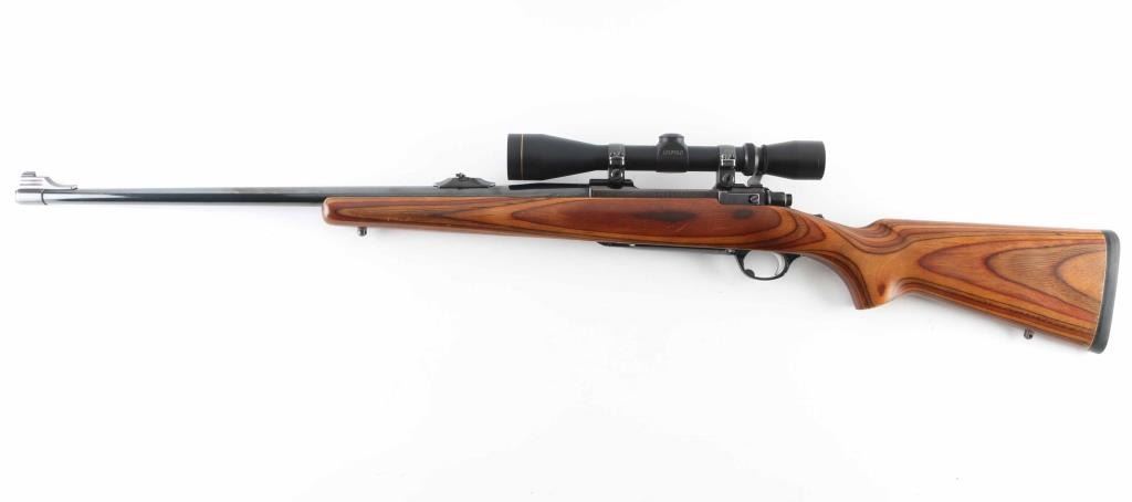 24" high polish barrel with a laminate stock, flip down rear sight, integral scope base with rings and a Leupold 3-9 VARI-X II. Barrel and stock both have minor scuffing. Circa 1989. NRA Very Good. Modern Firearm