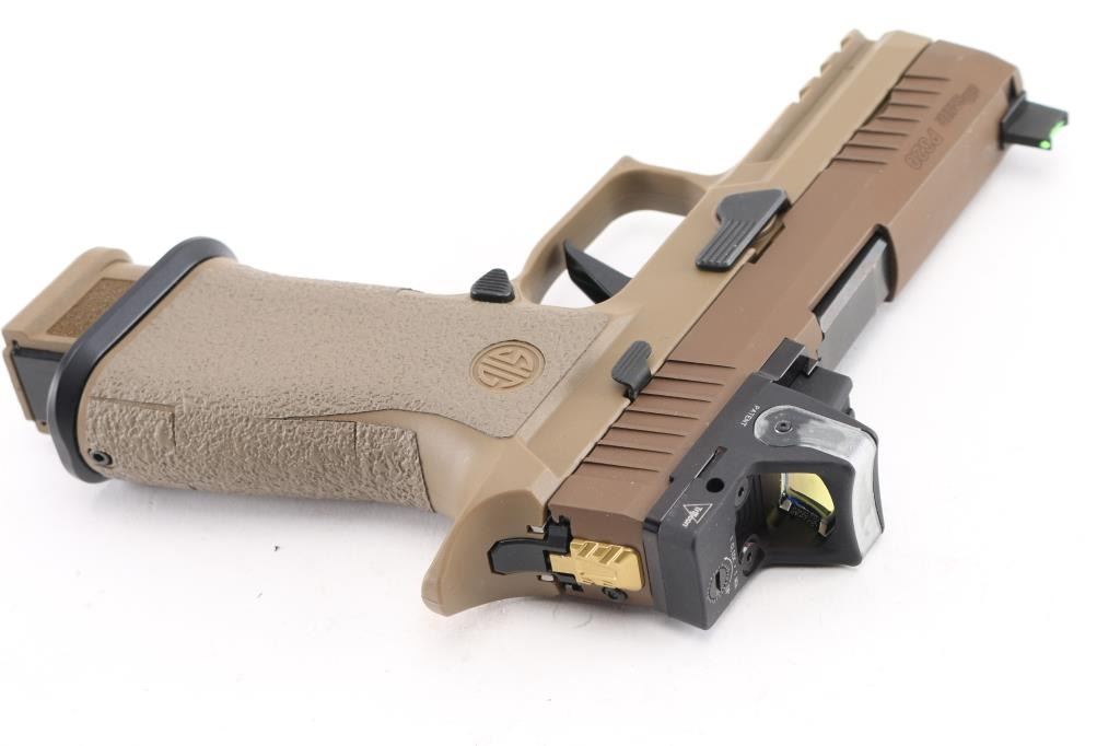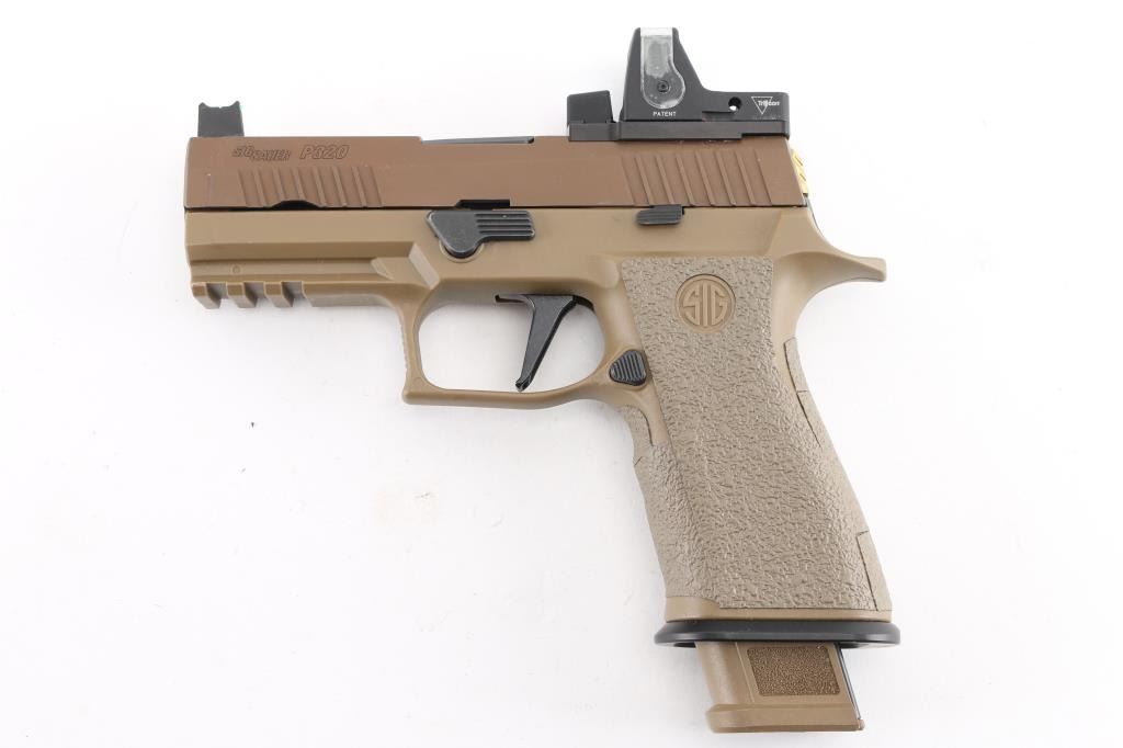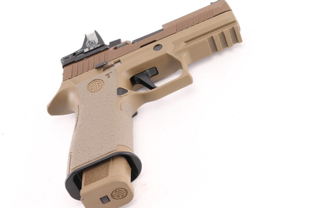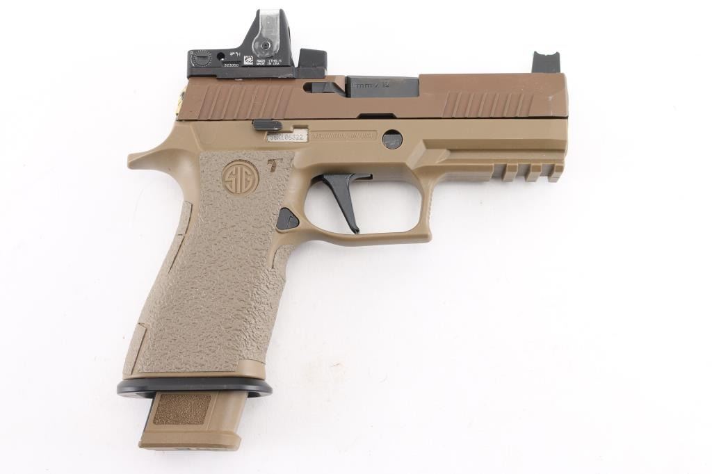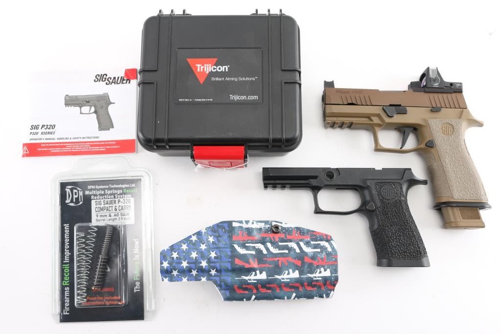 SN: 58K106322. Upgraded P320 XCompact. Features a completely redesigned modular polymer XSeries grip with a reduced fastback carry cut and a low-profile internal magwell. Combined with the extended beavertail and high undercut trigger guard. The 3.6” barrel and XSeries slide with enhanced serrations fore & aft. Pistol is finished in the FDE coyote tan. Upgrades include: Trijicon RMR 05 green dot sight, Tyrant Designs gold backplate, Springer Precision Tritium Front Co co-witness optics mount, Springer precision low profile magwell. (Expensive upgrades) Comes with 21-Rd magazine with coyote tan extension. Bore is pristine, overall condition is excellent. Comes with factory hard case for Trijicon sight, polymer, clip-on We the People holster with American flag, firearm motifs, manual, original sights, additional black 320X grip module, and a new set of DPM recoil reduction system. NRA Condition-Excellent. Modern Firearm.