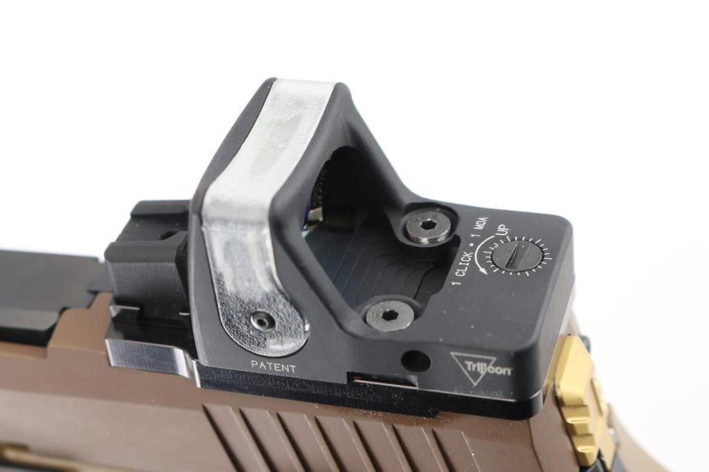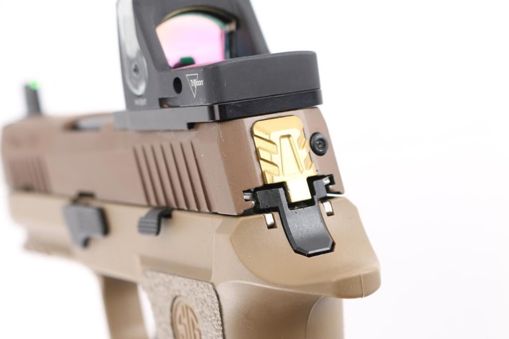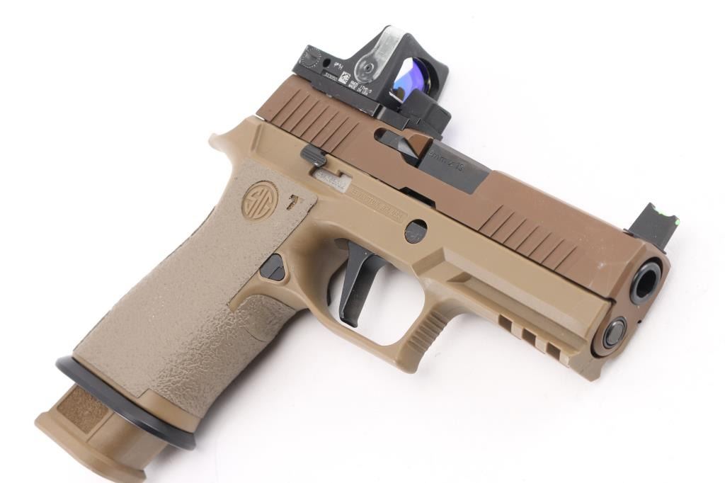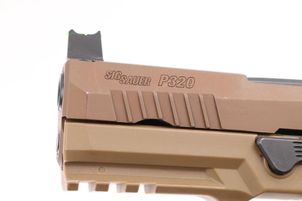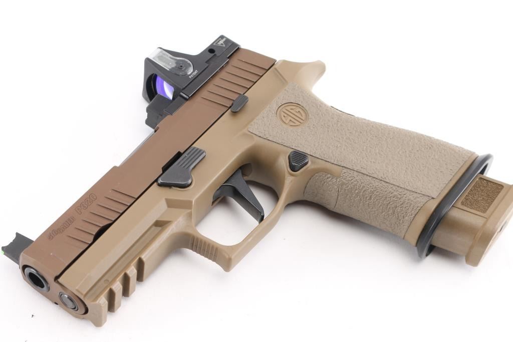 SN: 58K106322. Upgraded P320 XCompact. Features a completely redesigned modular polymer XSeries grip with a reduced fastback carry cut and a low-profile internal magwell. Combined with the extended beavertail and high undercut trigger guard. The 3.6” barrel and XSeries slide with enhanced serrations fore & aft. Pistol is finished in the FDE coyote tan. Upgrades include: Trijicon RMR 05 green dot sight, Tyrant Designs gold backplate, Springer Precision Tritium Front Co co-witness optics mount, Springer precision low profile magwell. (Expensive upgrades) Comes with 21-Rd magazine with coyote tan extension. Bore is pristine, overall condition is excellent. Comes with factory hard case for Trijicon sight, polymer, clip-on We the People holster with American flag, firearm motifs, manual, original sights, additional black 320X grip module, and a new set of DPM recoil reduction system. NRA Condition-Excellent. Modern Firearm.