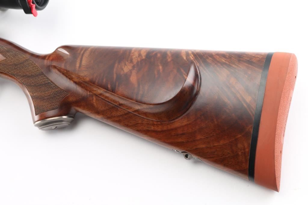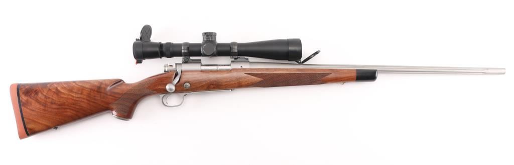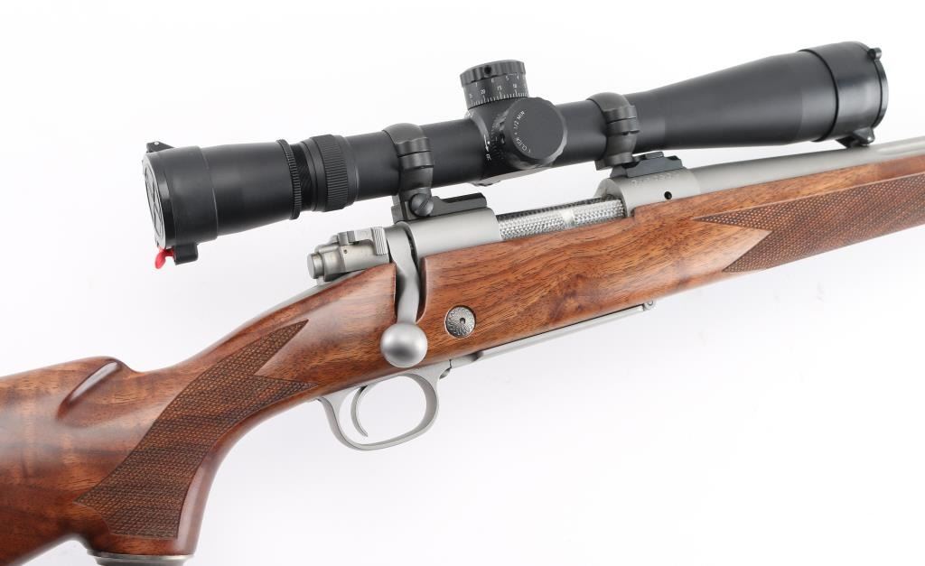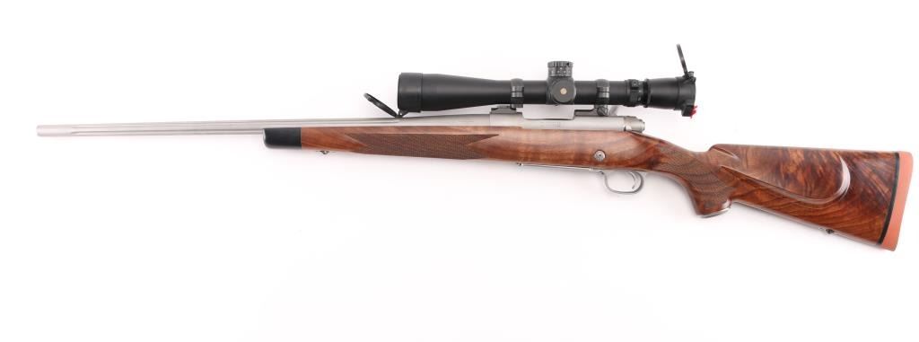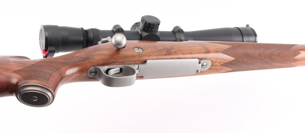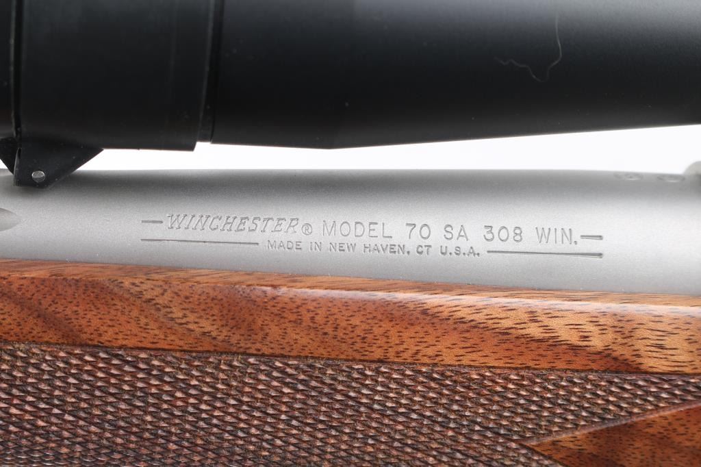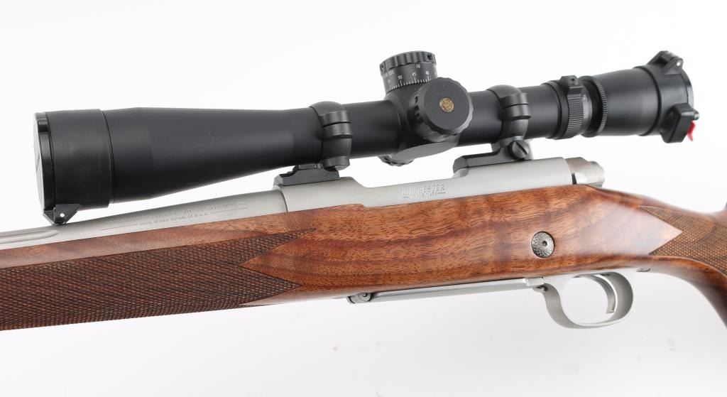 'Classic Stainless' bolt action rifle with controlled round feed, Mauser type claw extractor. Features matte stainless steel finish,one-piece, finely checkered 'Monte Carlo' fancy figured stock with shadow line cheek piece for right-handed shooting, & factory red rubber recoil pad, sling swivel studs. 24" tapered. fluted barrel, no provisions for sights, sling studs, metal grip cap, & ebony forearm tip. Three position safety on bolt shroud, hinged floorplate. Finely jeweled bolt body, swept-back bolt handle. Bore is excellent. Overall condition is excellent with minor handling marks. Mounts a very good condition Leupold Mark 4 3.5-10x40mm LA/I scope made specifically for .308 rifle. NRA Condition-Near Perfect. Modern Firearm