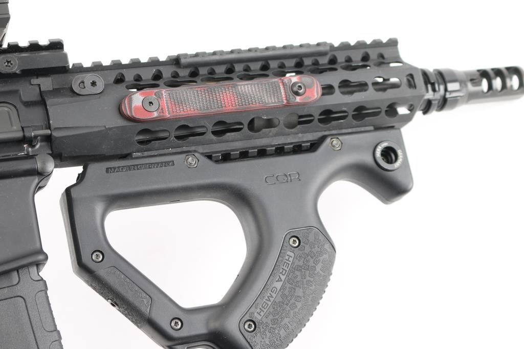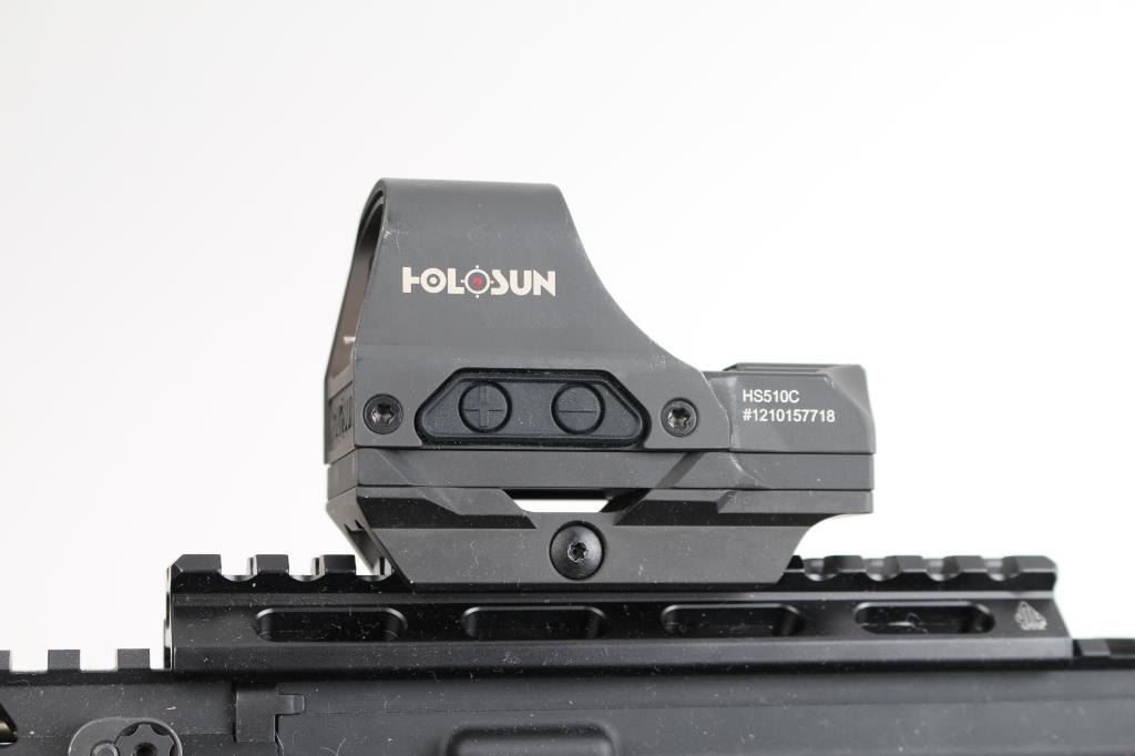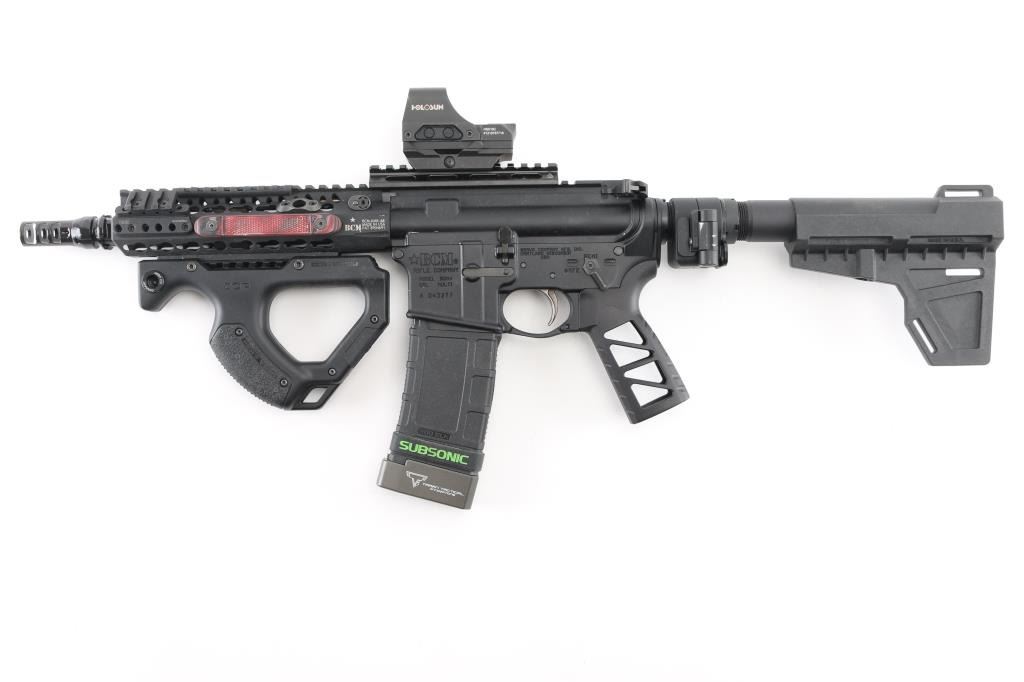 SN: A043277. Upgraded pistol built on a BCM-4 AR15 platform. Matte black finish, 9" barrel with Dead Air Keymod muzzle break. Shell deflector, forward assist, BCM-KMR-A8 Keymod free floating handguard with Hogue G10 Piranha Keymod rail covers in G-Mascus red lava, Sylvan Arms buffer tube,skeletonized JL Billet aluminum grip, BCM 'Gunfighter' charging handle, HERA Arms CQR angled fore grip. Holosun HS510Cred dot optic on UTG 1/3 riser. Pistol is overall near excellent, with a couple of minor scratches, bore is excellent/bright. Comes with one PMAG 30-round magazine with Taron Tactical extension, & and the factory box for the Holosun sight with tools. NRA Condition-Near excellent. Modern Firearm.