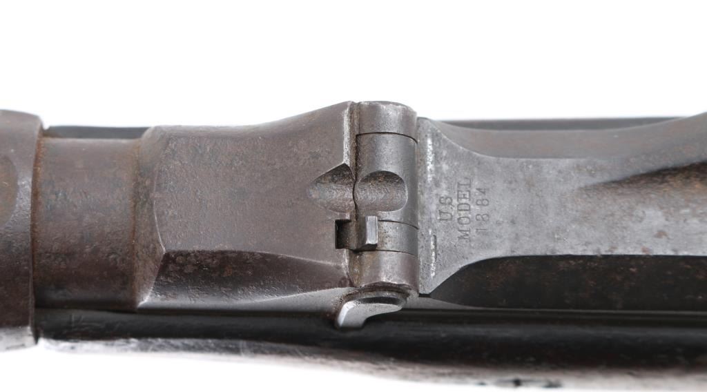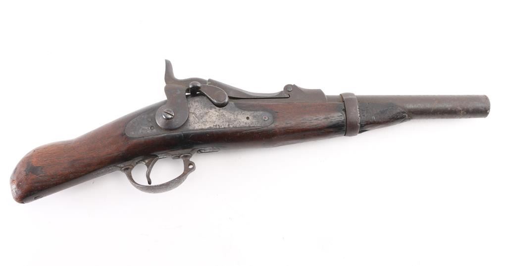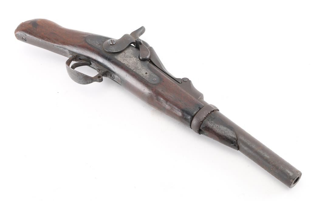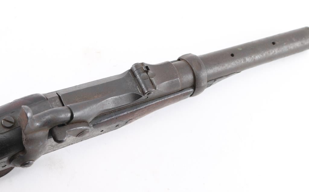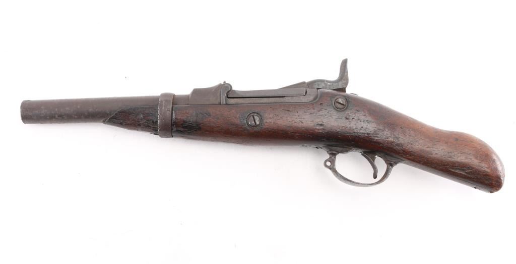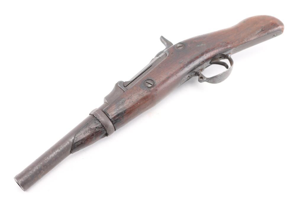 SN: 502143. The term "Blanket Gun" was popularized after the ambush staged by Capt Jack in a California skirmish during the Modoc wars. Native Americans would Hide these under Blankets. The women would pack these under dresses to hide them from getting confiscation by the Cavalry. This is a Model 1884 Springfield trapdoor rifle that has been cut down, 7 3/4" barrel, 18 1/2" overall. Definably period done. Rear sight removed, standard Springfield marking. Action works well. Bore is dark/rough, metal surfaces are covered with a brown patina with scattered pitting. Has seen hard use. A rare legitimate Blanket Gun. Antique Firearm.