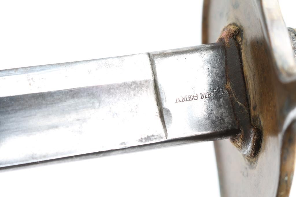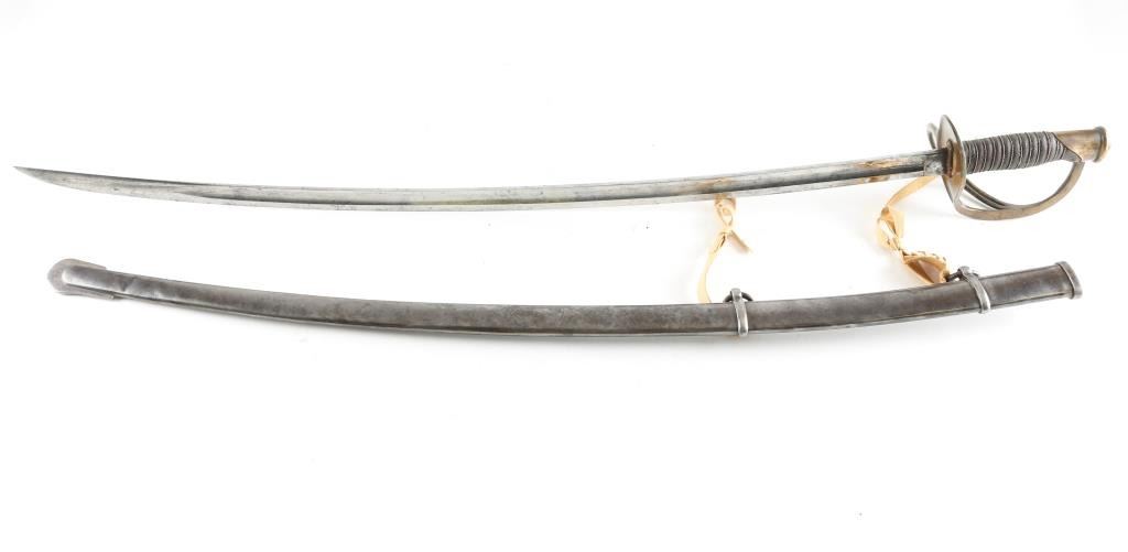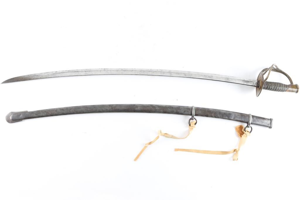 U.S. Model 1860 Light Cavalry Saber and scabbard, the principal sword used by cavalry troopers during the Civil War and Indian Wars that followed. It was manufactured by Ames Late-Civil War period enlisted man's saber. The 34 3/4' curved blade has a 27 1/2" broad fuller and a 18 1/4 inch narrow fuller. Blade has much original polish and a few minor patches of light staining and scuffing. The reverse ricasso is marked "AMES MFG. CO." in block letters. No other markings. The original leather buffer-pad is present at the guard. The wood grip is covered in black leather and wound with twisted brass wire, all original with some flaking/wear to the leather. The brass, half-basket guard consists of a knuckle-bow with two branches on the obverse side meeting an oval counterguard. All brass components have a nice, aged patina and are in excellent condition. The scabbard is bright steel, straight, with a couple of shallow "door" dents. The lack of Military markings may indicate sale to state contract, or contract overrun that was sold commercially.