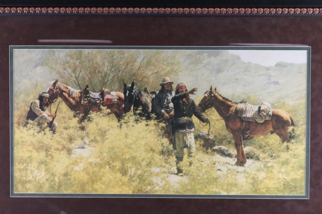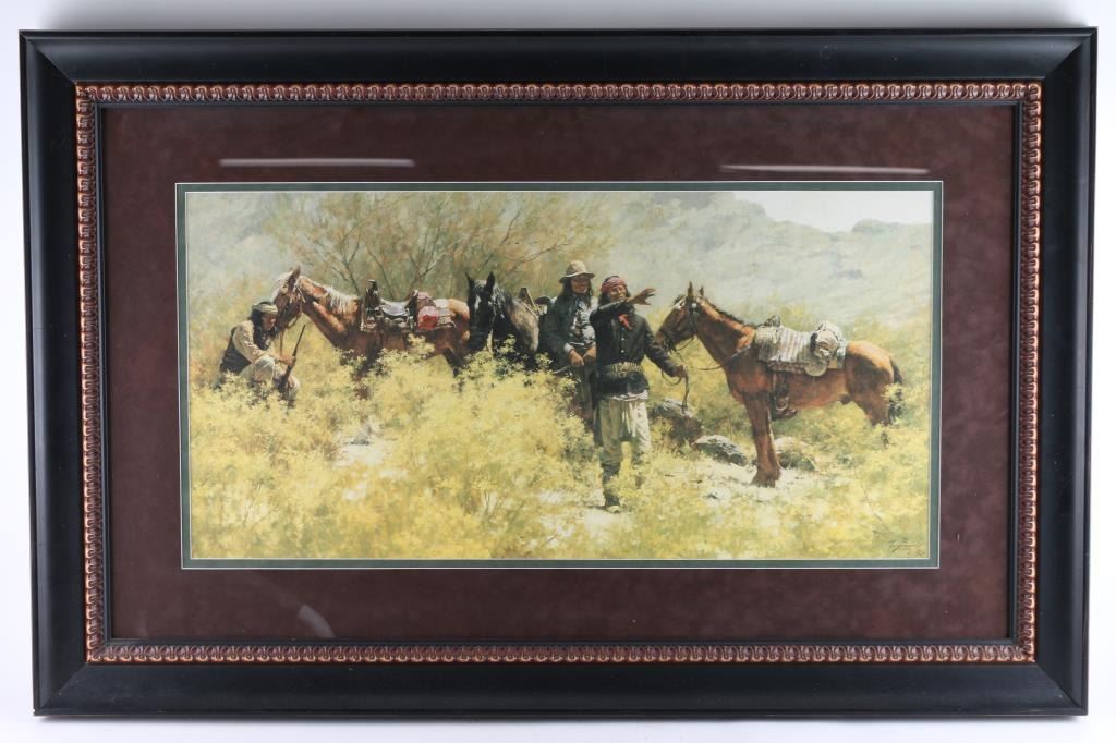 By well known artist "Howard Terpning " entitled "Scouts Of General Crook" produced by Mint Le print company. Signed and numbered 860/1000 signed lower right. Measures 32x18".