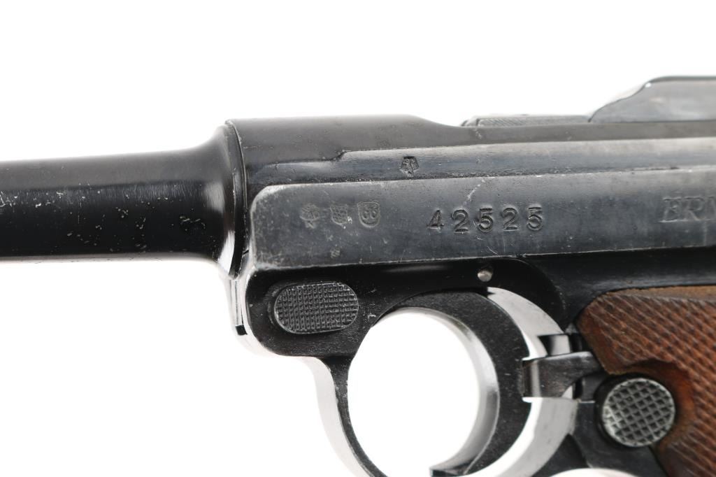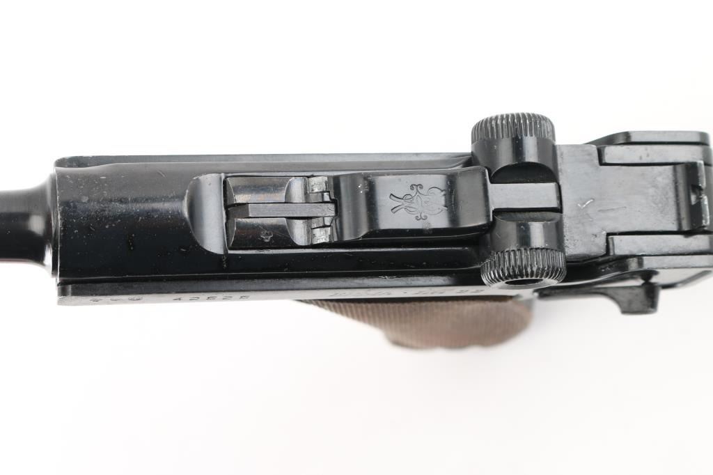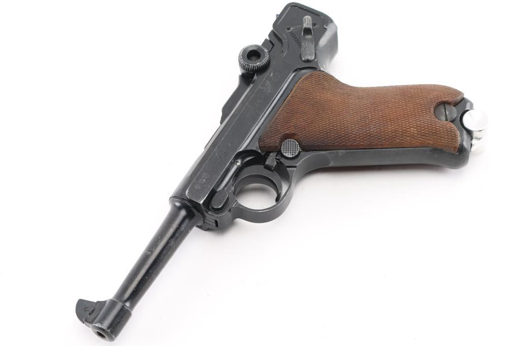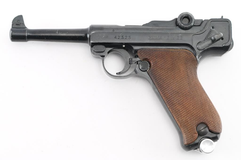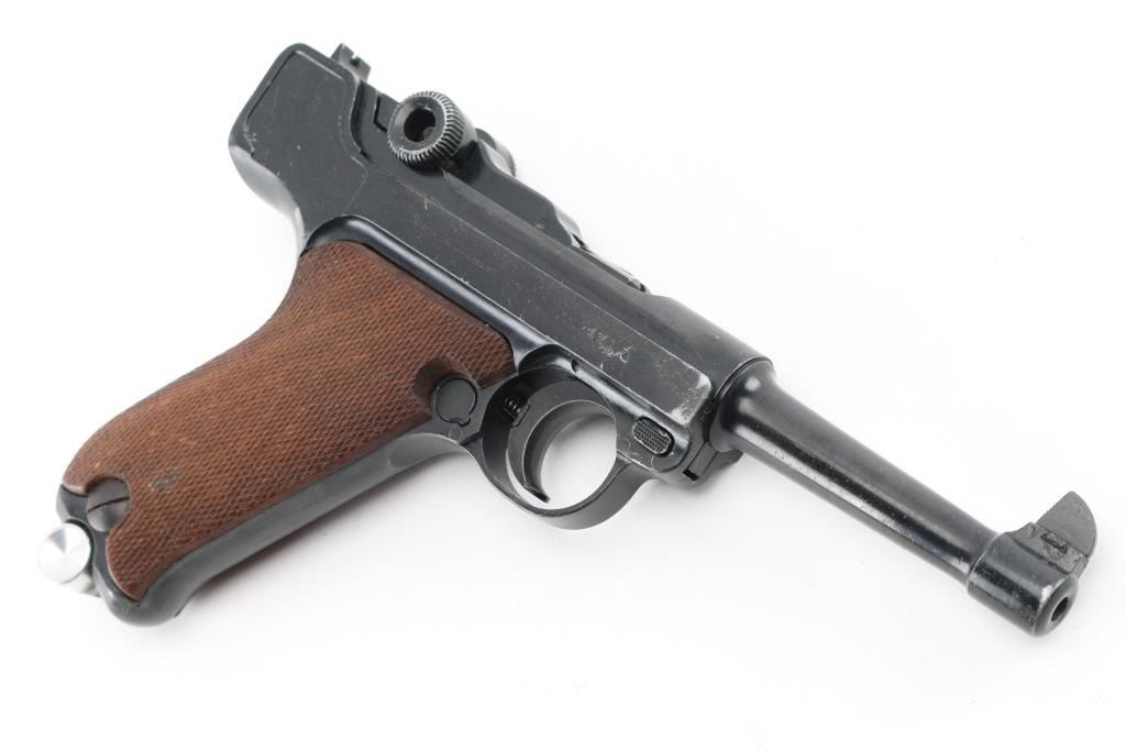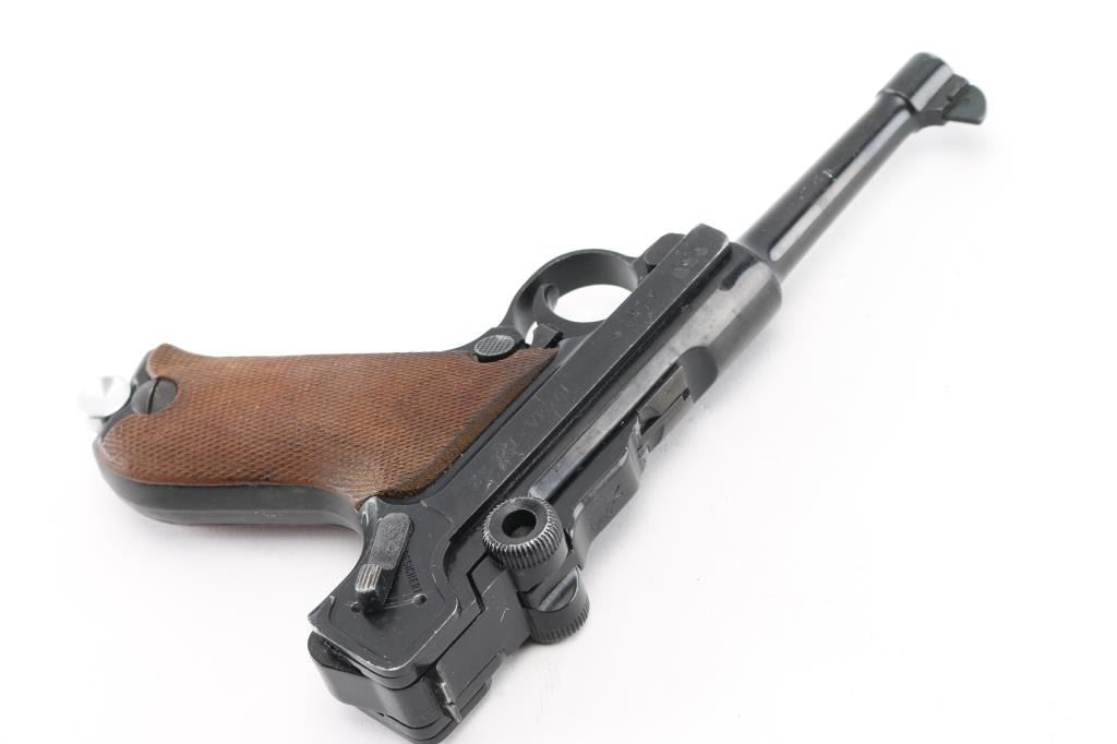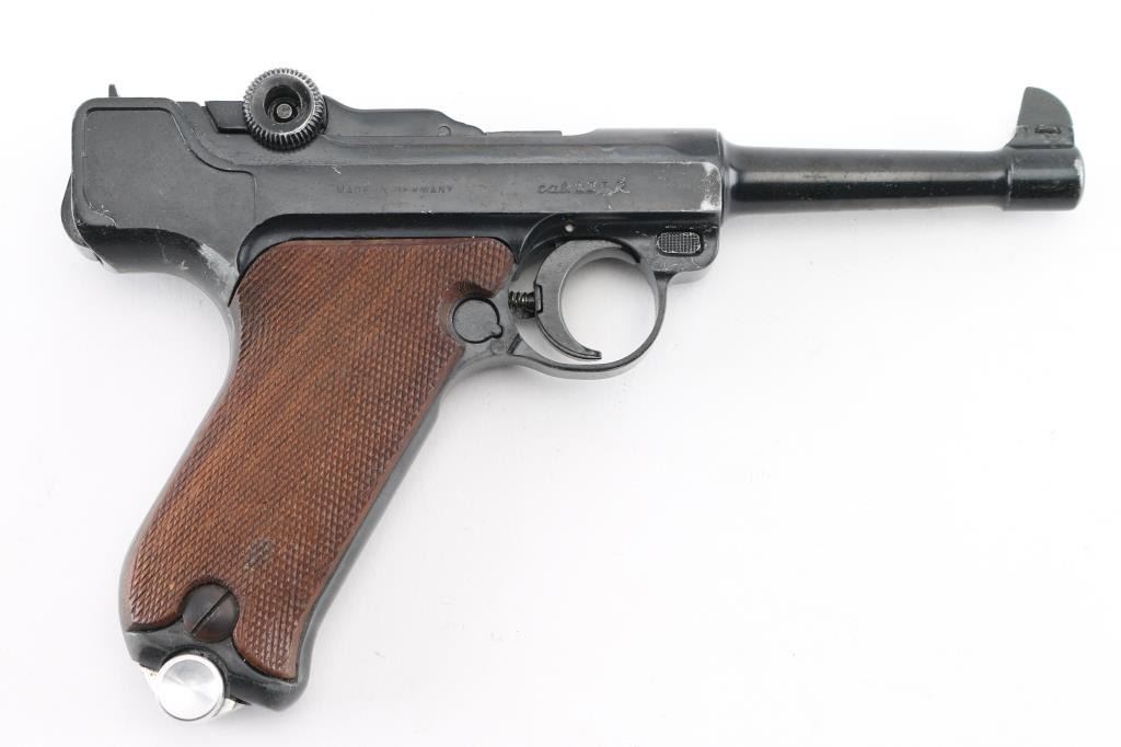 German made semi auto pistol in the Luger style, chambered for .22LR ammunition, circa 1966. Blued finish, smooth wood grips, 4.5" barrel, good bore, fixed sights, and two magazines. NRA Condition-Good. C&R Firearm.