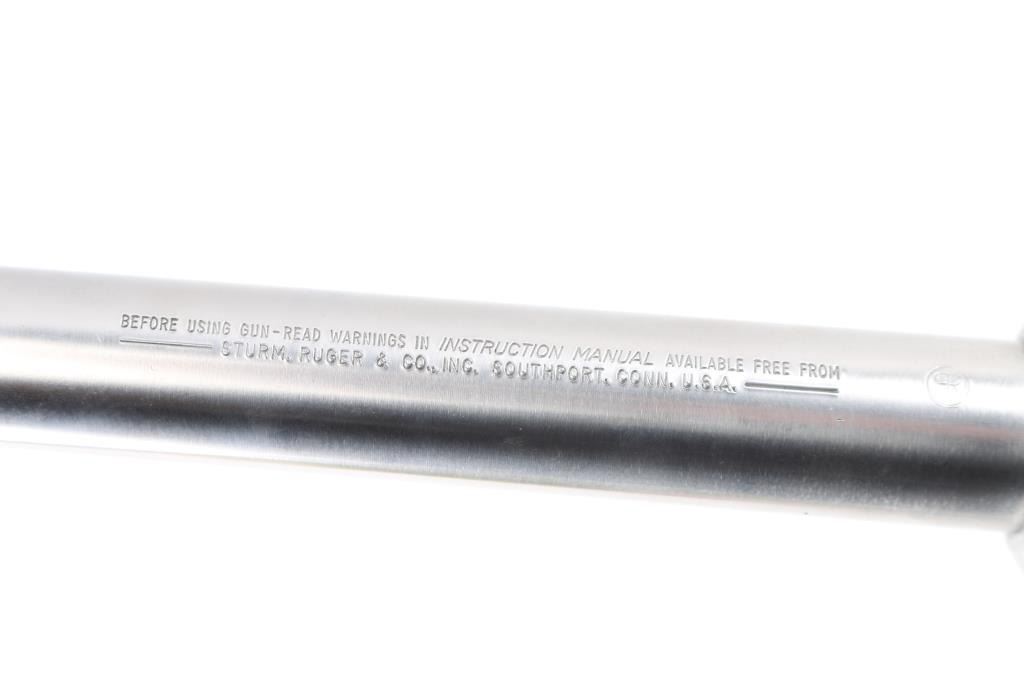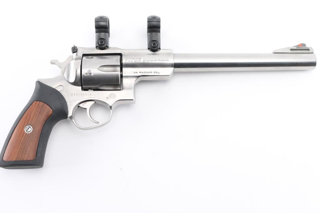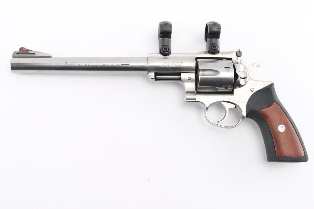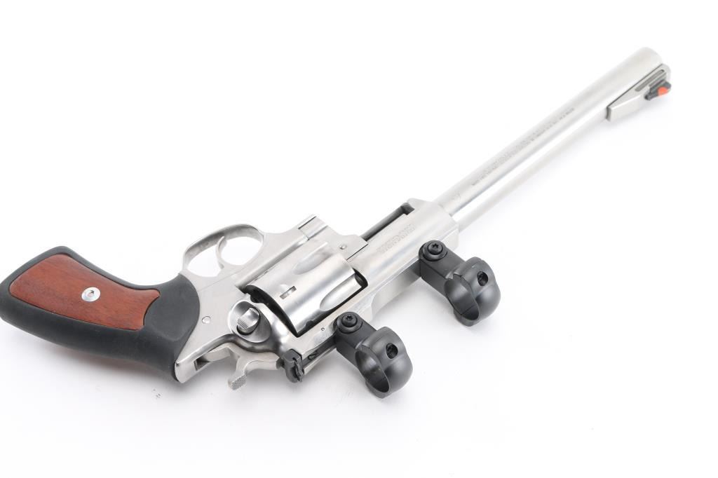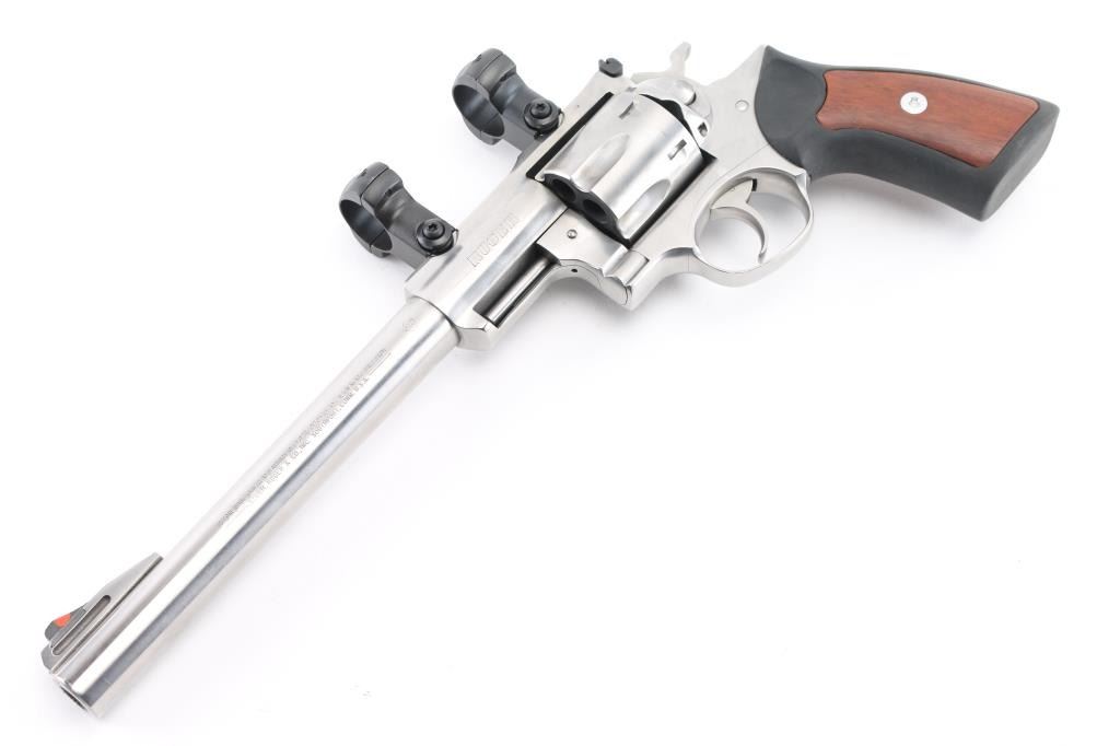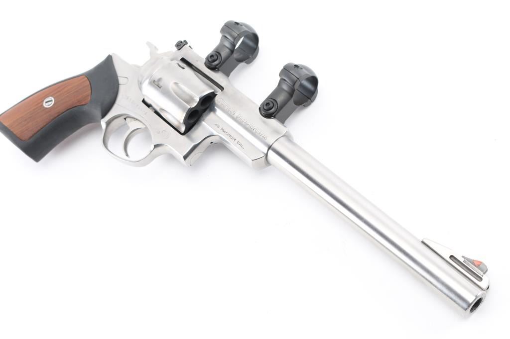 Large frame stainless steel double action revolver chambered in .44 Magnum. Features a brushed finish, 9.5" barrel, raised ramp front sight with orange insert, adjustable rear sight, shrouded ejector rod, fluted six shot cylinder, smooth trigger, knurled hammer spur, transfer bar safety, extended frame with integral scope base cuts in the top strap, with rings installed. and black rubber grips with woos panel inserts. Bore is excellent/bright.. Overall the revolver is excellent with a few very minor scratches, grips are fine, action is smooth with tight lock-up. Condition is NRA Excellent. Modern Firearm.