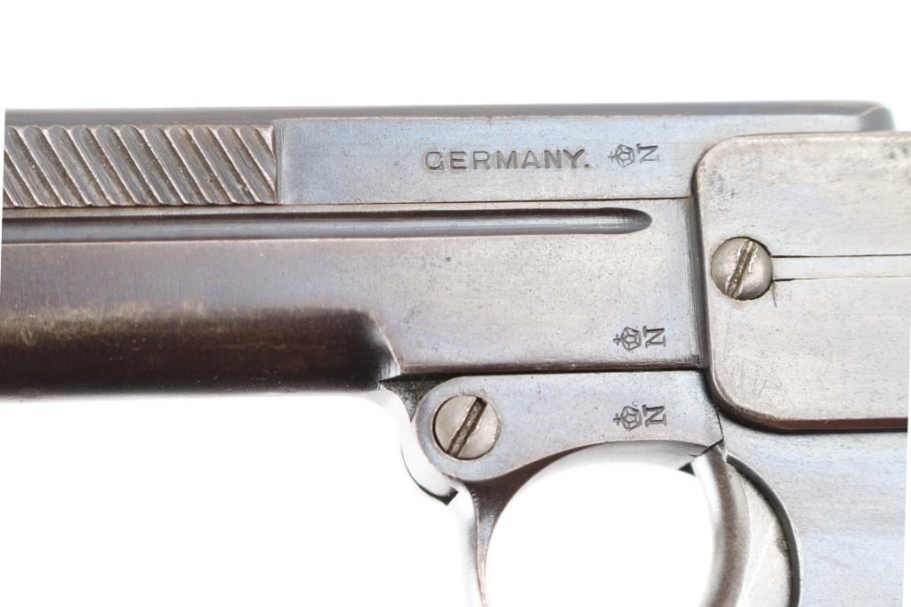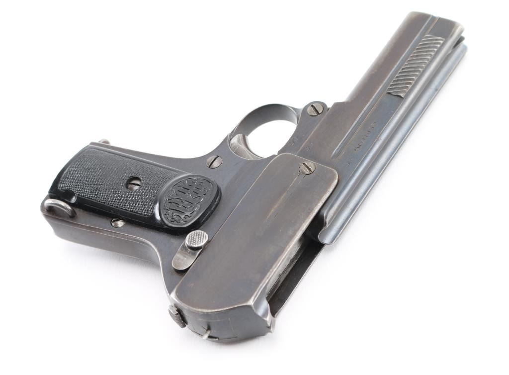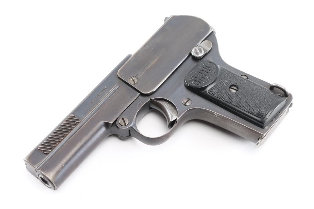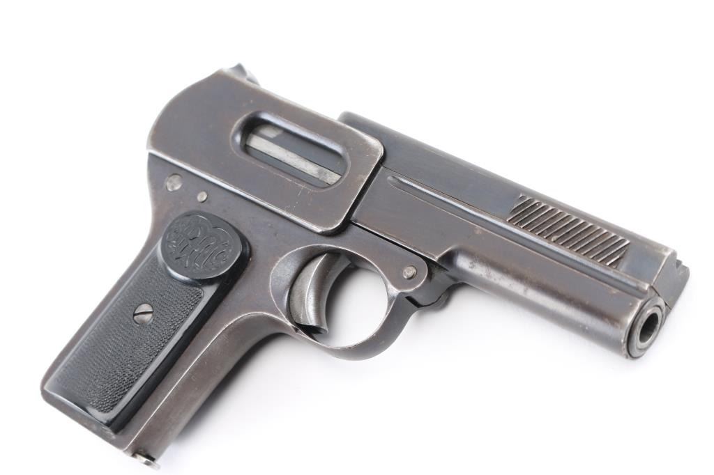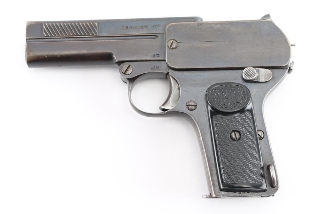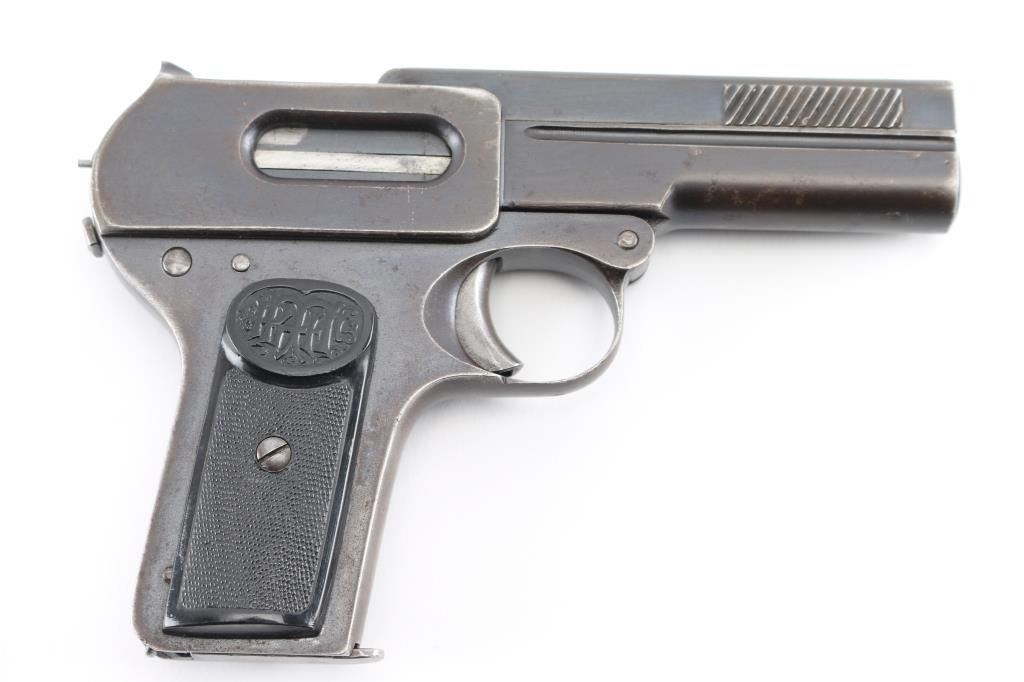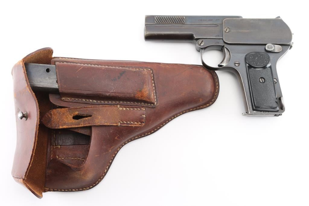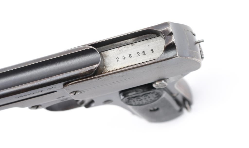 German striker fired semi-automatic pocket pistol chambered in 7.65mm Browning, manufactured circa 1907-1915. Features a blued finish, 3.7” barrel, fixed sights with ‘v’ front & inverted ‘v’ rear, smooth trigger, manual safety on the left side of the frame, cocked indicator, heel magazine release, 7 round magazine, steel frame with lanyard loop on the left side and checkered two-piece horn grips with “RMF” monograms. Bore is good to very good, a bit frosted, strong rifling. Retains 75% finish, thinning and fading, showing some brown tones, edge losses. Grips are very good. Includes two magazines and fair condition flap holster. Condition is NRA Very Good *** C&R Firearm ***