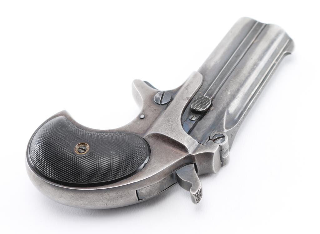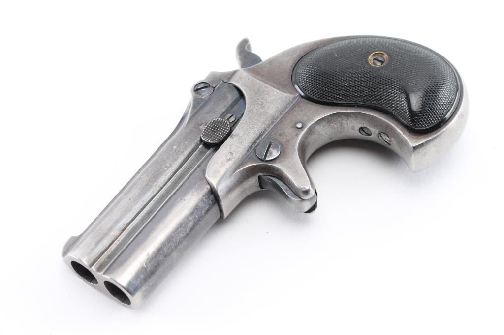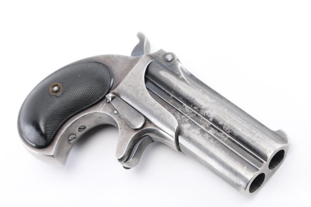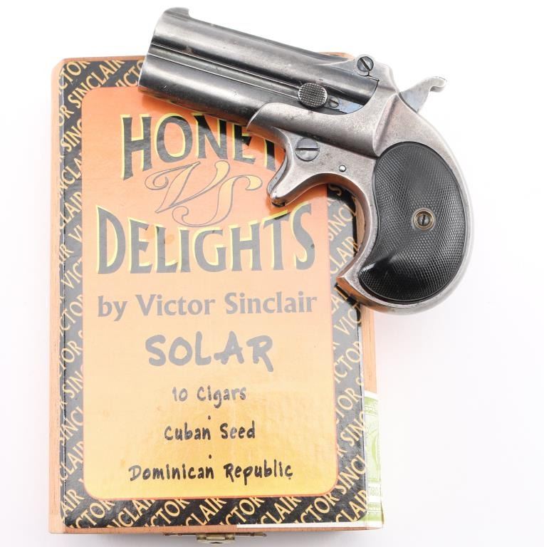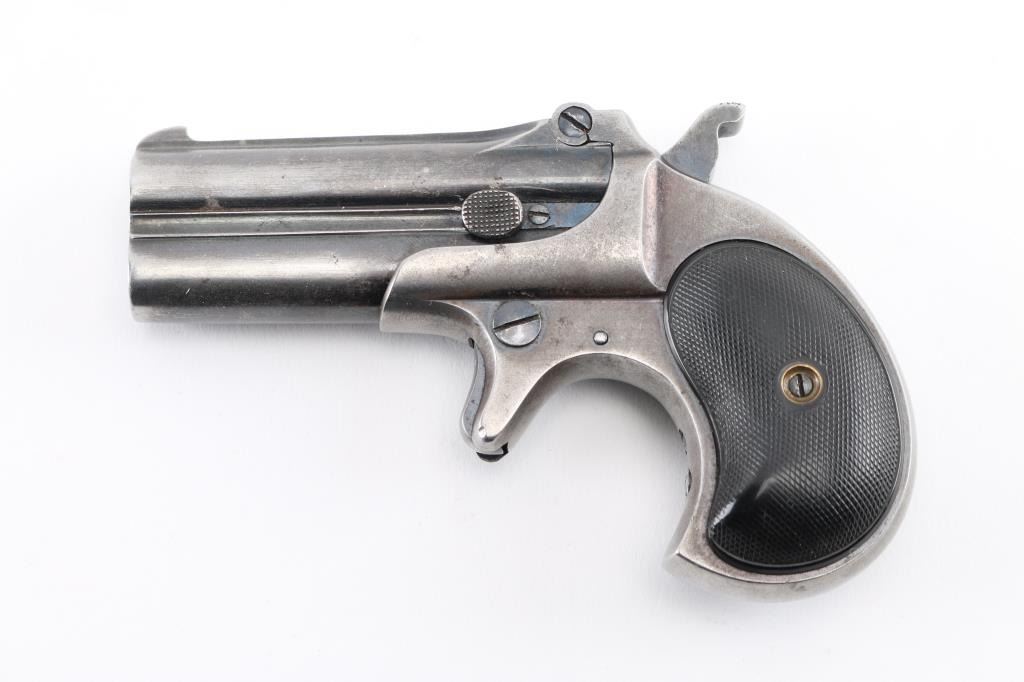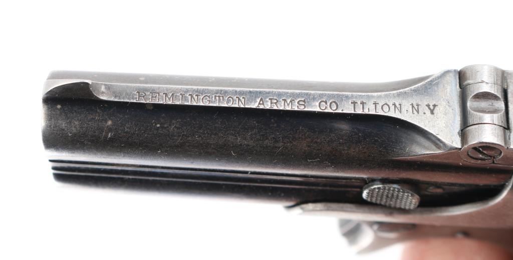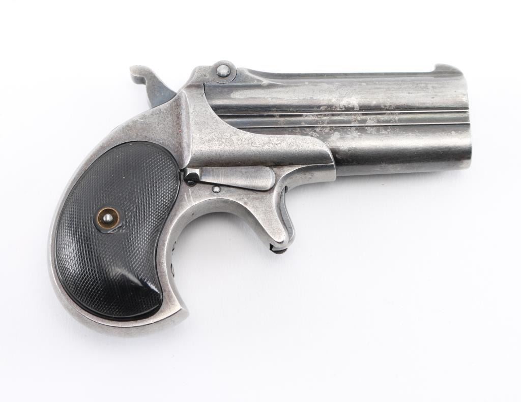 SN: 857 "Type II" Vintage over/under double barrel derringer chambered in .41 Rimfire Short, manufactured circa 1888-1911. Features blued finish, 3" barrels with solid sighting rib marked "REMINGTON ARMS CO. ILION, N.Y", fixed blade front sight, 'u' notched rear sight, smooth spur trigger, knurled hammer spur, manual extractor, auto-rotating barrel selector, steel frame and two-piece checkered black hard rubber grips. The frame is stamped with batch # 857 under the grips. Bore is fair condition, showing frosting throughout, some light pitting. Retains 10% finish, mostly a grayish color with some darker colors or black in protected areas, bright blue on extractor. Grips are good, showing smoothing. Action is smooth with clean let-off. Condition is NRA Good *** C&R Firearm ***