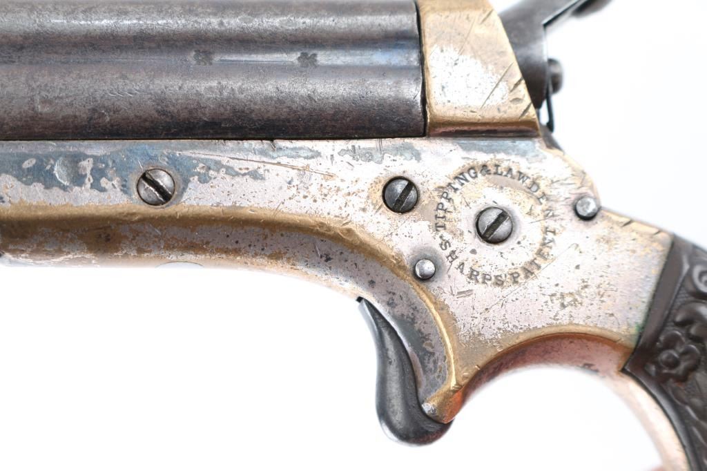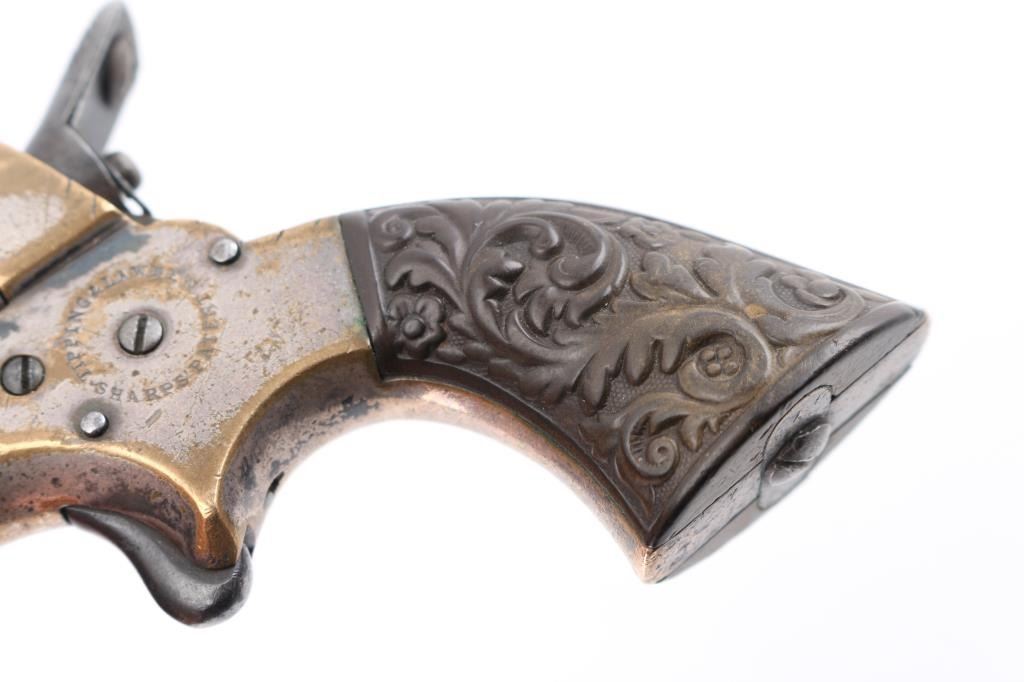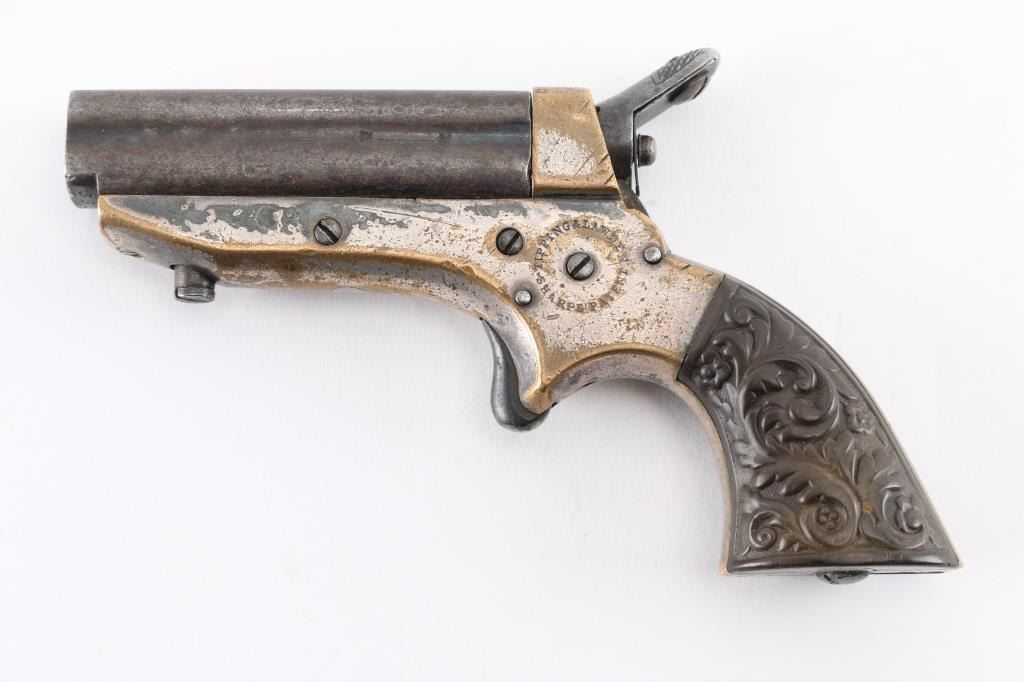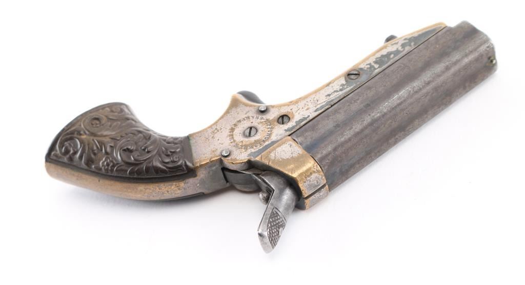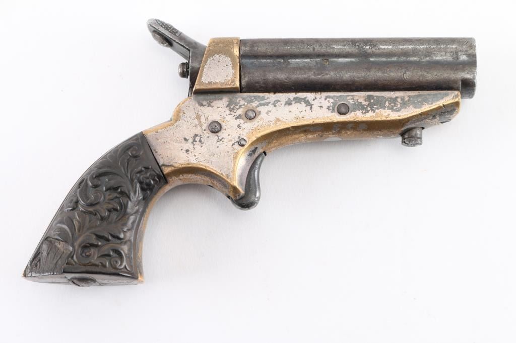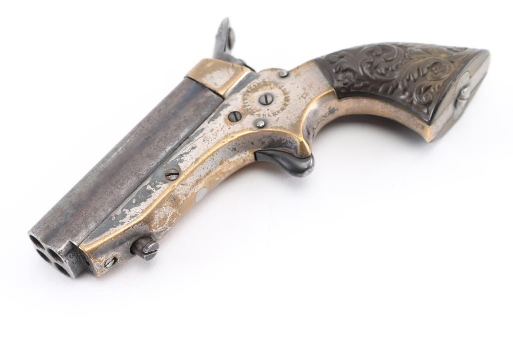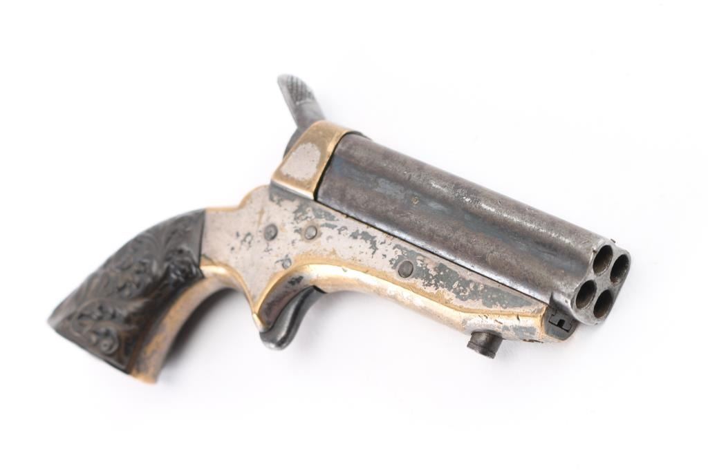 SN: 3311 Four shot deringer made in England under license. Features 2.5" barrels, small bead front sight, rear sight groove, knurled hammer, spur trigger, single action, nickel plated brass frame, floral motif gutta percha grips. Rotating firing pin indexes when cocked to fire each barrel in turn. Bores are fair, dark with little rifling remaining. Finish on barrels has turned gray, showing much thinning and cleaned light patina. Frame shows much brass, with traces of nickel, some dark patina on remaining nickel. Grips are fair to good, with shallow chips. Action works properly. Condition is NRA Good *** Antique Firearm ***