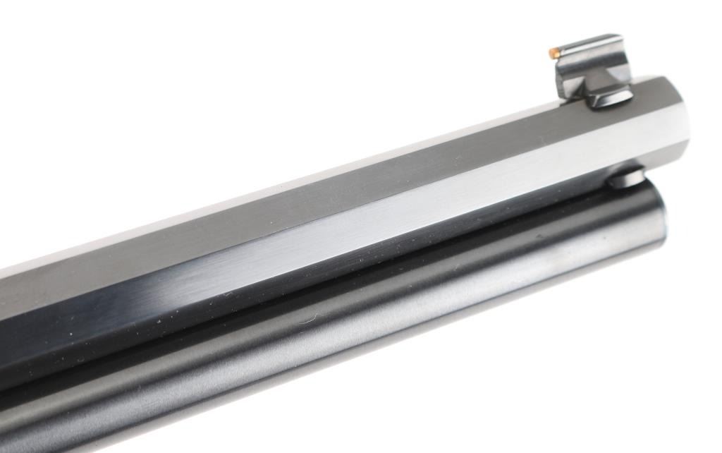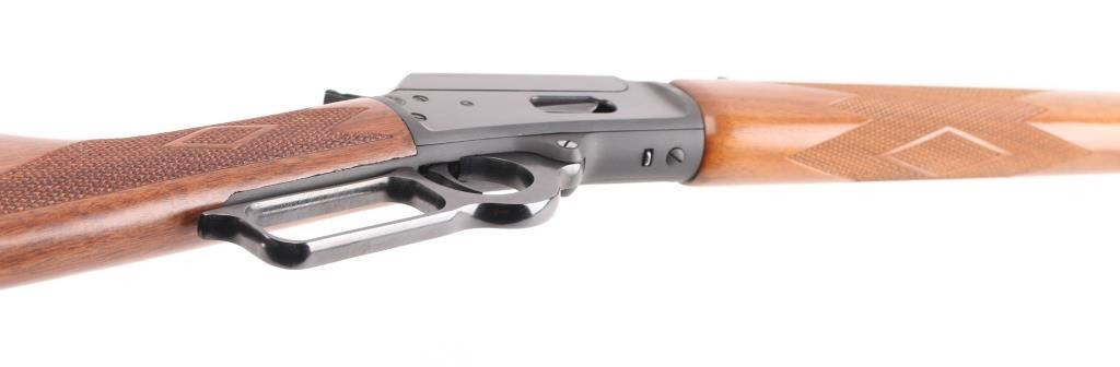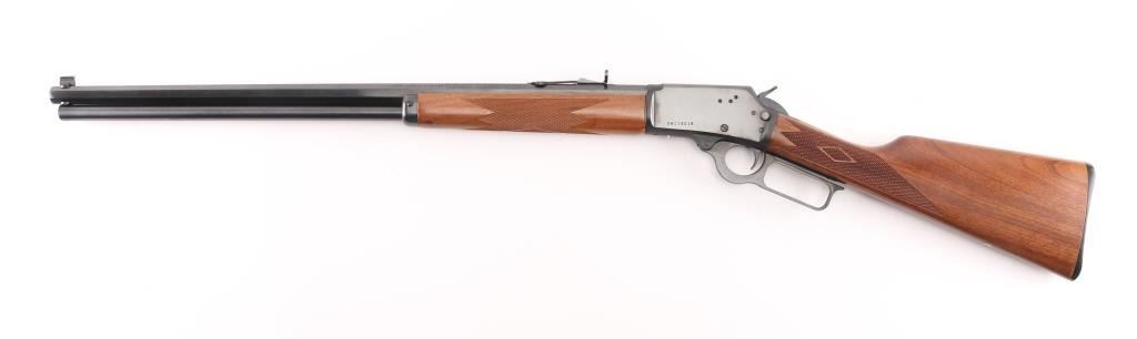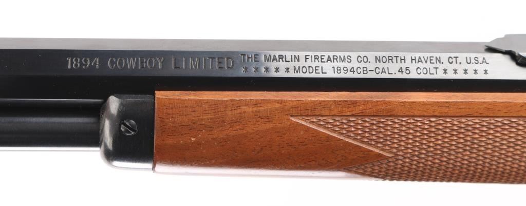 Cowboy Limited'. Lever action rifle features blued finish, 24" octagon barrel, blade/brass bead front sight, buckhorn rear sporting sight, full length magazine tube held to barrel with a screw (no bands), pushbutton cross bolt safety. Two piece walnut stocks are checkered, straight wrist, with a checkered black plastic Marlin buttplate. Bore is pristine. Blue is excellent. Wood is excellent. Like new condition. Condition is NRA Excellent. Modern Firearm.