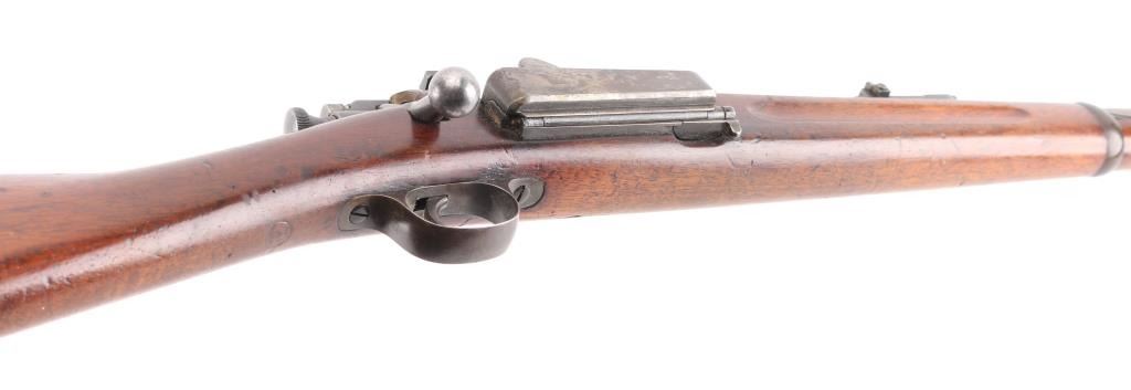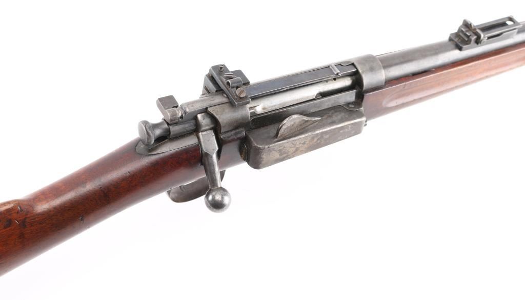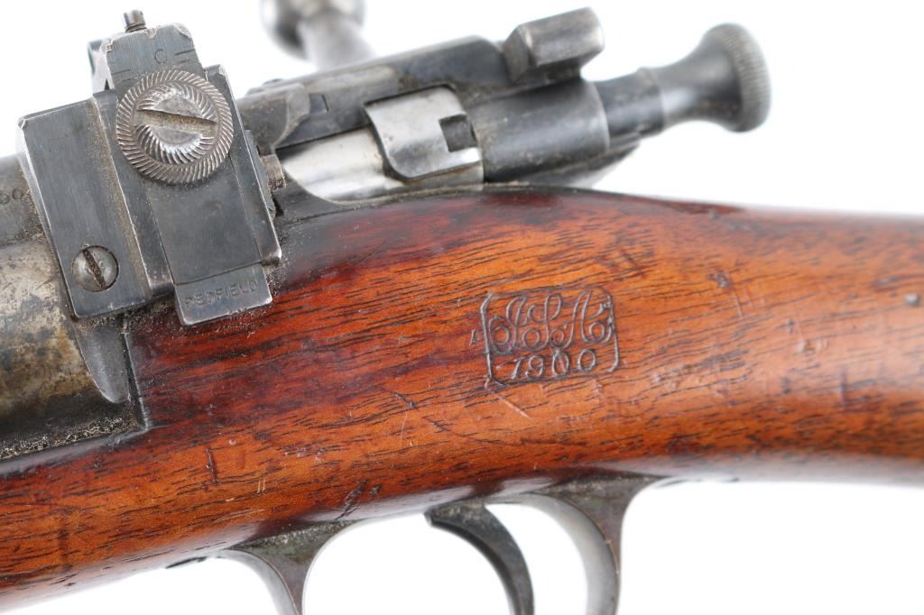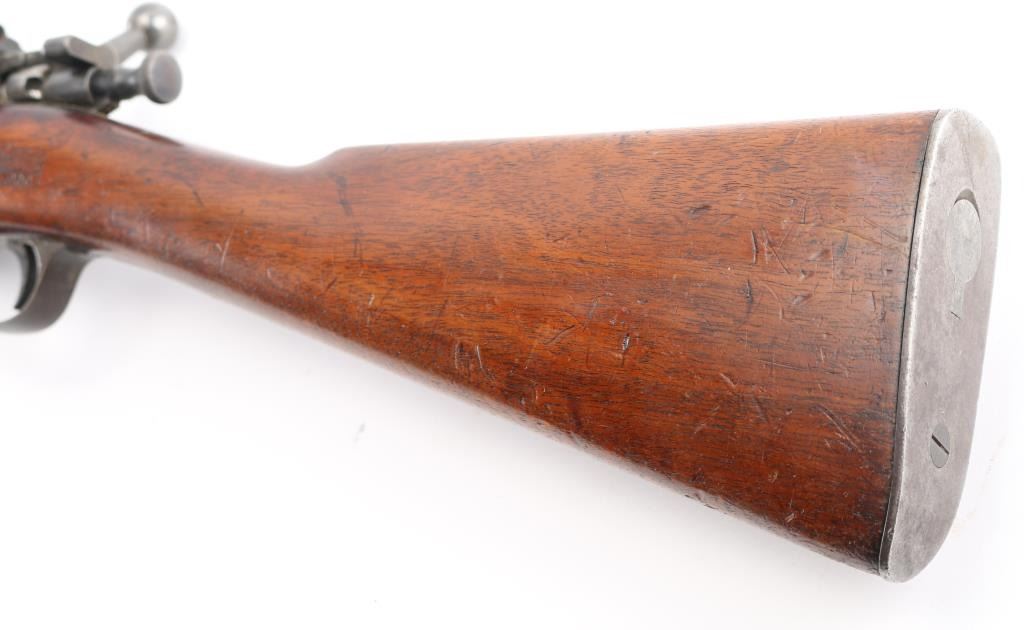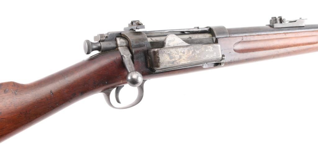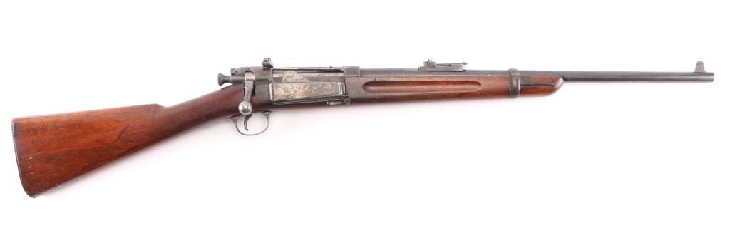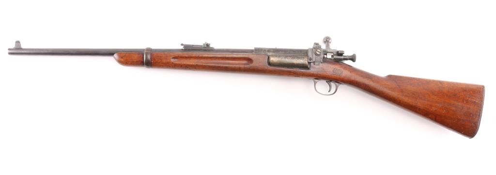 U.S. Military bolt action carbine chambered in .30-40 Krag, manufactured circa 1900. Features a blued finish, 22" barrel, marble blade/blade front sight, windage adjustable flip-up ladder style rear sight(with "6" & "3" stamped on the base) graduated to 2000 yards, a Redfield adjustable aperture peep sight installed on left receiver single barrel band, side-mounted hinged magazine with cut-off on the left side of the receiver, straight bolt handle, 'headless' cocking piece, Mauser style safety, smooth trigger, no sling swivels, no handguard and straight grip shoulder stock with finger grooves in the forend & trapdoor metal buttplate. Rifle retains about 40% of it's blued finish with the majority of the metal surfaces turned to a grey/brown patina. Action is smooth, the bore is fair, dark, good rifling, the markings are clear and the wood stocks are good "JSA" 1900 cartouche on left wrist, circled "P" proof, and a small "48" behind triggerguard. Condition is NRA Good. C&R Firearm.