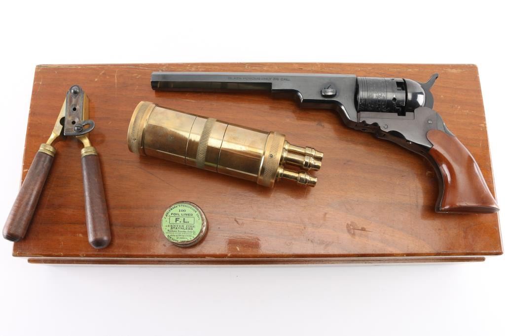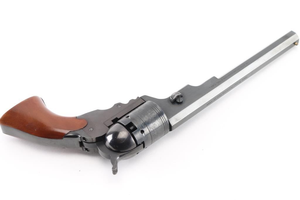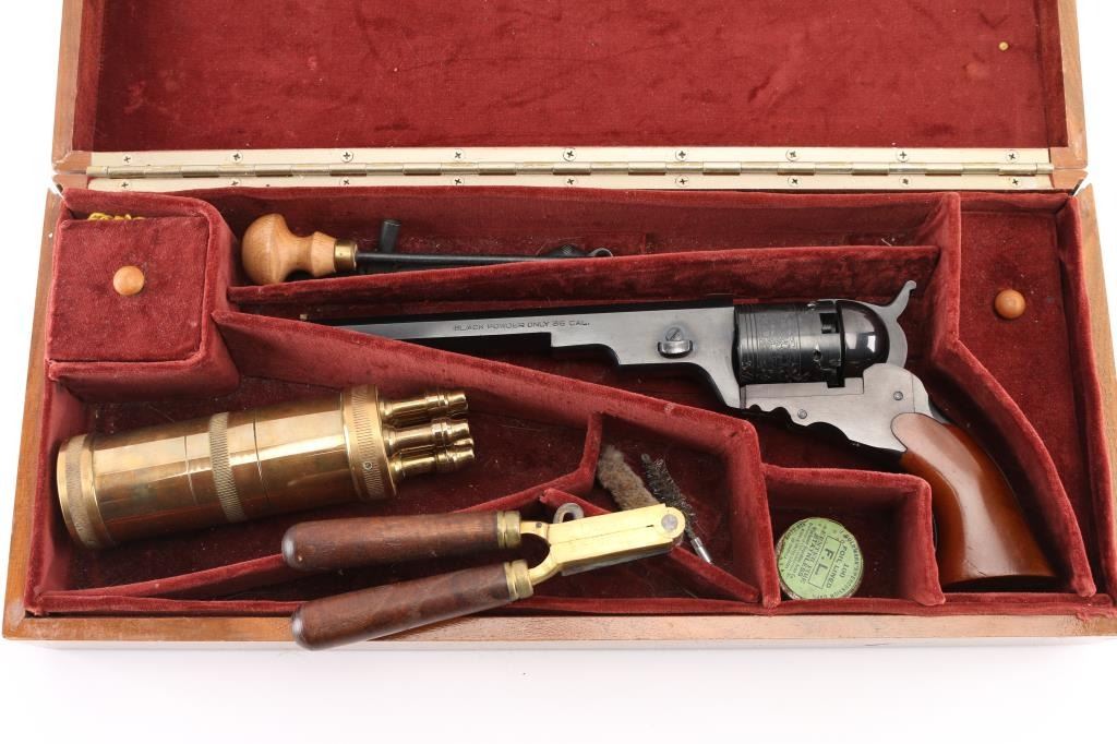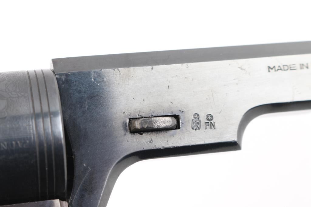 SN: 1145 Italian made reproduction of the Colt Texas Paterson (or "Patterson") single action revolver. Black powder only cap 'n' ball. Features blued finish, 7 1/2" octagon barrel, small brass round blade front sight, 'v' notch rear sight cut into the hammer, non-fluted five shot cylinder with roll-stamped stagecoach hold-up scene, folding trigger, knurled hammer spur and two piece smooth walnut grip. Bore is very good, appears unfired. Retains 90% finish with handling marks, edge wear at muzzle. Top of barrel engraved "Texas Paterson Cal 36". Includes good condition English style fitted walnut case with burgundy colored interior, with full set of accessories & tools. Condition is NRA Very Good++ *** "Antique" Firearm ***