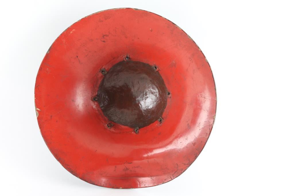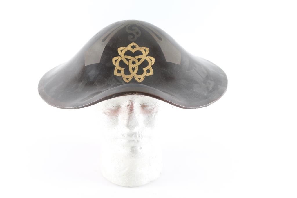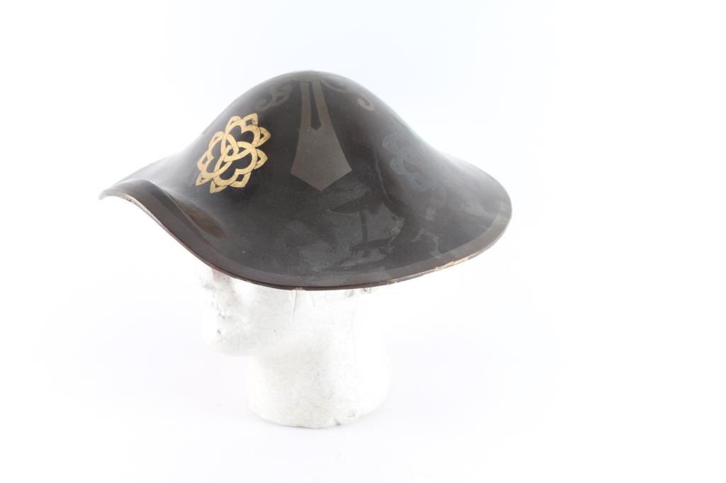Japanese light weight military helmet worn by Samurai. JINGASA ("camp hat"; helmet). These were issued to the lowliest soldiers of the Japanese War Lords (The Samurai). They were used by simple Infantry. Made from layers of paper glued together, and then lacquered to waterproof, and hold the shape. This one is brown, with hand painted symbols, including a gold symbol in front. This is the samurai Family Kamon (symbol), or the "Mon" of the Daimyo he serves. No liner. Some cracks to the lacquer, nothing serious. In the shape of Bajo Gasa (for riding).
