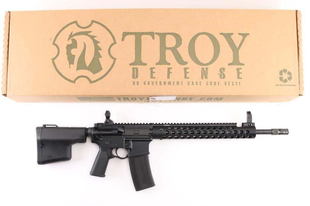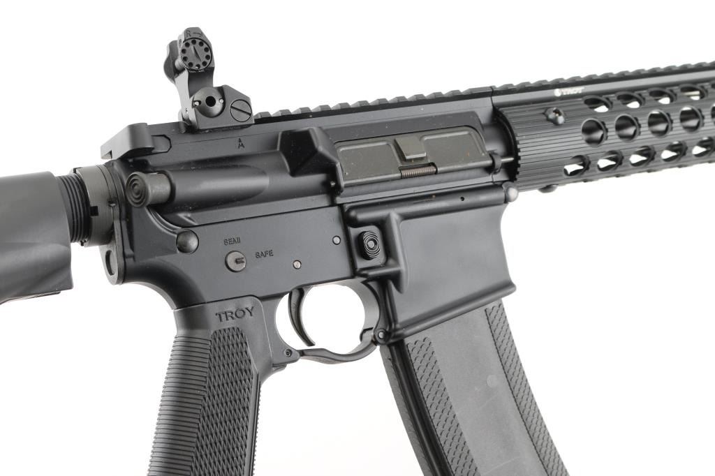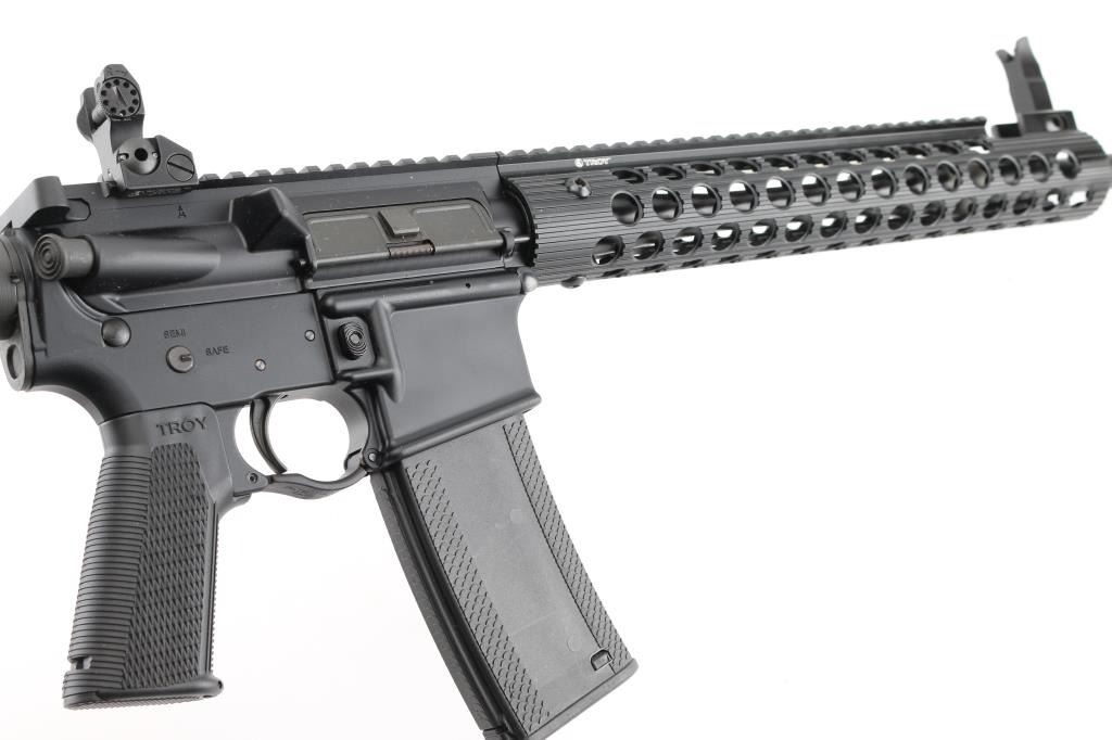 Consists of an upper and lower receiver that are forged from aircraft-grade 7075-T6 aluminum then black hard coat anodized. The 5.56 Carbine features all of the traditional M4/M16 operating controls, including a bolt-assist assembly. The bolt is made from Carpenter 158 steel and has been magnetic-particle inspected and high-pressure tested. troydefense.com.16" barrel 1:7 RH twist, Troy Medieval flash suppressor Troy Tomahawk stock assembly. Troy 13" Alpha Rail with integrated M4 folding sight. Troy BattleAx control grip. Standard Mil-Spec trigger group. Enhanced trigger guard. M4 feed ramps. Mil-Spec hardcoat anodized finish. Rear folding Battle Sight. One Troy Battle magazine. Bore is excellent, carbine is in like new condition. Comes in the original factory box with manual/paperwork. NRA Condition-Perfect in Box. Modern Firearm