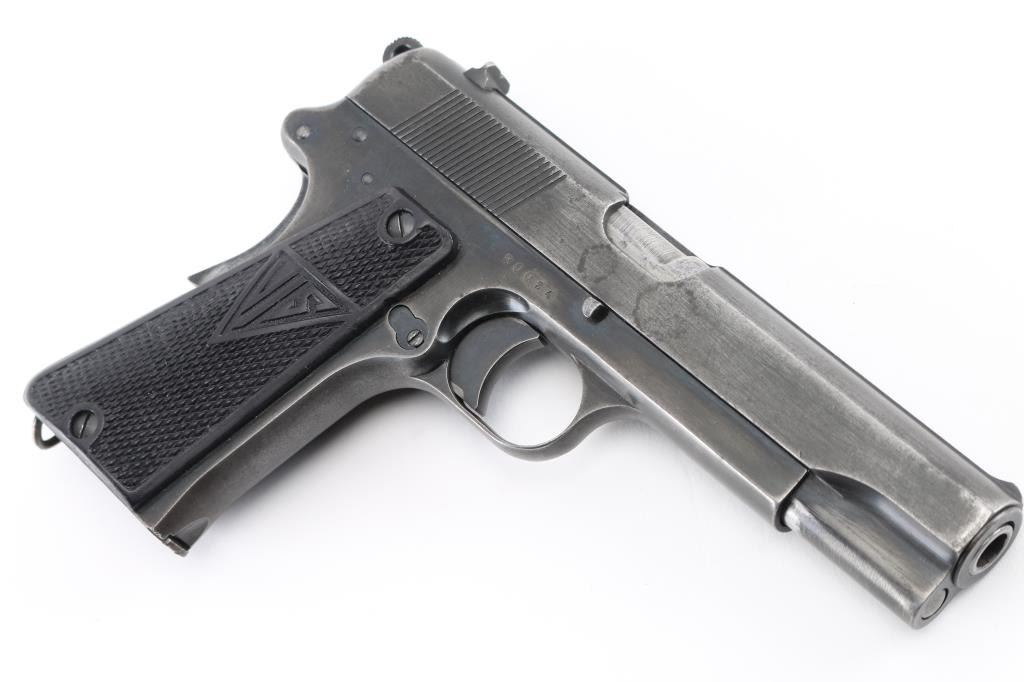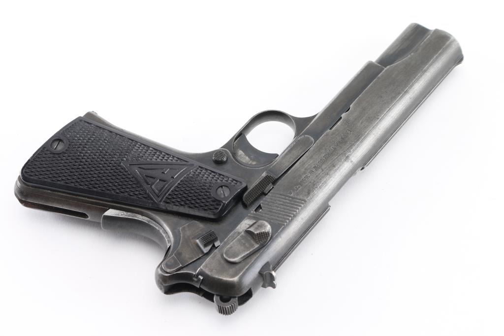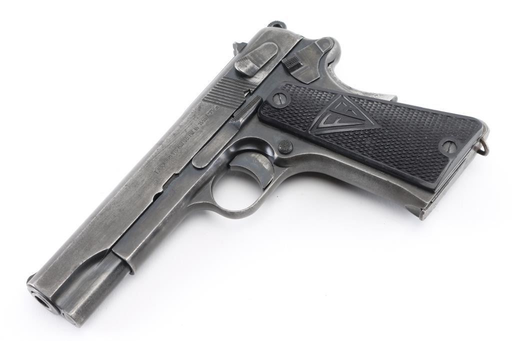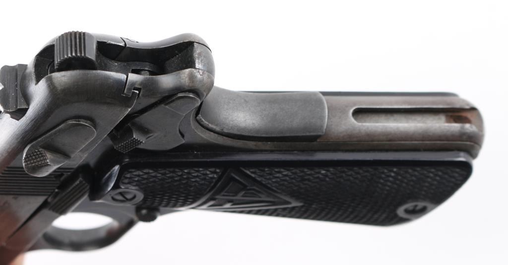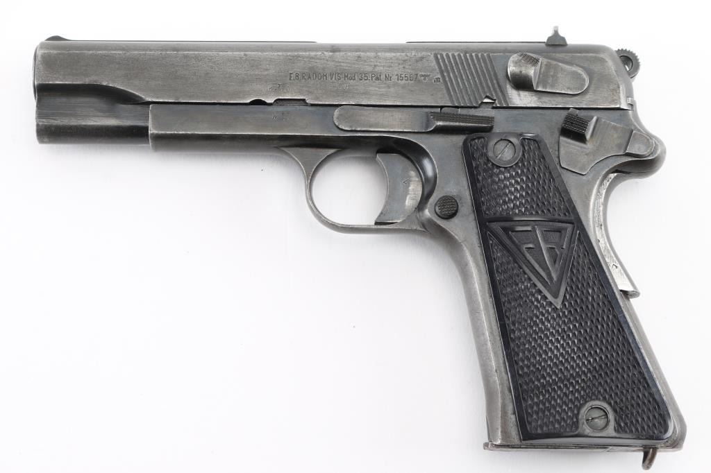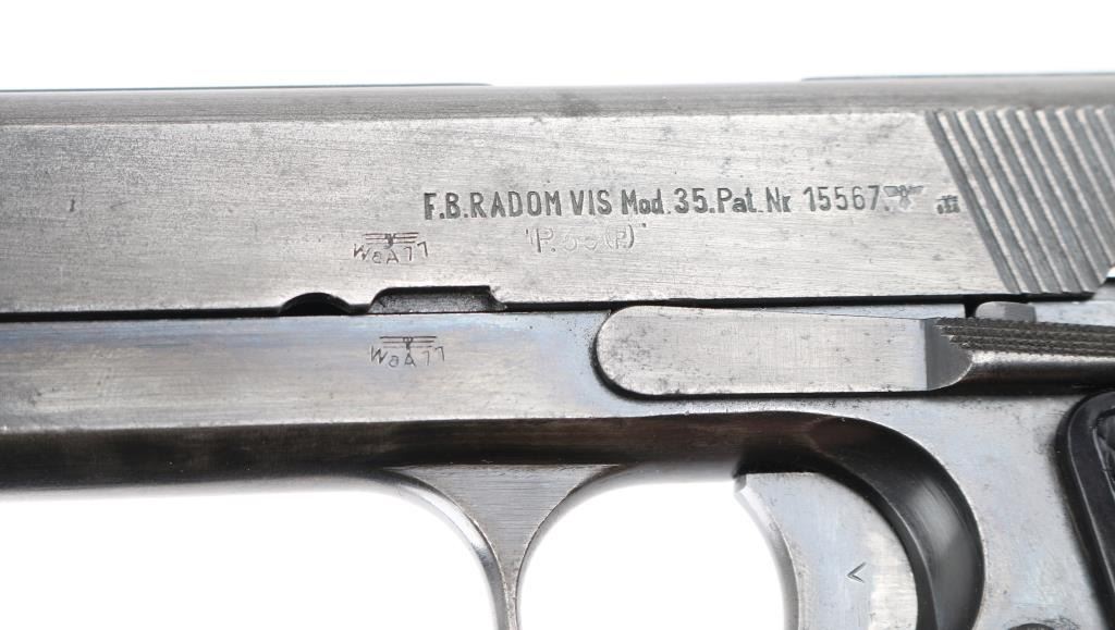 German occupation production single-action semi automatic pistol chambered in 9x19mm, produced in Poland circa 1939-1945. Features a blued finish, 4.7" barrel, low-profile patridge front sight, dovetailed rear window sight, steel frame, thumb decocker, push button magazine release, 8 round magazine, grip safety, lanyard ring, serrated round hammer cog hammer, smooth trigger, smooth mainspring housing with stock cut, and two-piece checkered black plastic grips with "FB" & "VIS" insignias. No import marks observed. Markings: Slide - "F.B.RADOM VIS Mod. 35. Pat.Nr. 15567.", eagle/77 waffenamt, eagle/swastika proof. Frame - eagle/77. Bore is very good/bright. Retains 85% coverage of a dull grayish color bluing, some brighter color in protected areas, with edge losses, bare metal from slide operation. Right side of slide shows two circular blemishes. Metal shows wartime quality machining/manufacturing marks. Grips are very good. Unmarked magazine. Condition is NRA Very Good *** C&R Firearm ***