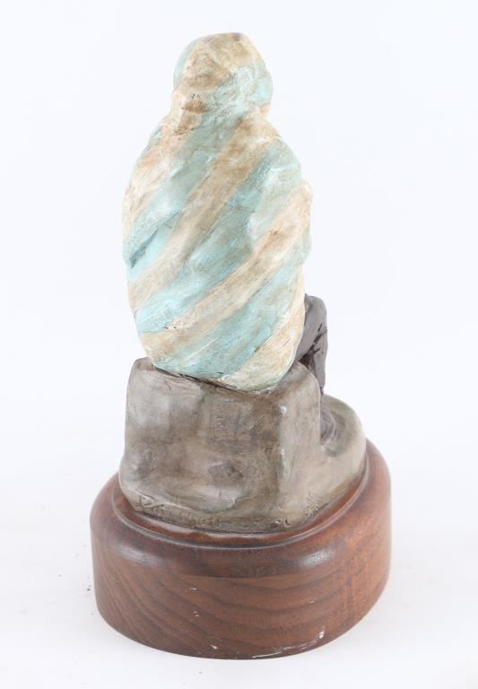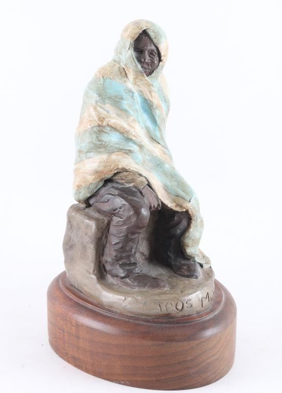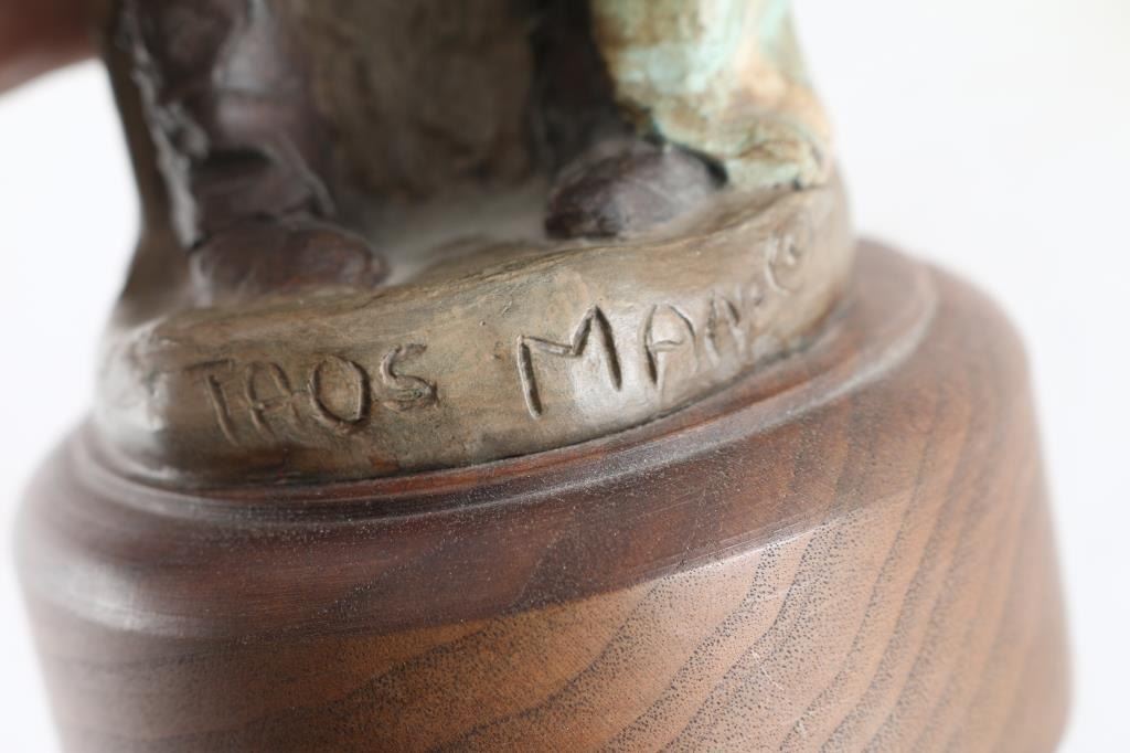 By famous Arizona artist "Pat Mathiesen" signed and artist proof on side of base. This piece is entitled "Tao's Man" mounted on wood base. Measures 8x5.5. Bio- Pat Mathiesen, a painter and sculptor of Native Americans, wildlife and other Western subjects, was born on January 15, 1934, in North Hollywood, California, growing up there. Some of her sculptures include "Wyatt Earp at the O.K. Corral;" "Spirit of Crazy Horse;" "After the Battle at Wounded Knee;" "The Steer Buster;" and "Apache Mountain Spirit Dancer." Horses are the subjects of two major commissions in the early 1970s for the American Quarter Horse Association, in Amarillo, Texas. Mathiesen's twenty-four-foot-high Indian, "One With the Eagle," was sculpted in 1989 for the Scottsdale Airport in Arizona. Pat Mathiesen has exhibited at the Grand Central Galleries, New York City, Kennedy Galleries, New York City; Tucson Museum of Art, Arizona; Mountain Oyster Club, Tucson; Phoenix Art Museum, Arizona; National Cowboy Hall of Fame, Oklahoma City; George Phippen Memorial Art Show, Prescott, Arizona; Montana Historical Society, Helena; and the Western Heritage Art Classic, Billings, Montana.