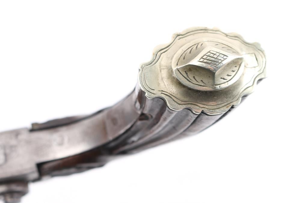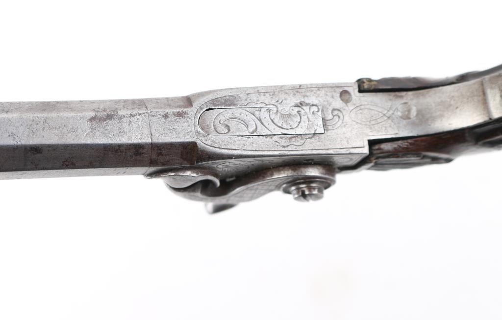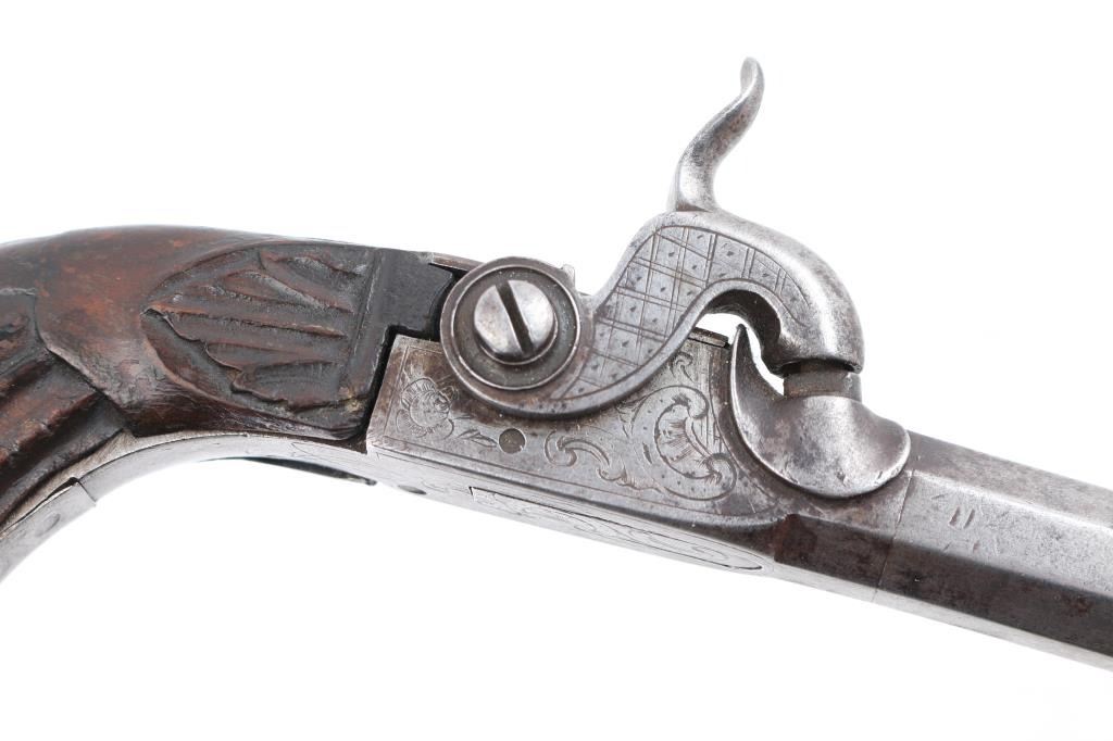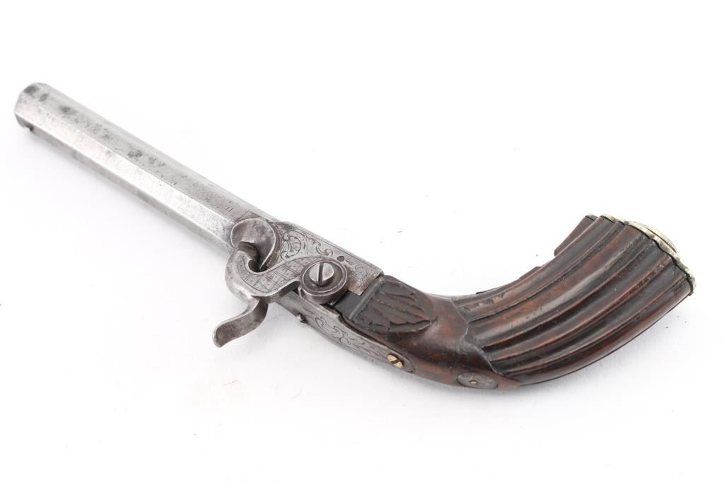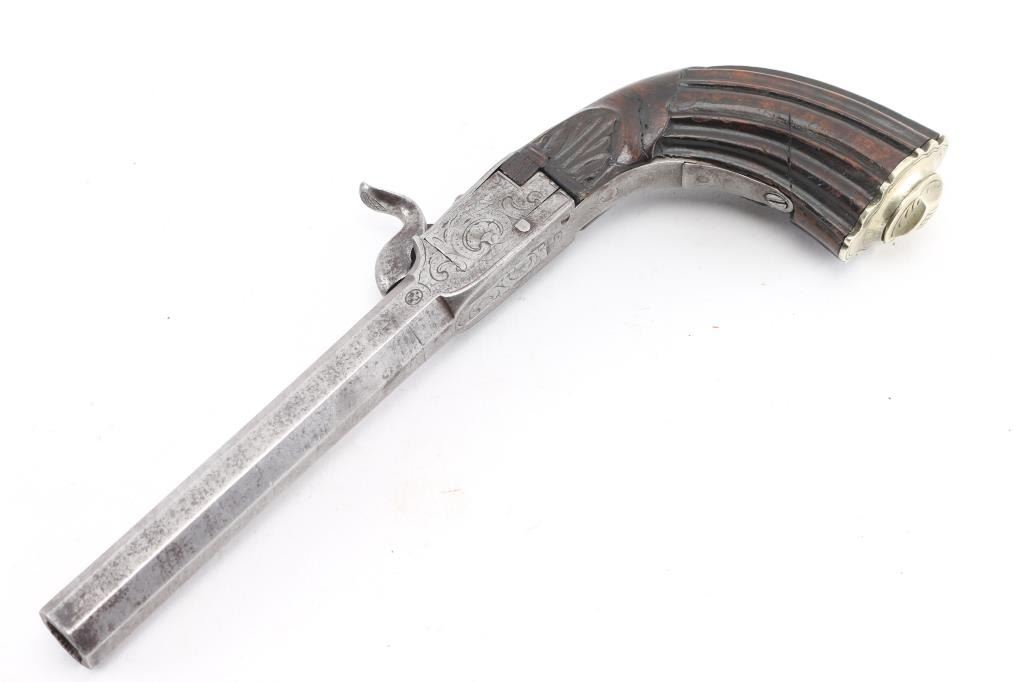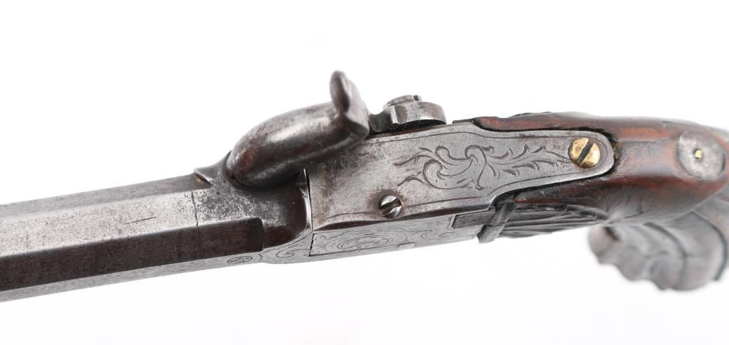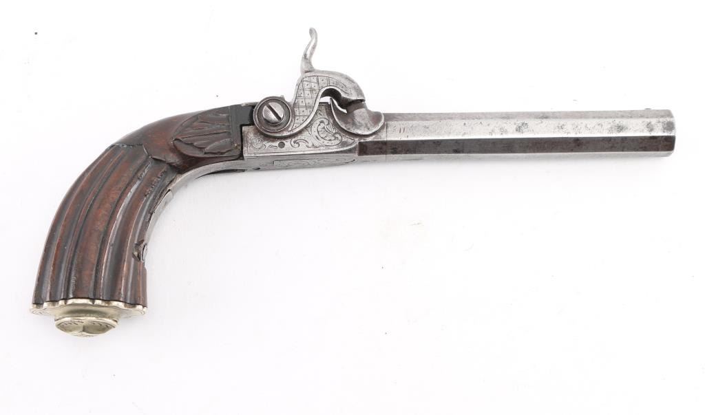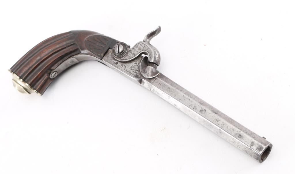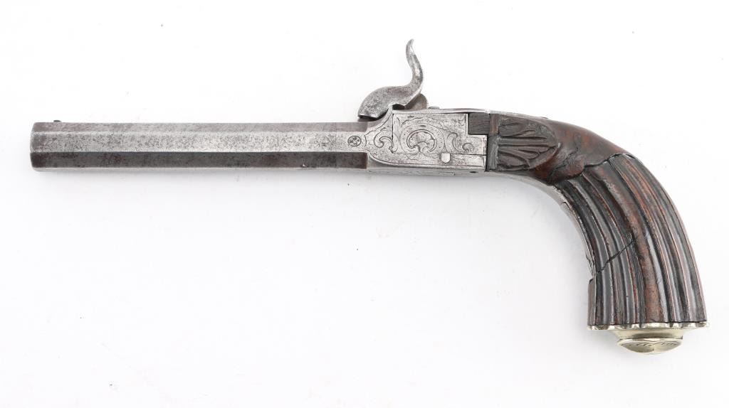 Single shot percussion pistol. Produced without sights, with a 4 1/4" octagonal Damascus twist barrel, folding trigger, Liege proof on the left side of the breech, scroll engraving on the frame, tang, hammer. The grip is fluted, with a Silver grip cap. About .40 caliber. Two cock action works well, hammer drops at full cock. Finish has has turned a gray/brown patina. Bore is dark/rough, grip is good with minor scratches, and small chip. Brass tang screw appears to be a replacement. NRA Condition-Very Good. Antique firearm.