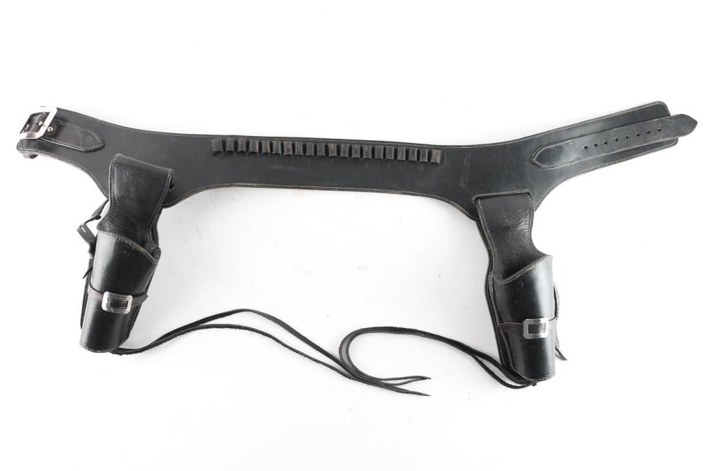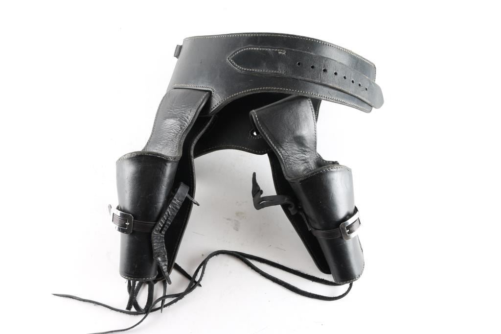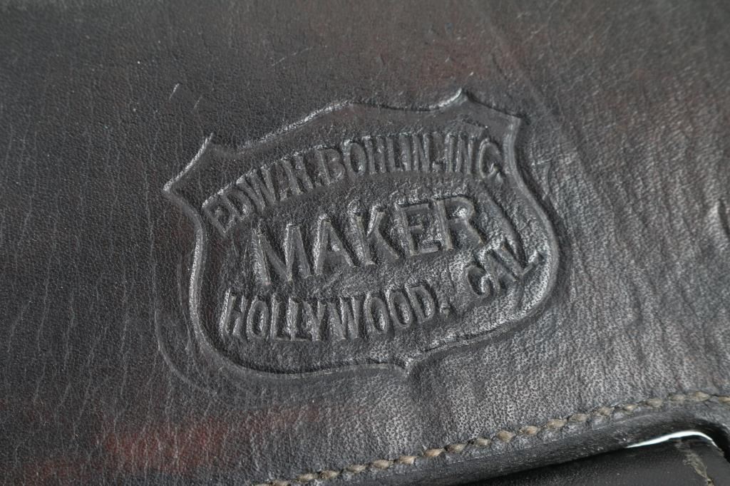 Smooth black leather maker marked three times Edward Bohlin Hollywood California. He was most well known for the high leathers made for Roy Rogers, Tom Mix and other famous cowboys. The length is 42.5" and fits waist or hip size 35"-401/4". In overall excellent condition. 1960's era vintage.