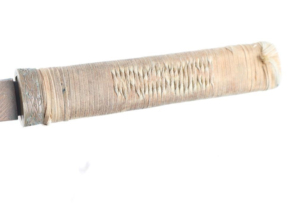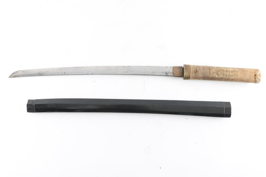 Japanese Wakizashi Shoto Short Sword with Wood Scabbard. All original, unsigned tang. Blade measures 19"' to handle. Cloth wrapped handle with engraved fitting. Blade is good/bright with no nicks. some scattered areas of light pitting. Believe WW2 era. Black painted wood scabbard is missing the metal fittings.