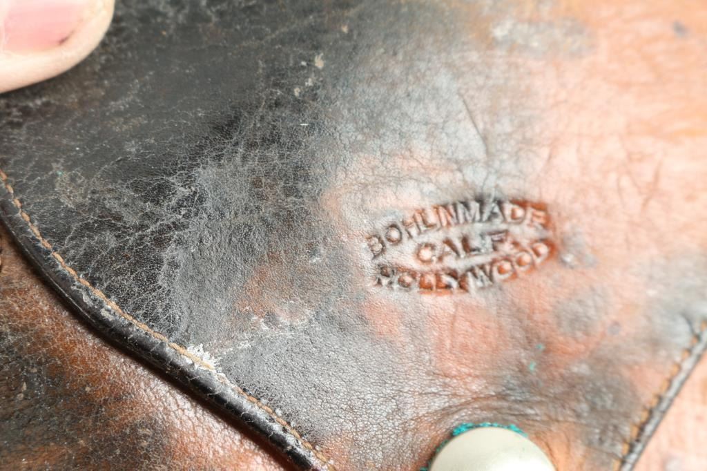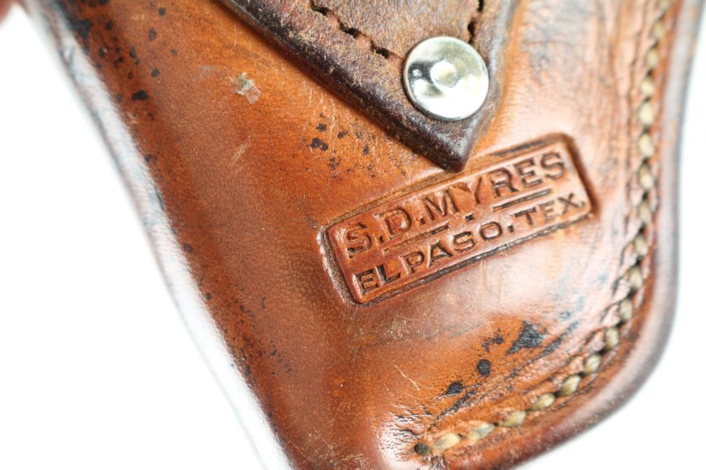 Bohlin made brown tooled single holster maker marked. And a smaller SD Myres brown tooled holster.