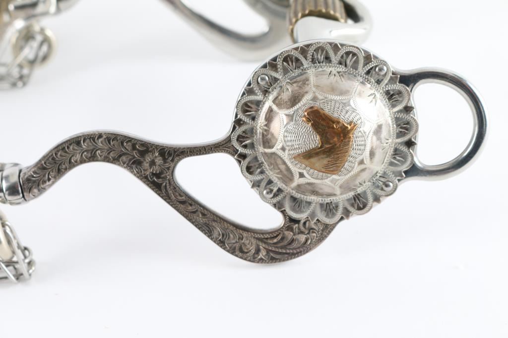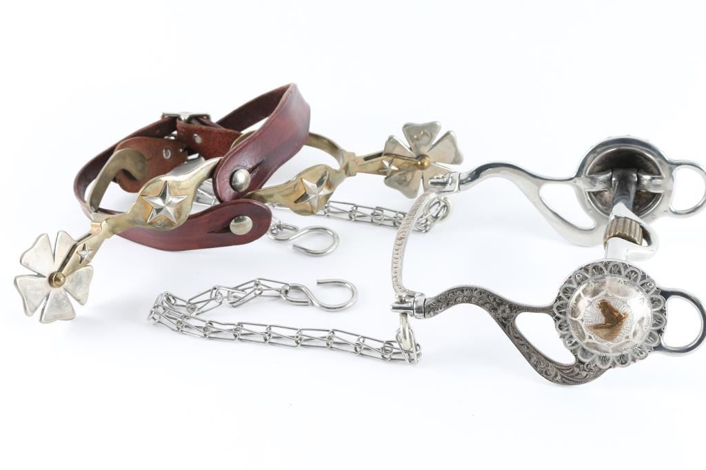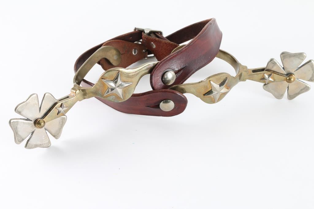 with horse head design. And a pair 4 Leaf Clover Spurs with Texas Star. Maker marked "LBB" Lind Holm Brother Brand.
