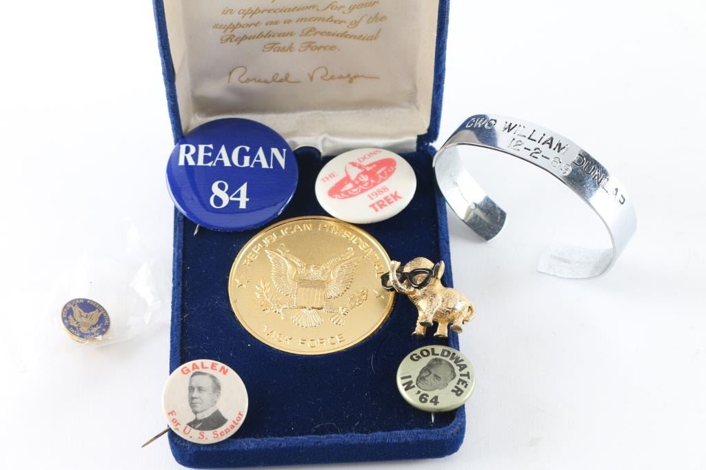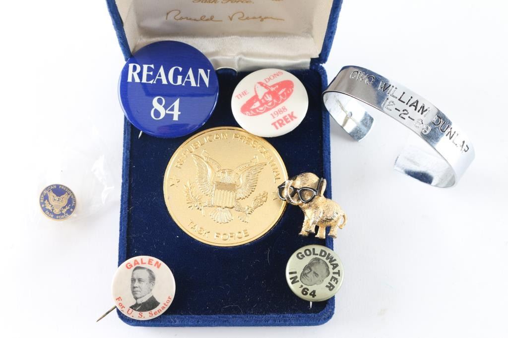 MIA cuff bracelet engraved CWO William Dunlap 12-2-69, Republican Presidential Task force mediallion in case, 5 Pins Reagan 84 ,Galem US Senater, Goldwater, and The Dons 1988 TRK pins.