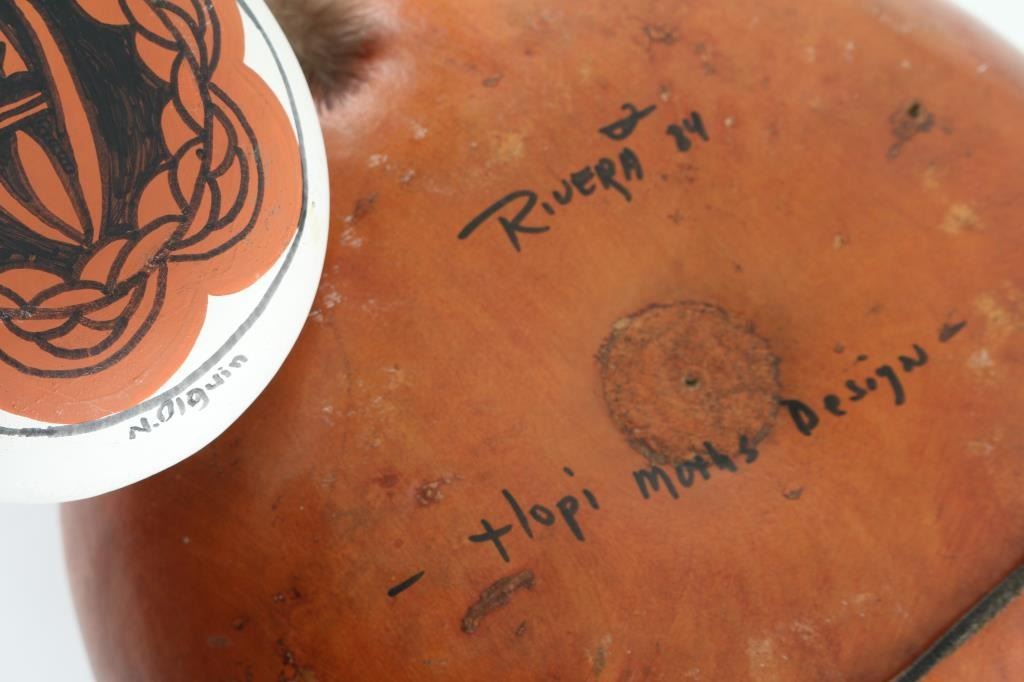 Hopi moth design, made by "Riveria" dated 1984, accent with small turquoise. Measures 12 inches in diameter, and polychrome canteen.