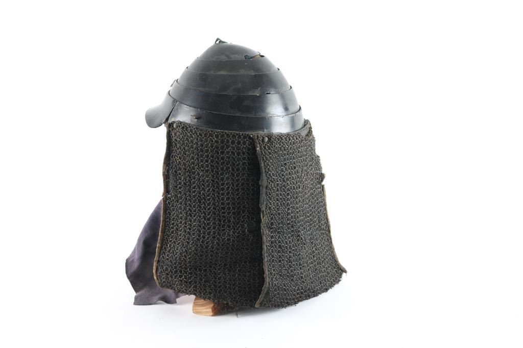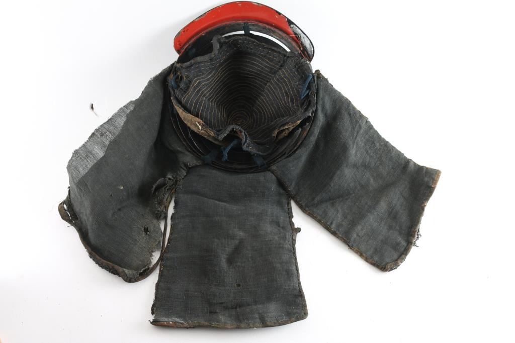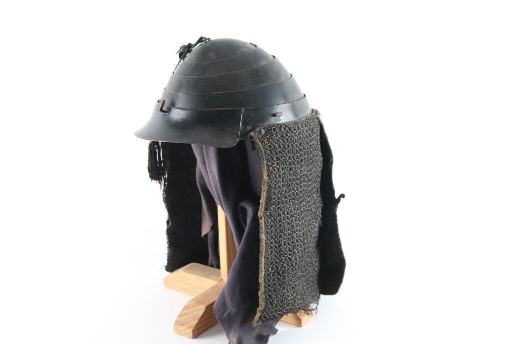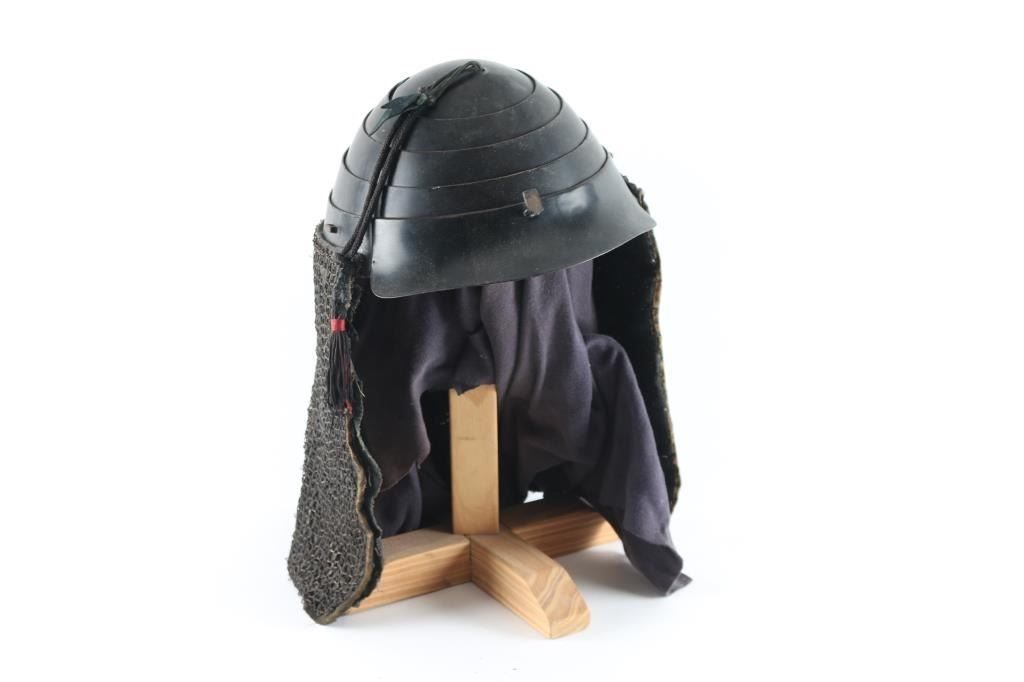 Black vermilion lacquered metal Cochin kabuto are a folding or collapsible style of helmet which was often worn by samurai and taisho with the Tatami Gusoku set of armor. The Cochin is a hachi kabuto which features four concentric rings. The rings collapse into themselves for flat storage and then can be raised up. These helmets were frequently worn by the famous “Takeda Clan” during the Azuchi-Momoyama era. Ornamental tassel in two holes on the crown. Mabisashi (Visor) has bracket for Maedate. Has the original liner. The Shikoro (Neck Protector) is three panels of cloth covered with chain mail, Has studs for the Fukigayeshi (Temple/ear protectors) Good condition. Comes with wooden stand.
