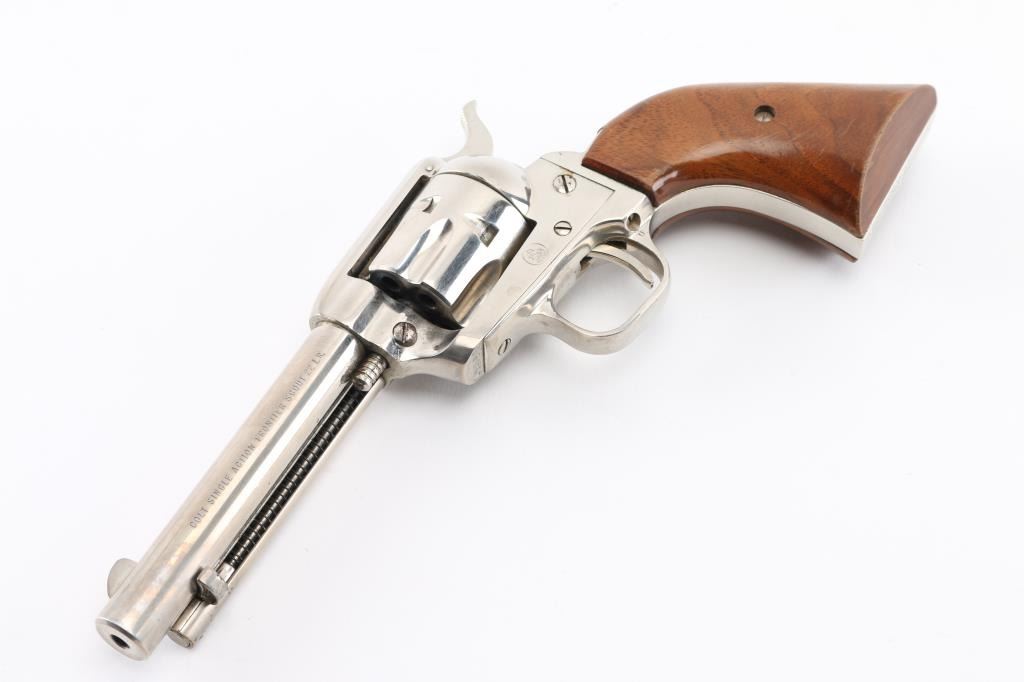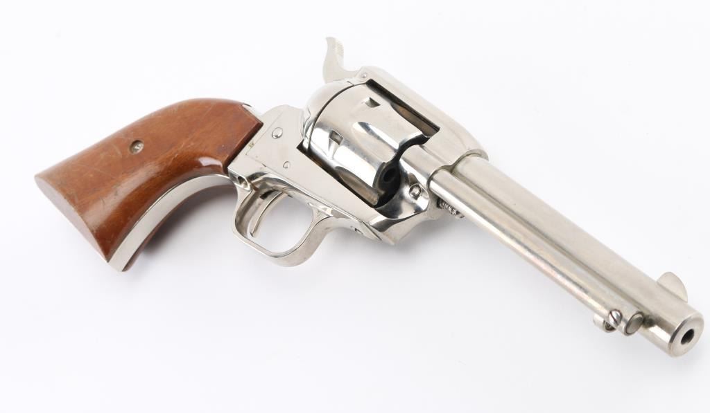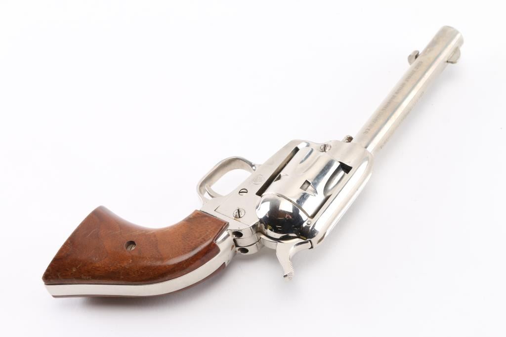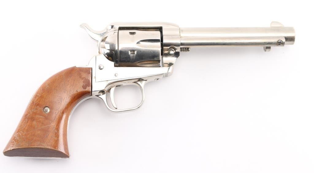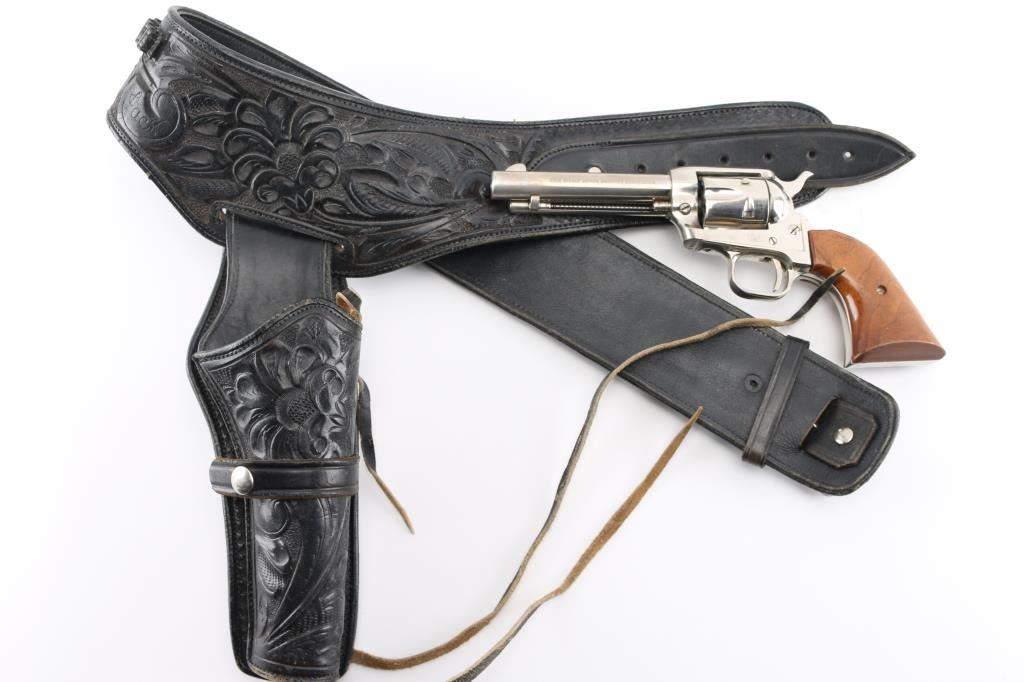 Western style single action rimfire revolver manufactured circa 1961. Scaled down copy of a Colt Single Action Army. Features nickel finish, smooth wood grips, 4.75" barrel, fixed sights, 6 shot fluted cylinder. Bore and charge holes are very good condition. Retains 80% nickel with muzzle wear, edge losses, handling marks. and some holster wear on the barrel. Grips are very good condition. Includes tooled black leather western style rig with 36 .22 cartridge loops. Belt is 36' in length. Condition is near NRA very good. C&R Firearm.
