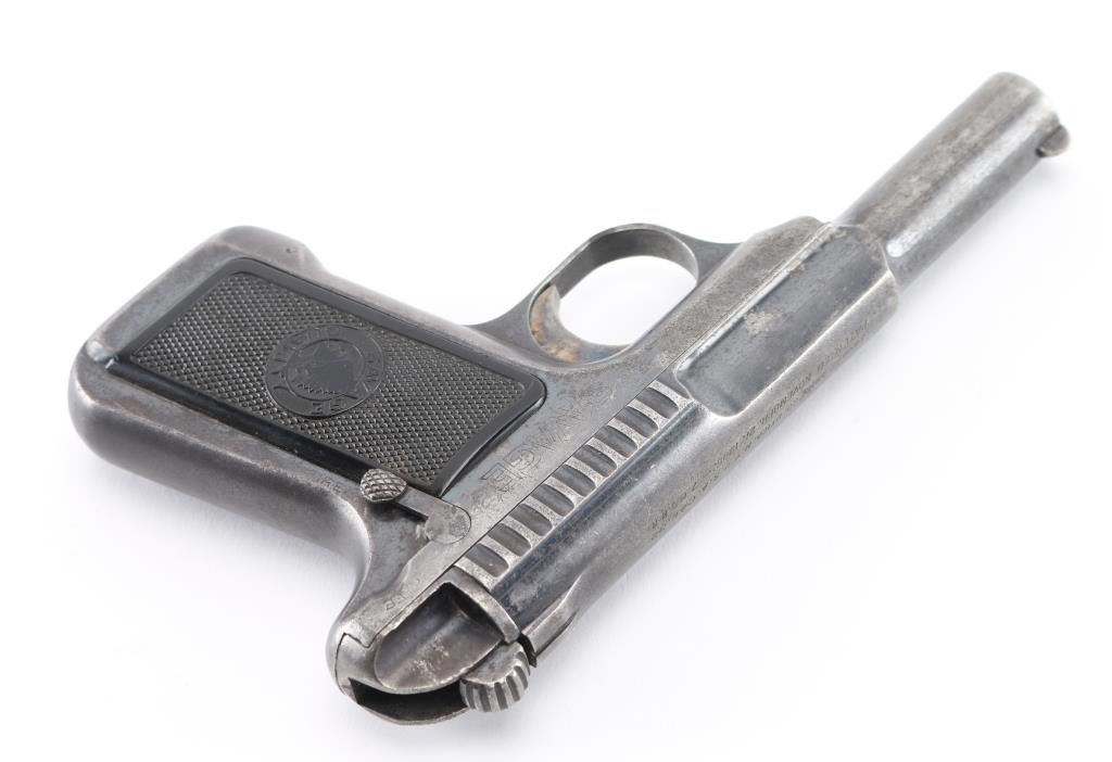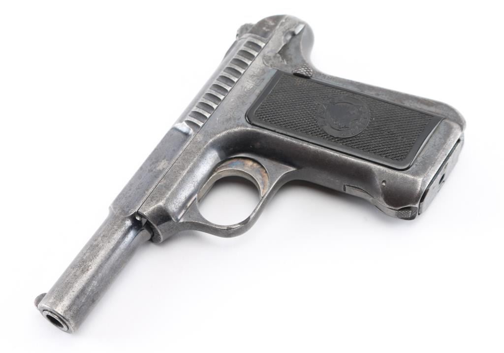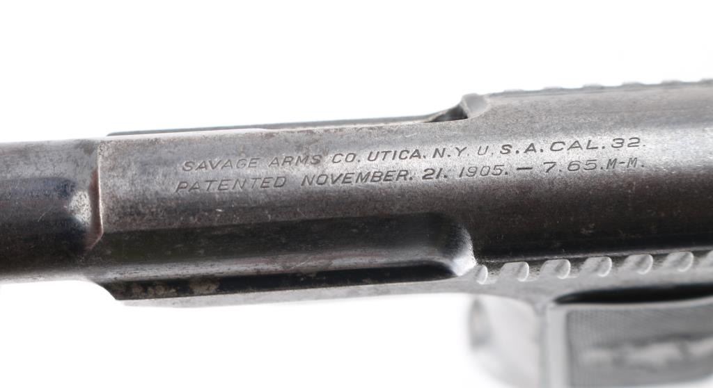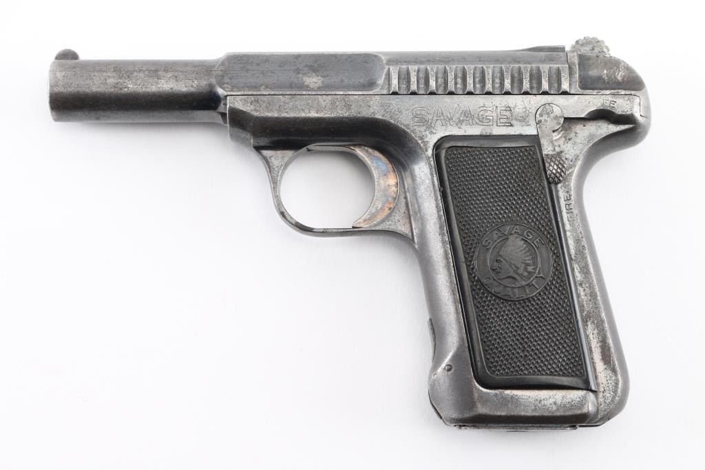 Vintage American made striker fired semi-automatic compact pistol manufactured circa 1914. Features blued finish, 3.75" barrel, fixed blade front sight, fixed rear sight, smooth trigger, serrated cocking lever, manual safety/slide catch on the left side of the frame, toe magazine release, 10 round magazine, steel frame and two-piece fancy checkered black synthetic grips with Savage insignias. Bore is fair to good, dark and lightly pitted throughout groves. Retains 50% finish, fading to gray or brown throughout, with edge losses some spots of pin-prick pitting. Grips are good condition, smoothed a bit from handling. Includes one magazine Condition is NRA Fair to Good. C&R Firearm.