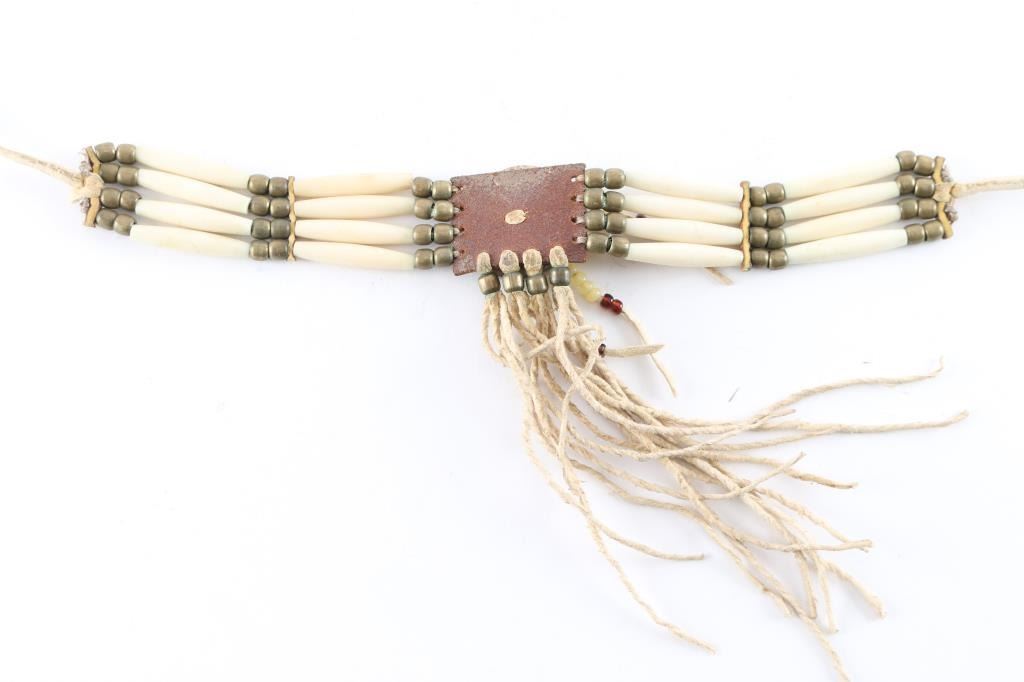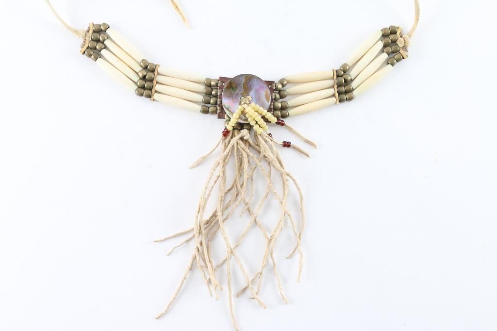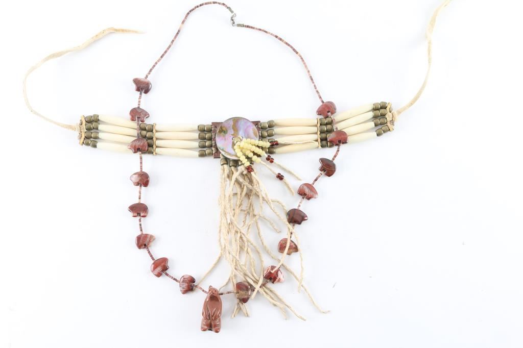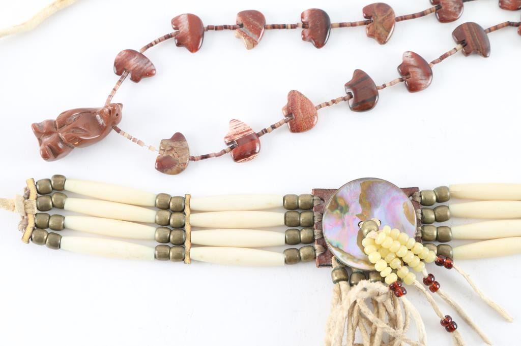 (1) Carnelian Bear Fetish Necklace wit small carved bears with heishi beads in between. (1) Bone Beaded Choker with center abalone bead.