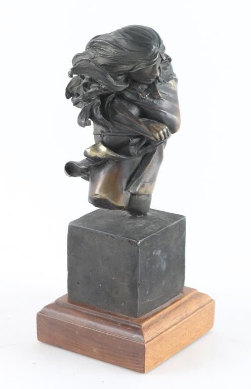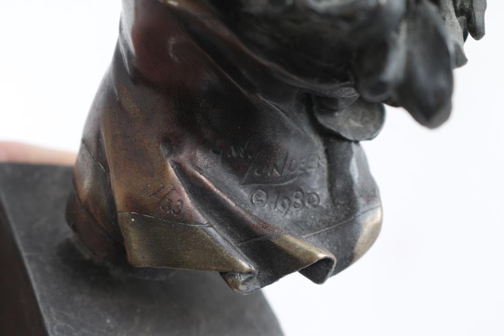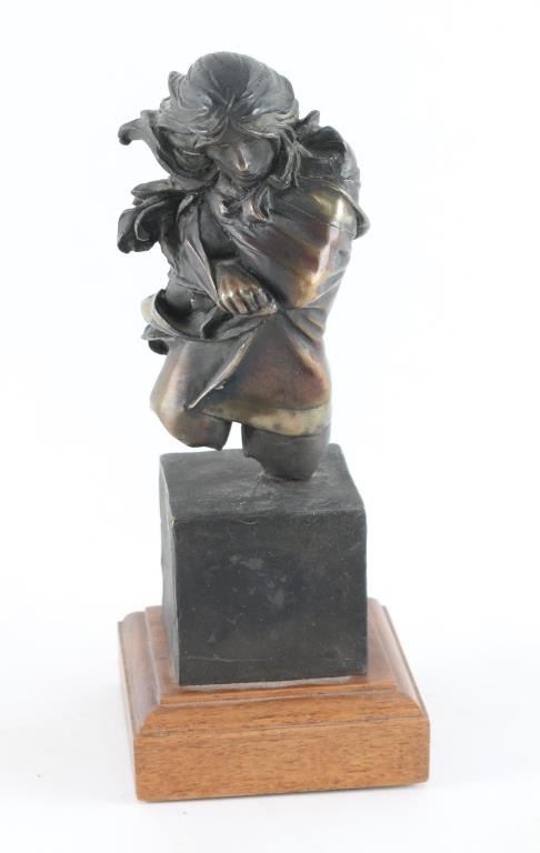 By artist "G.W Lundeen" dated 1980, signed on base. Mounted on bronze an wood, measures 7.5x3.Bio-Born in Holdrege, Nebraska, George Lundeen has become a nationally known sculptor of realistic figures. He achieved the status of full Academician of the National Academy of Design in New York, which is the highest professional recognition bestowed on visual arts in America. One of his best known pieces is the seated, life-size figure in bronze of Benjamin Franklin at the University of Pennsylvania campus in Philadelphia.