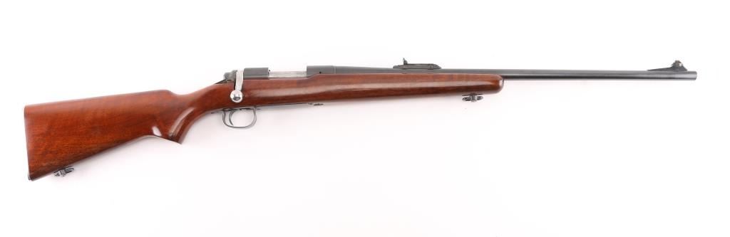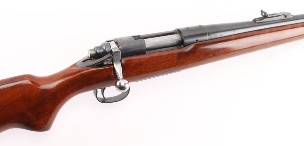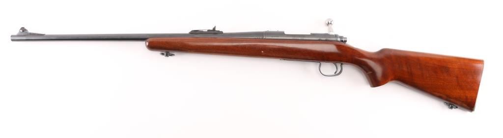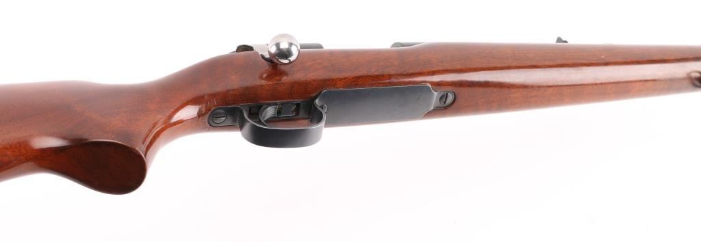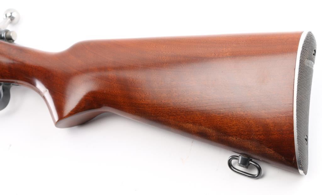 Bolt action rifle manufactured circa 1961, features blued finish, bright metal bolt, smooth walnut stock, checkered factory aluminum buttplate, sling swivels, 24" barrel, raised blade/bead front sight, adjustable notch rear sight, receiver drilled/tapped for optics, blind magazine, manual safety. Bolt release forward of the serrated trigger. Bore is excellent condition. Retains 99% blue. Wood is excellent. NRA Condition-Excellent. C&R Firearm.