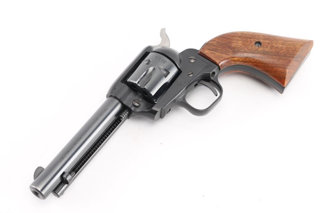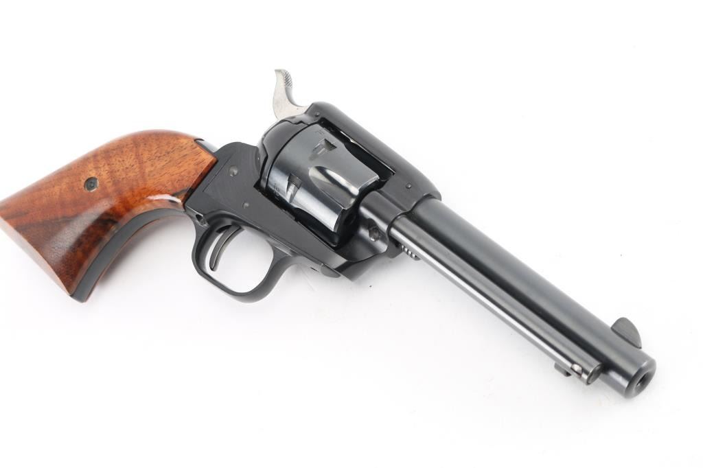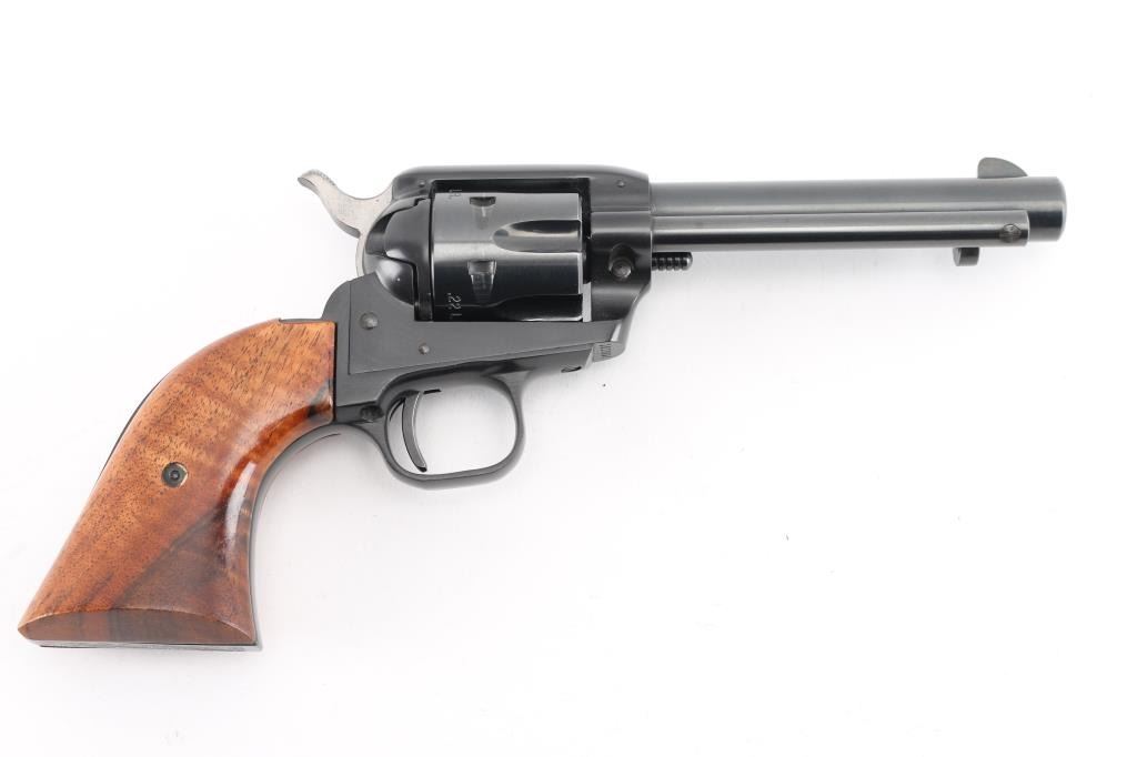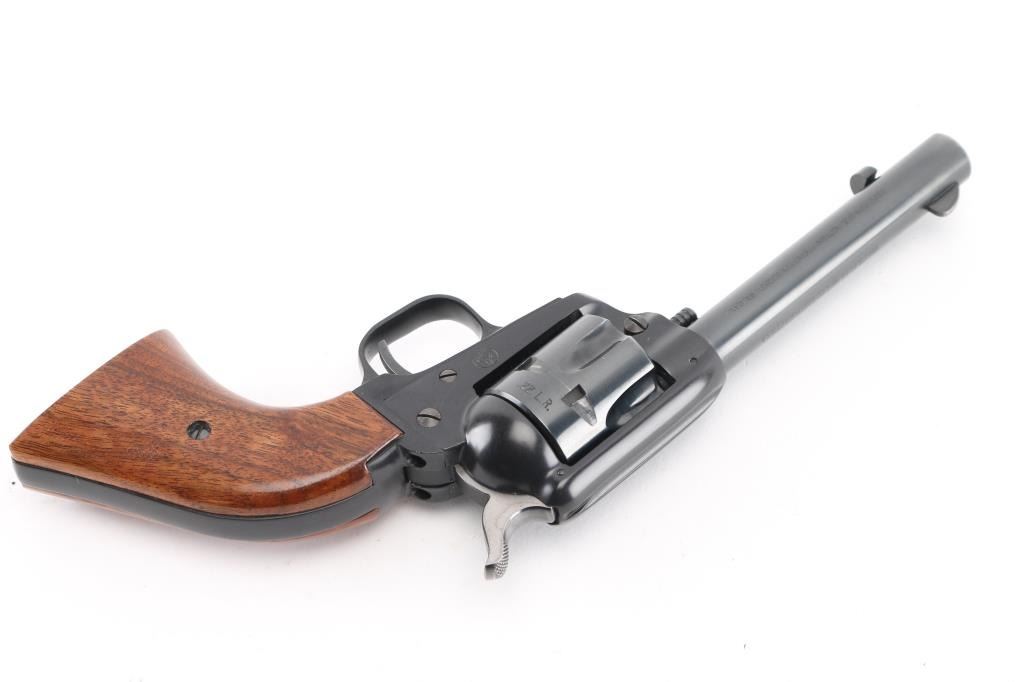 Western style single action rimfire revolver manufactured circa 1965. Scaled down copy of a Colt Single Action Army. Features blued finish, smooth wood grips, 4.75" barrel, fixed sights, 6 shot fluted cylinder. Bore and charge holes are excellent condition. Retains 98% original blue with very slight muzzle wear, and very faint tracking on the cylinder. Grips are very good condition. Action is smooth/tight. Condition is NRA Excellent. C&R Firearm.