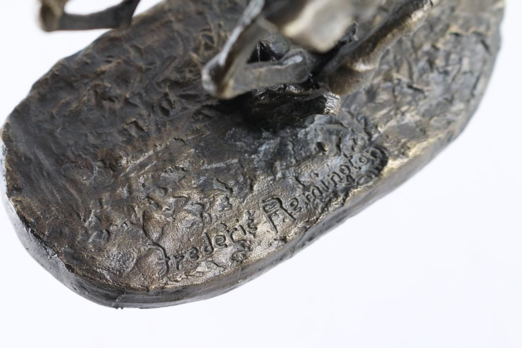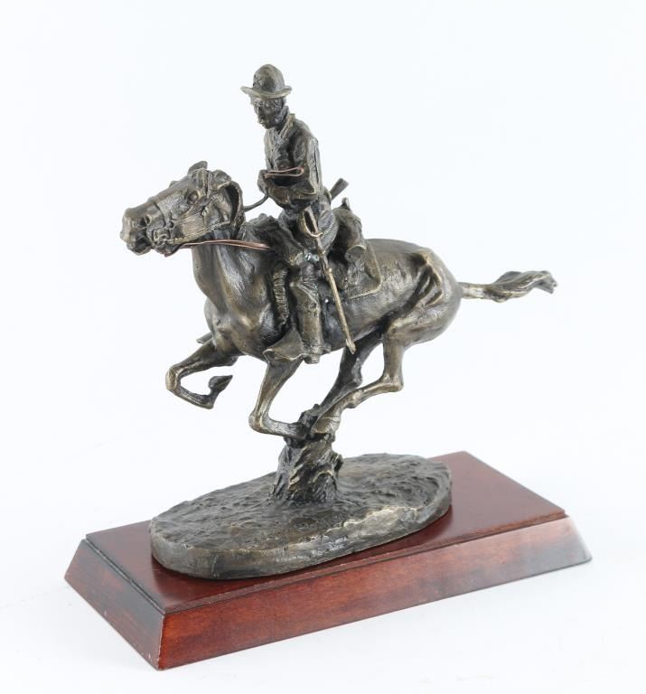 By artist Frederic Remington entitled "Trooper Of The Plains" from the Franklin mint mass produced and crafted in 1988. Measures 7.5x4" and signed on base. Also includes wood base for display.