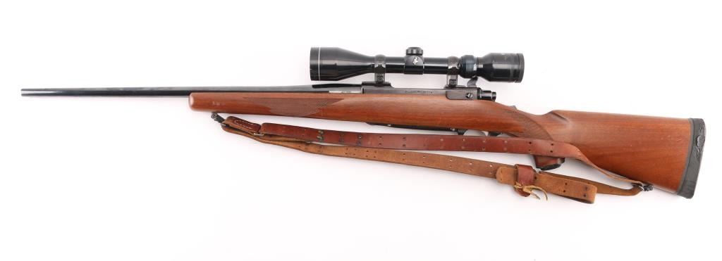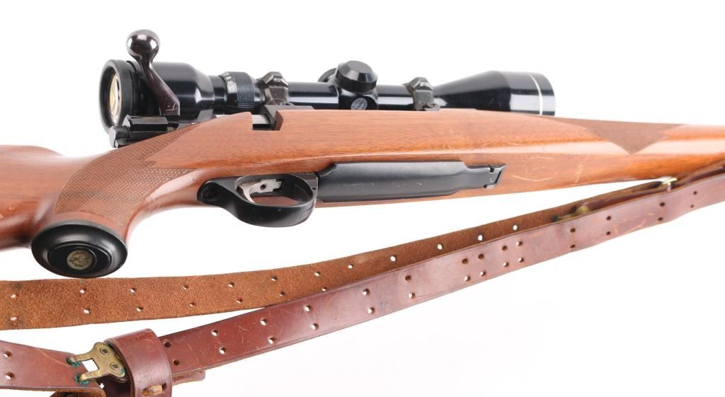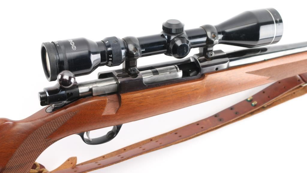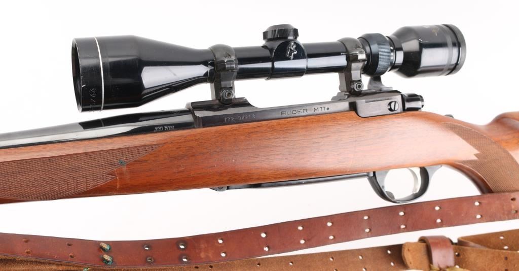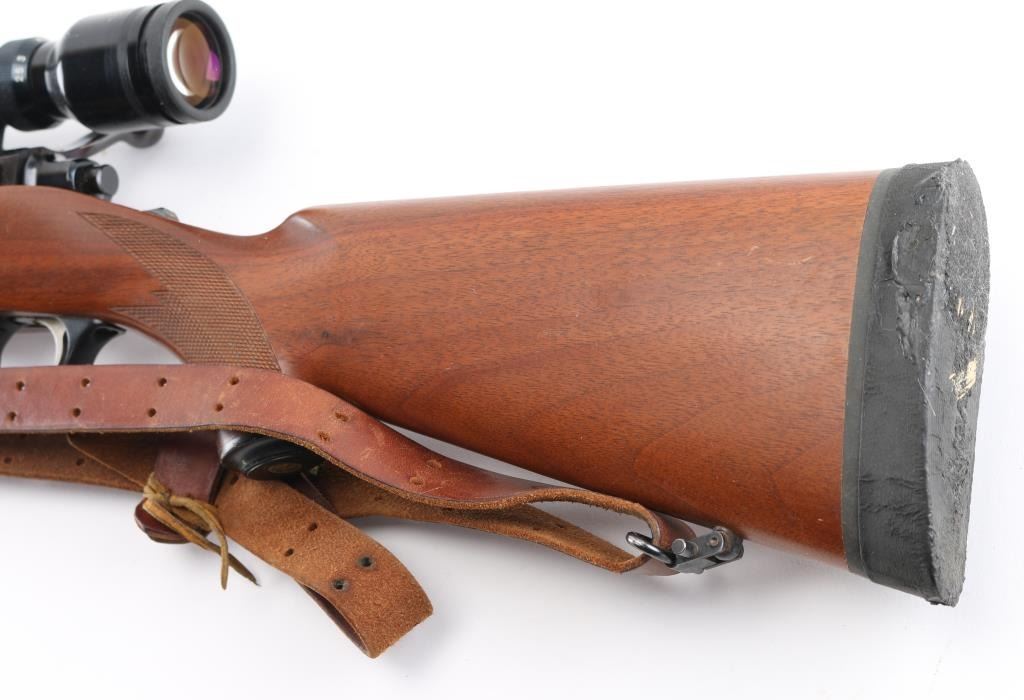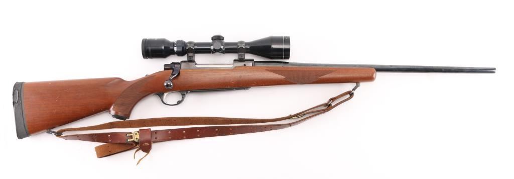 Bolt action rifle features blued finish, wood stock with checkered panels at forend & curved wrist, no cheekpiece, factory solid rubber recoil pad, Ruger grip cap, 22" barrel, no sights, scalloped dovetails on receiver with 1" rings & Tasco 2.5X10 scope, clear optics, hinged floorplate, manual tang safety. Bore is excellent/bright. Blue finish is about 95% with minor scratches, and a couple of larger scratches on the floorplate. Action is crisp/tight. Wood is very good overall with minor scratches, with some larger scratches in the underside of the forearm. NRA Condition-Good to Very Good. Modern firearm.
