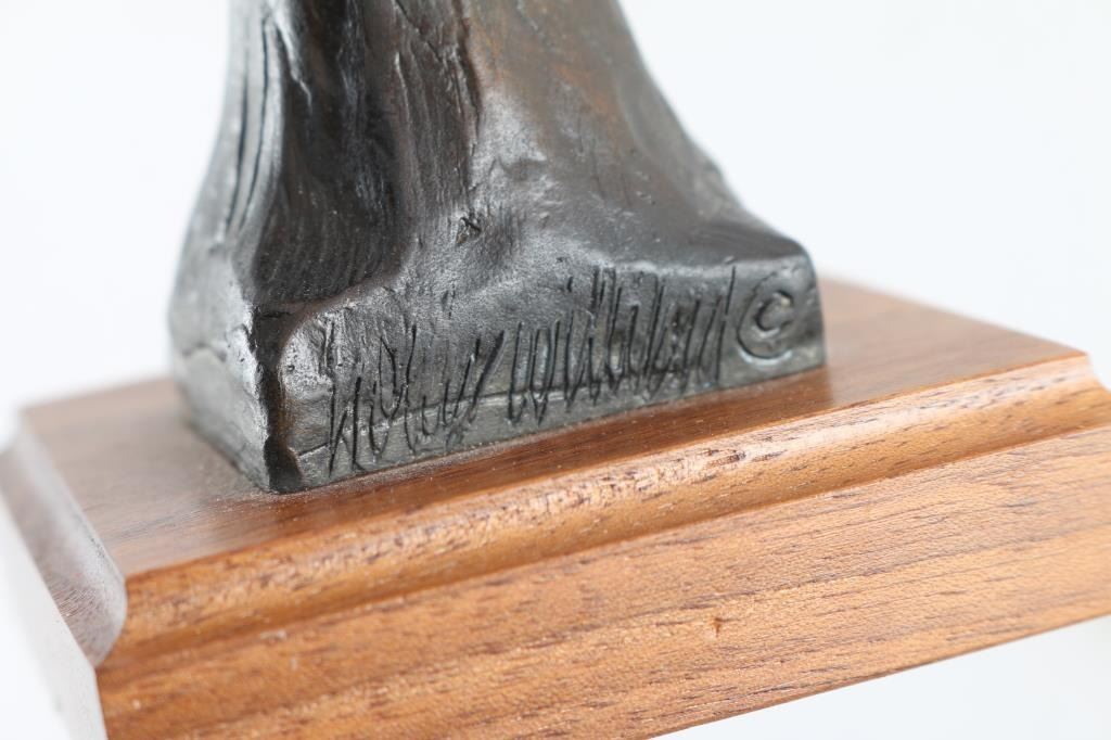 By artist "Hollis Willford" signed and numbered on bronze base 166/170. Mounted on wood base, measures 7"x4" depicting indian chief. In good condition, perfect size for desk decoration.