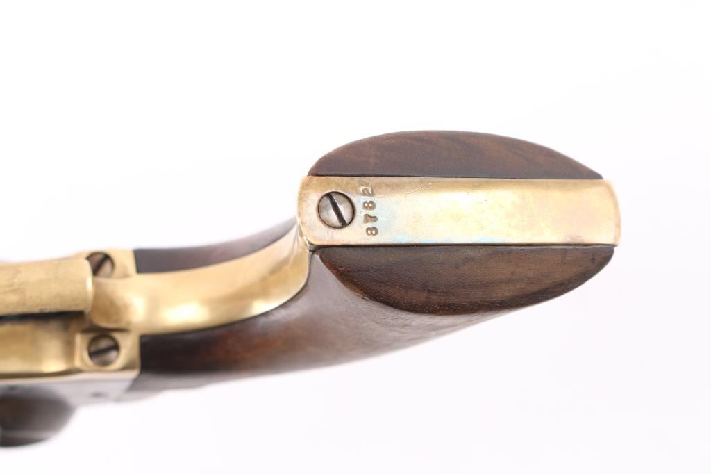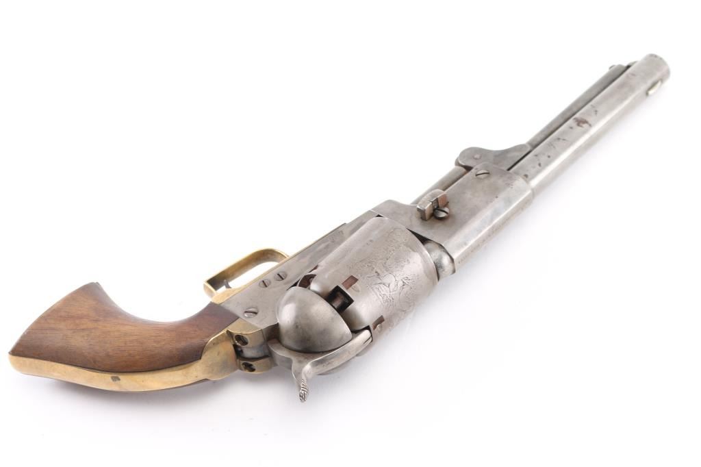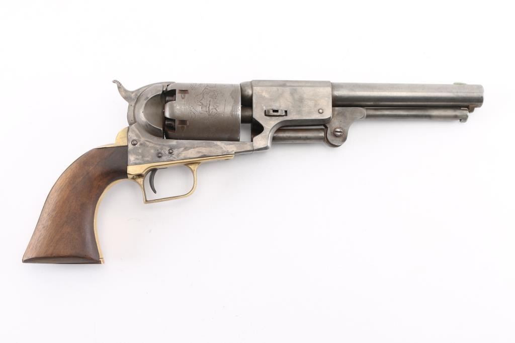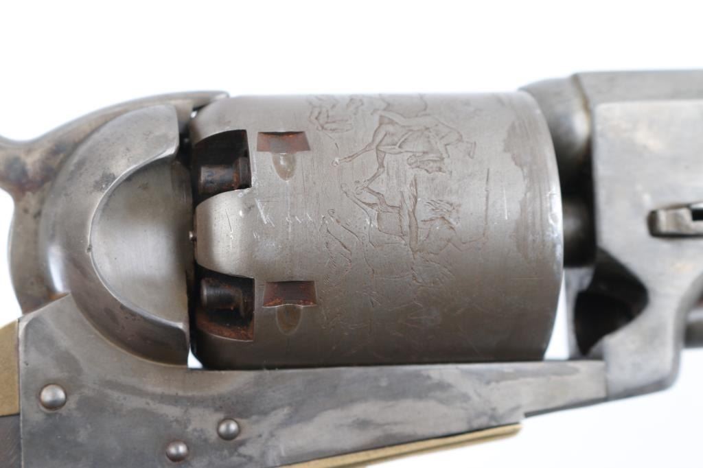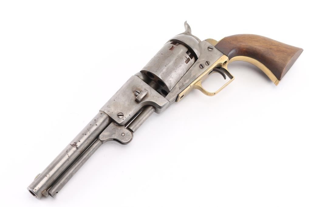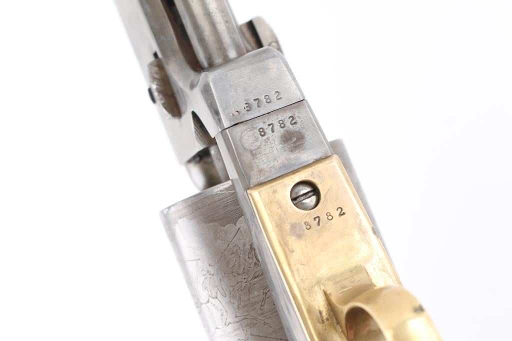 This is a Dragoon revolver (Possibly a Colt 2nd gen, or an Italian copy) that has been artificially aged, and renumbered to give it the appearance of an antique. U.S. 2nd Model Colt Dragoon Revolver Serial Number 8782 For 1850, 7 1/2" barrel, .44 caliber. All the markings are very strong including the cylinder fight scene, no "U.S." on frame. All numbers match including the cylinder, barrel, frame. triggerguard, back strap and loading lever. Action works well. case color present on under side of hammer spur, and blue on top of the trigger. Bore is very good, grips are fine. Great for re enactors. Condition is NRA Very Good. Antique Firearm.